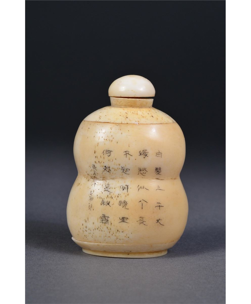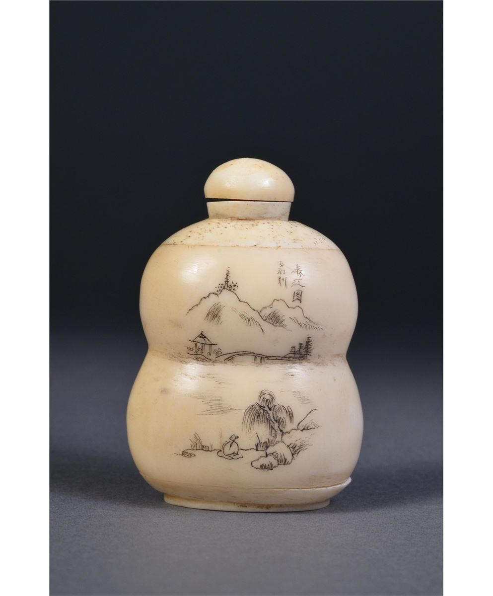Chinese ivory snuff bottle; double gourd form; the front with Incised design and painted landscape scene; on verso, incised calligraphy; matching stopper; H: 5.75 cm, W: 3.75 cm, 59 grams.