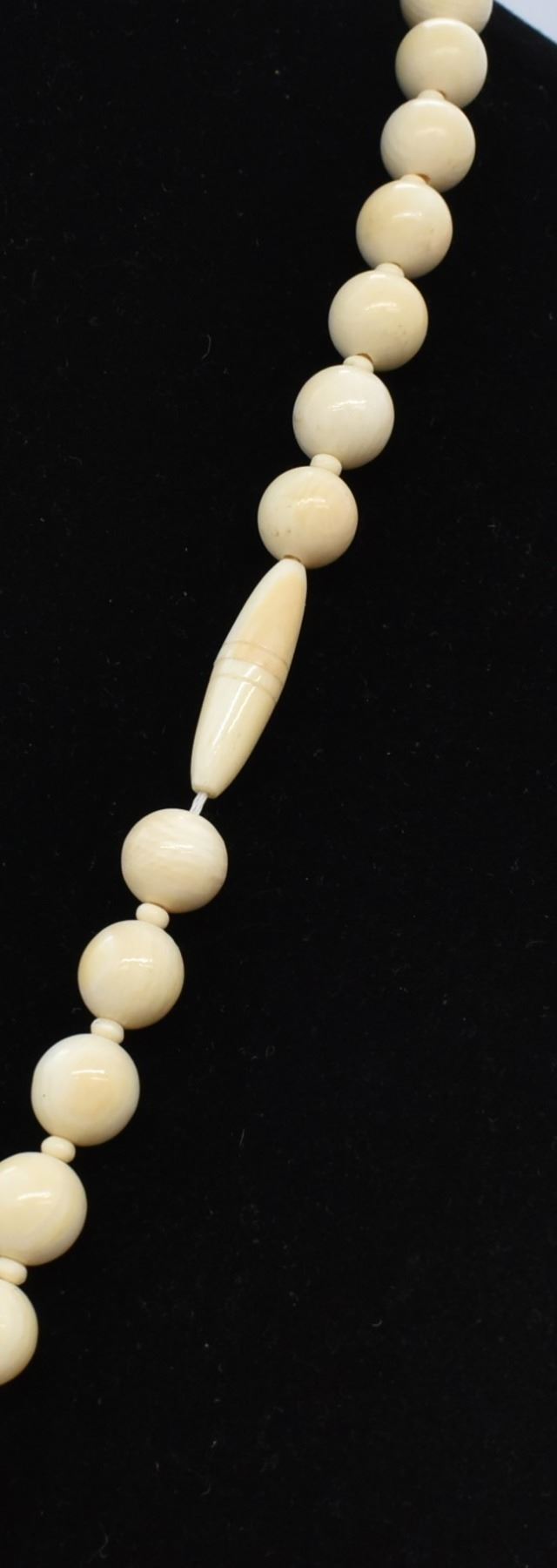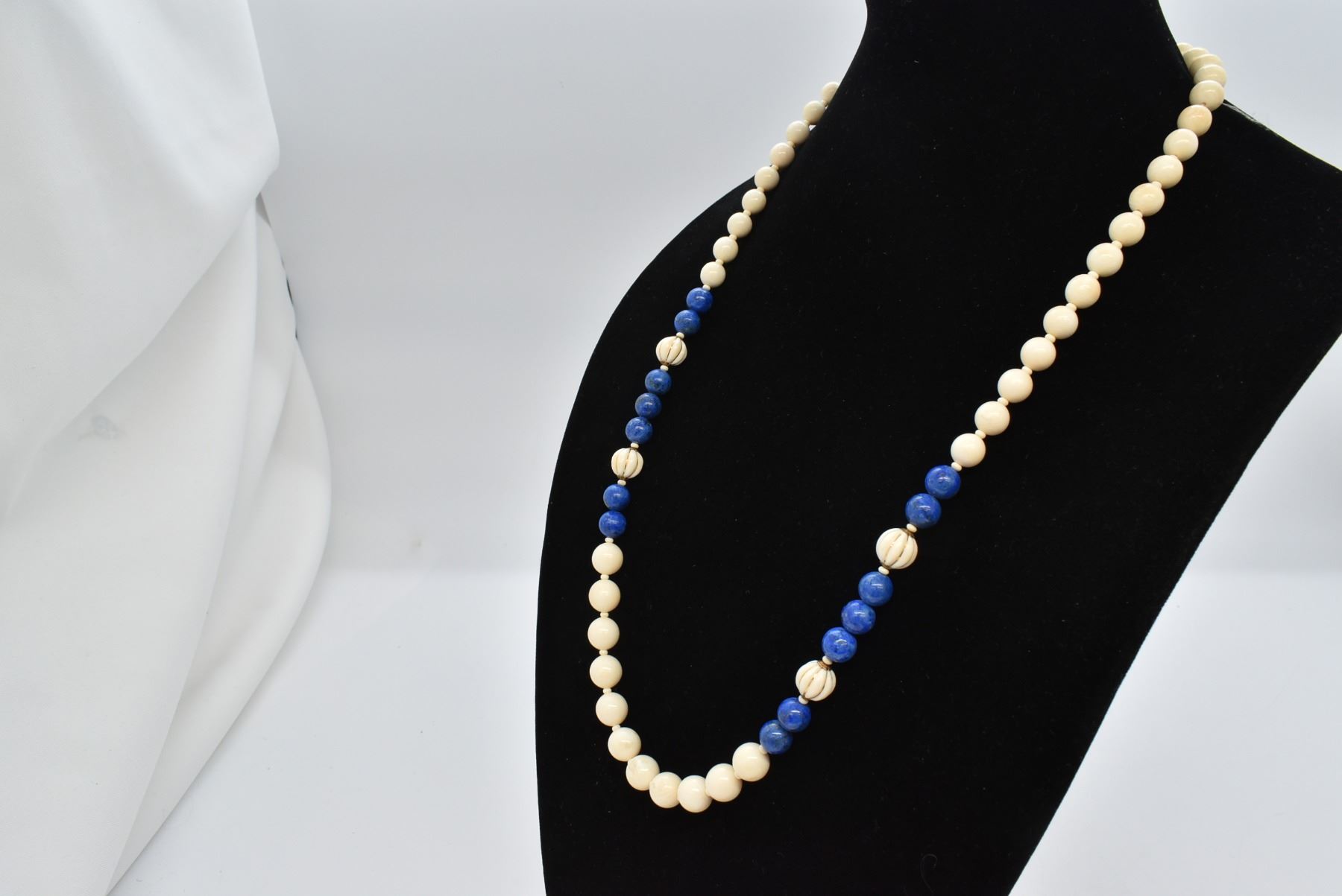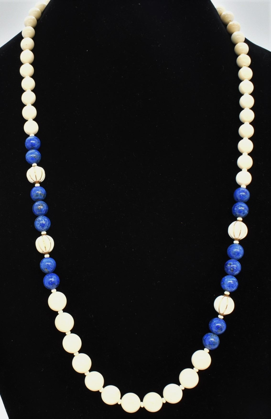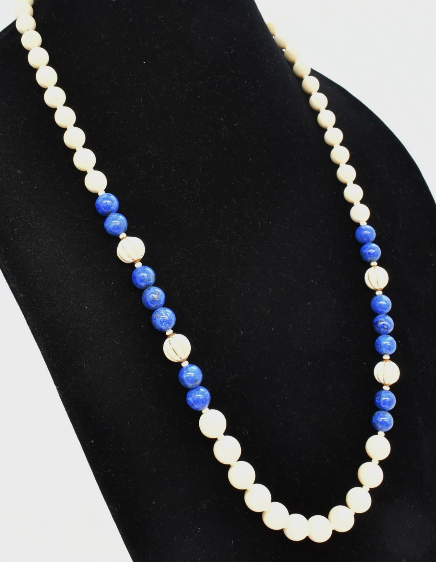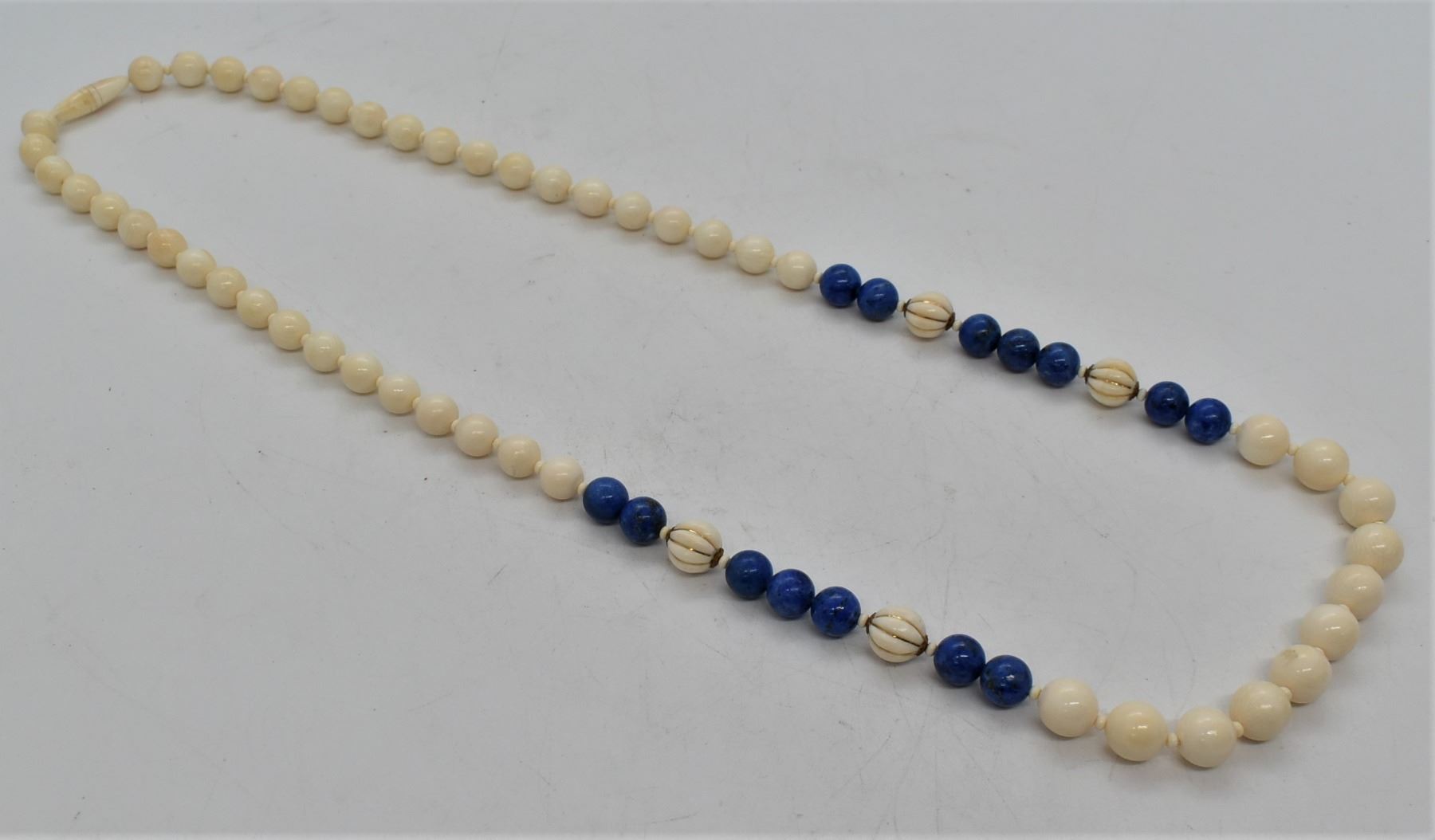 Chinese Ivory and Lapis Bead Necklace, measures 29''L end to end, beads measure 3/8''D, includes ivory, lapis, and gold gilt ivory melon beads, small ivory bead spacers, total gram wt. of 74.8