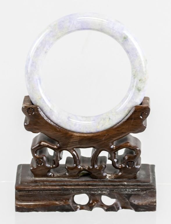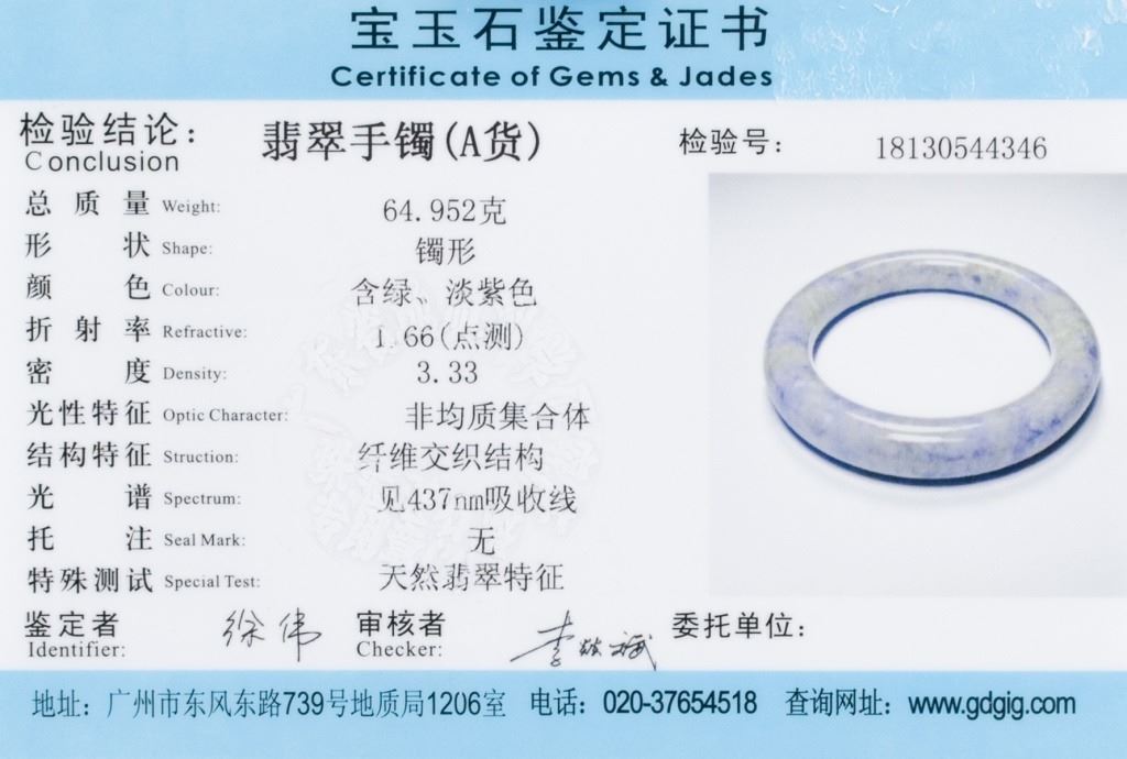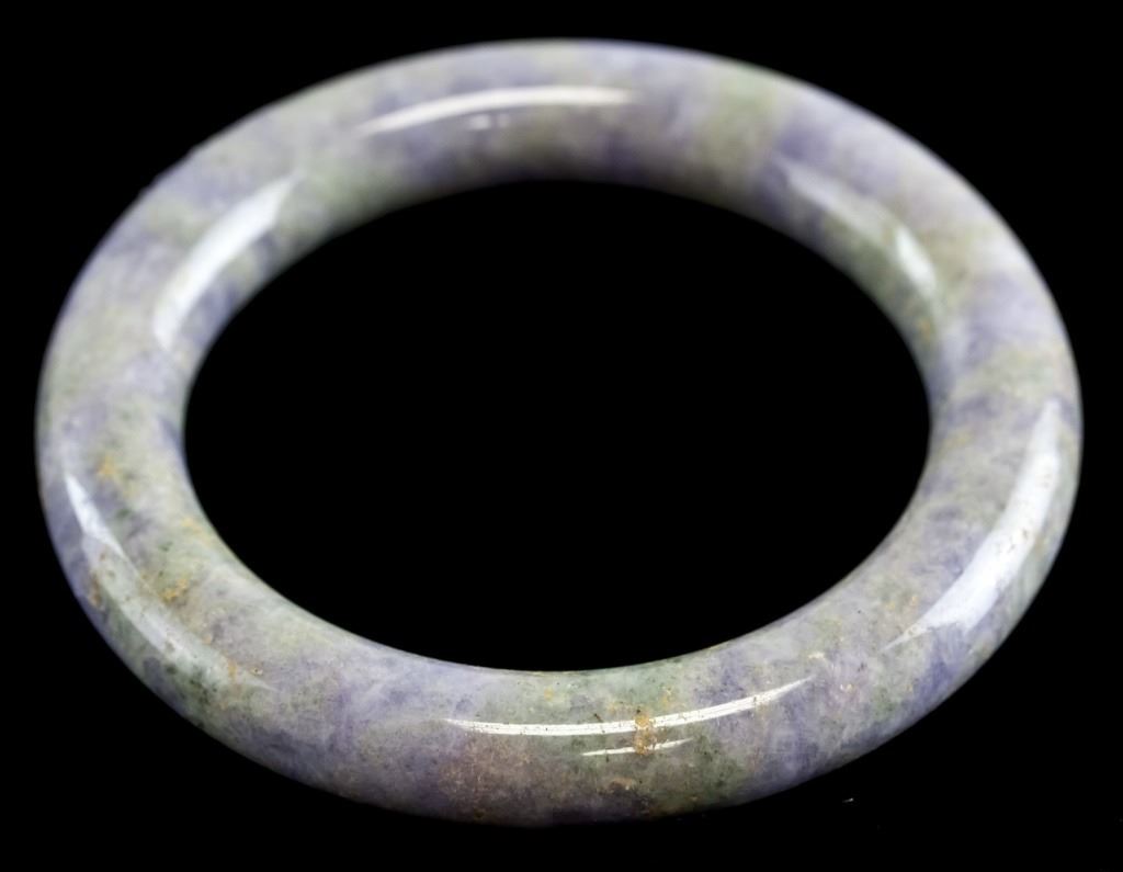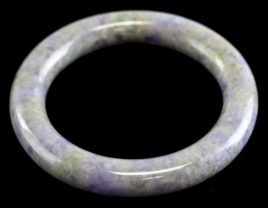 Chinese jade carved bangle. Of lavendar tone speckled with green. Of rounded inside and outside. Accompanied with certificate. Inner diameter: 5.5 cm. Outer diameter: 8 cm. 64.92 grams. Density: 3.33.