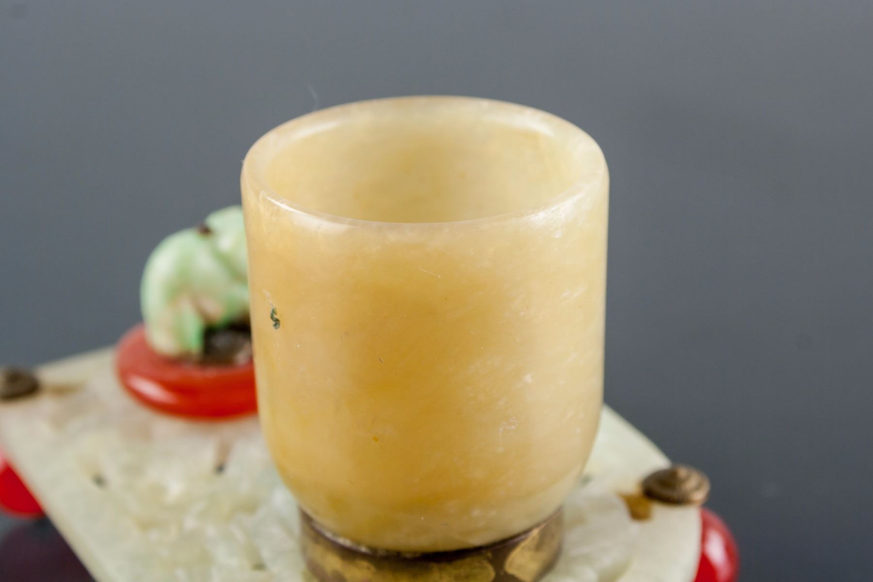 Chinese jade carved brush wash; Pendant; of one cylinder form brush wash on a plate supported by four red beads; connected by metal hardware; with one green jadeite carved elephant on red stone disk; plate with open work carving decoration; 5 cm x 8 cm, 78 grams