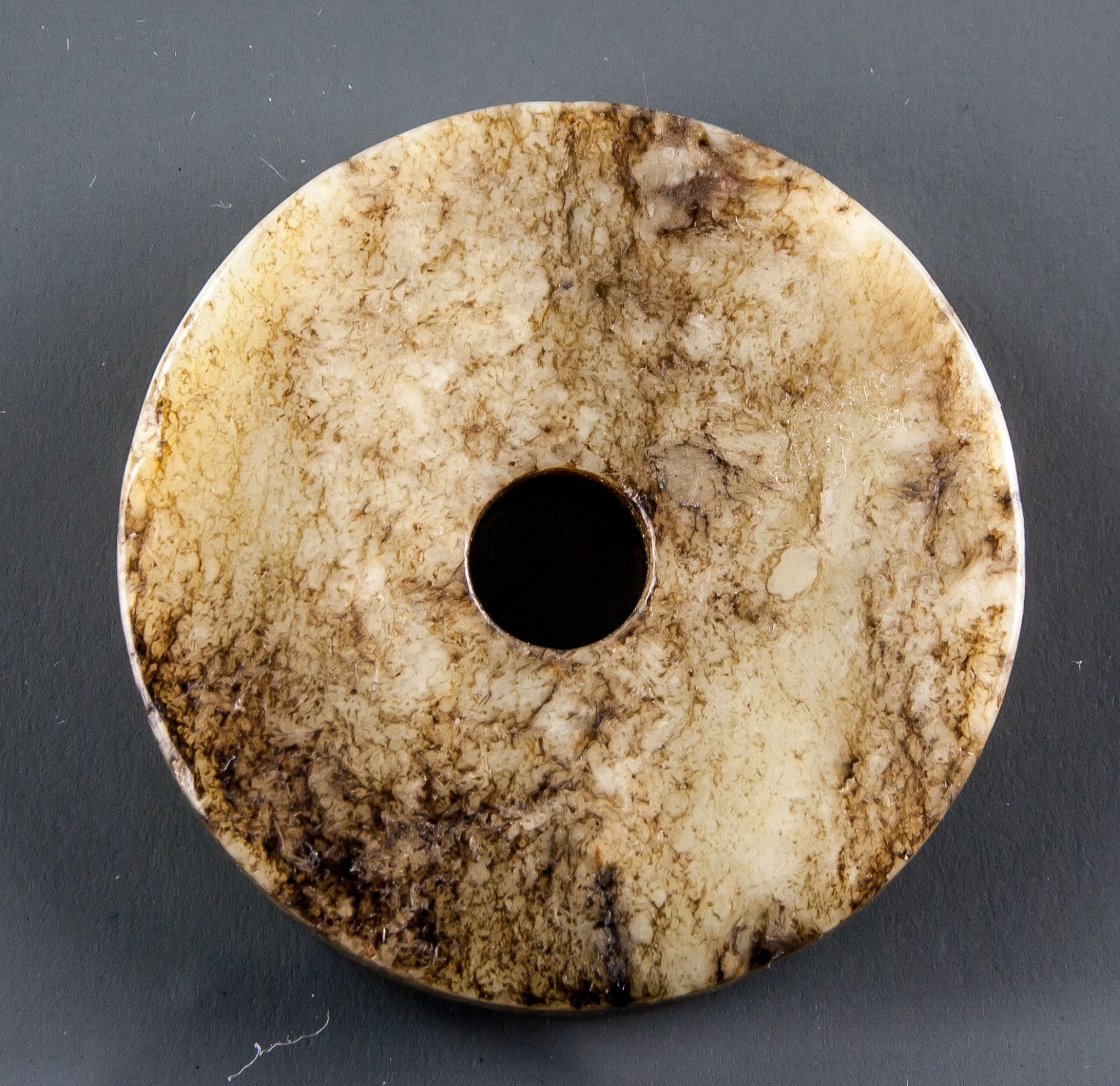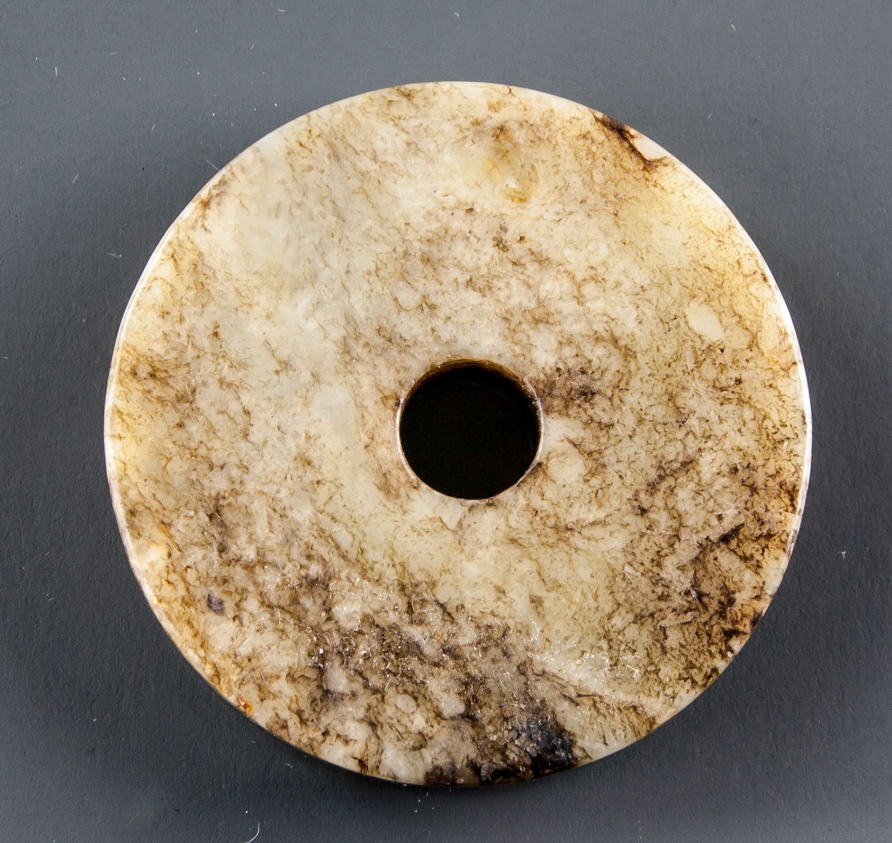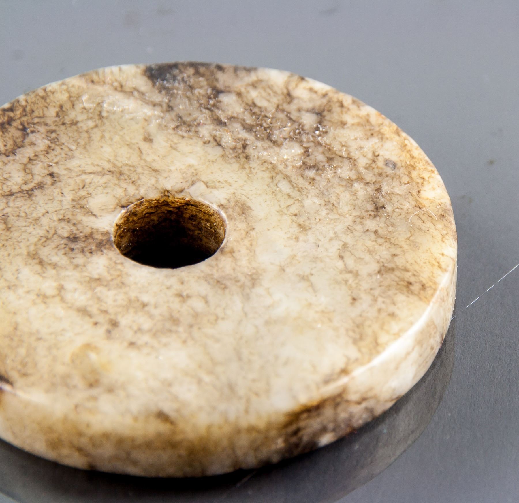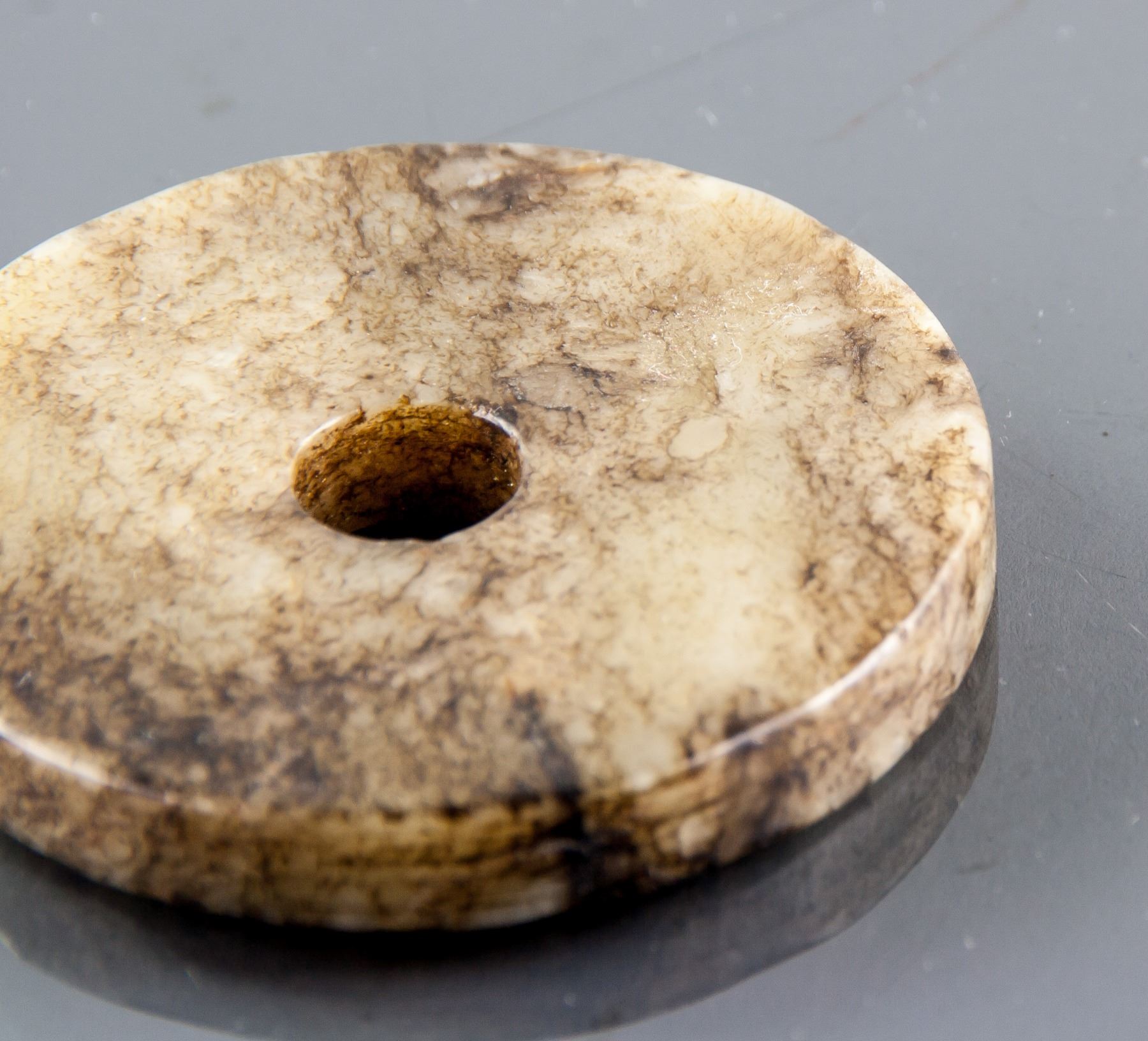 Chinese jade pendant, of round shape with a hold in middle, of light brown tone, D: 5.7 cm, T: 0.7 cm, 54 grams, Density: 2.94