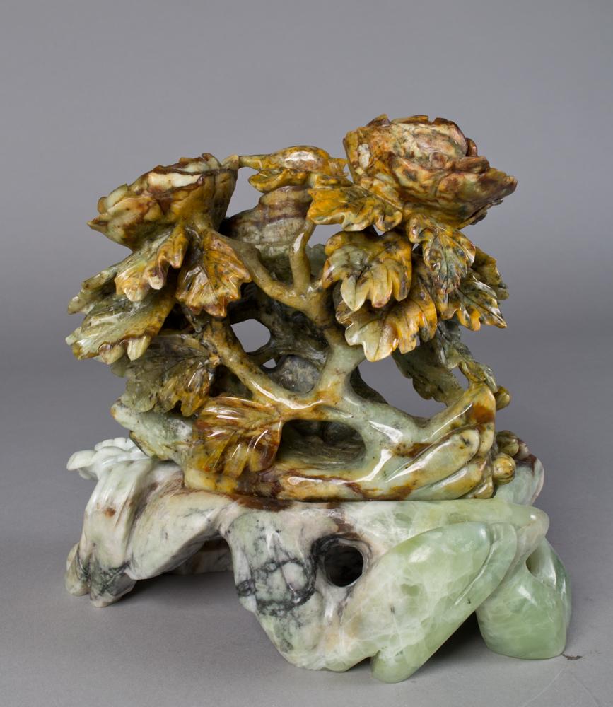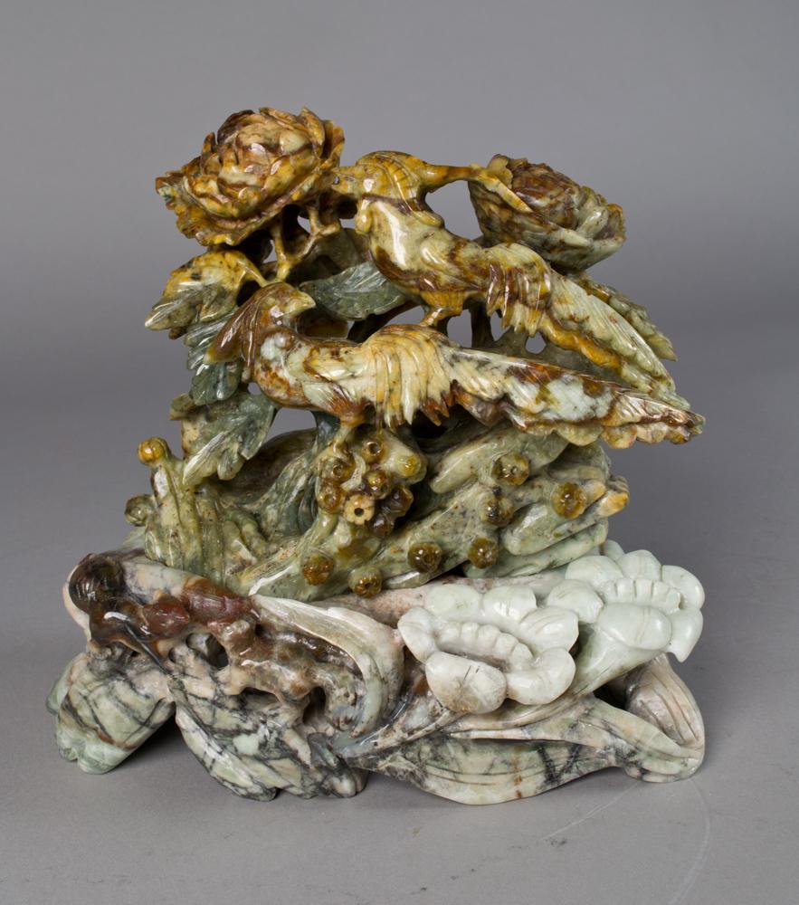 Finely carved to depict two birds with apple blossom tree with carved jade base with blossom and lingzi, 13.5"H X 9"W including the stand circa 20th century.