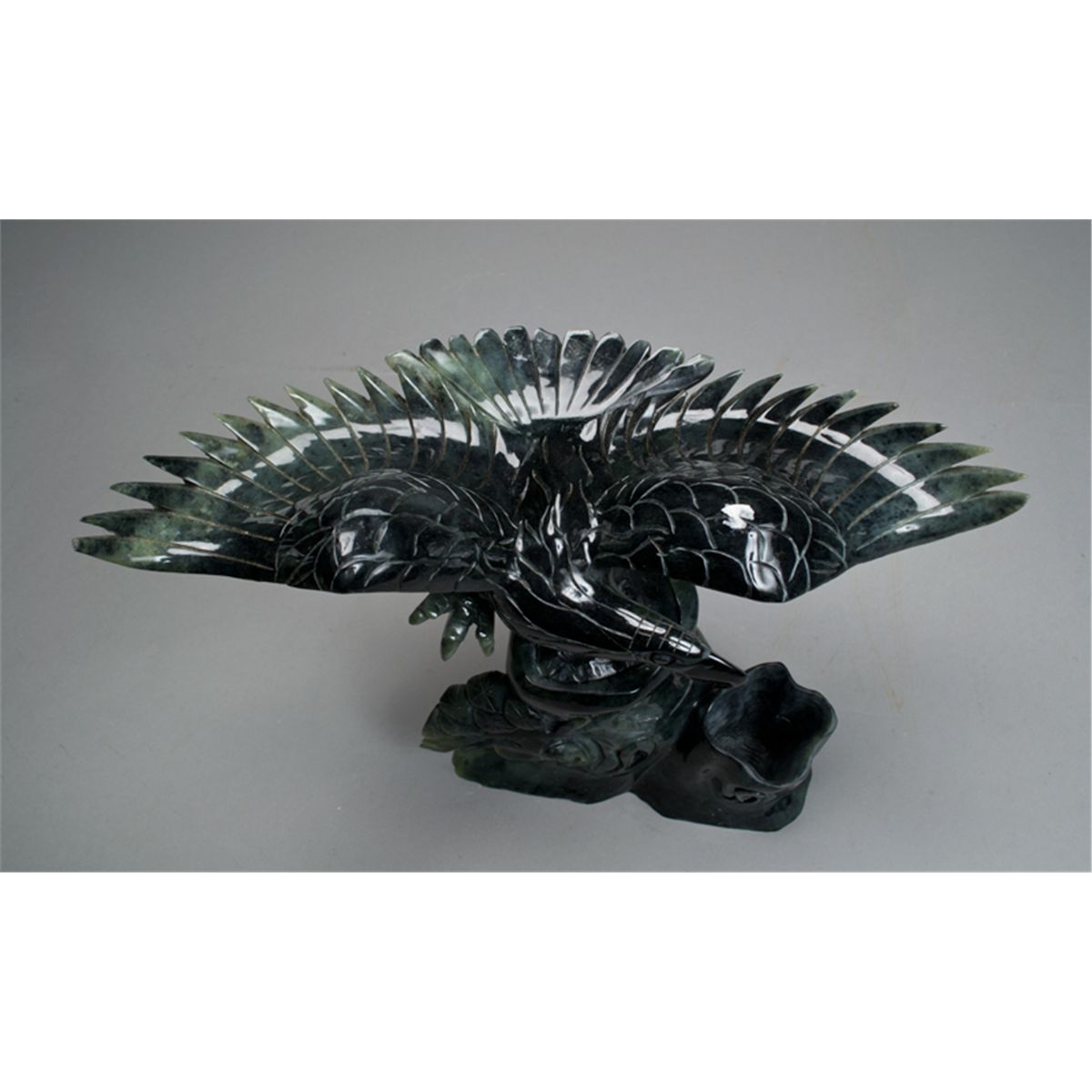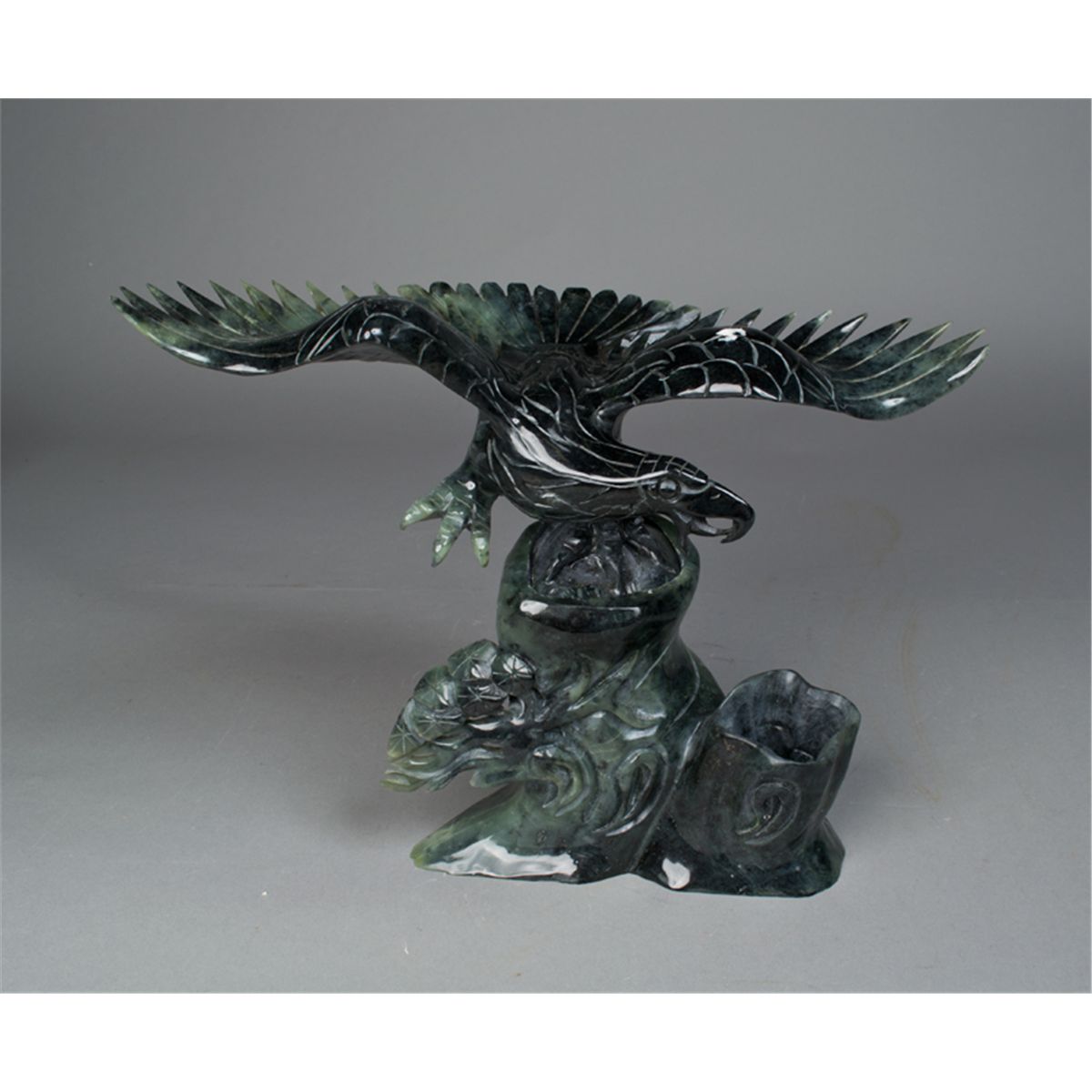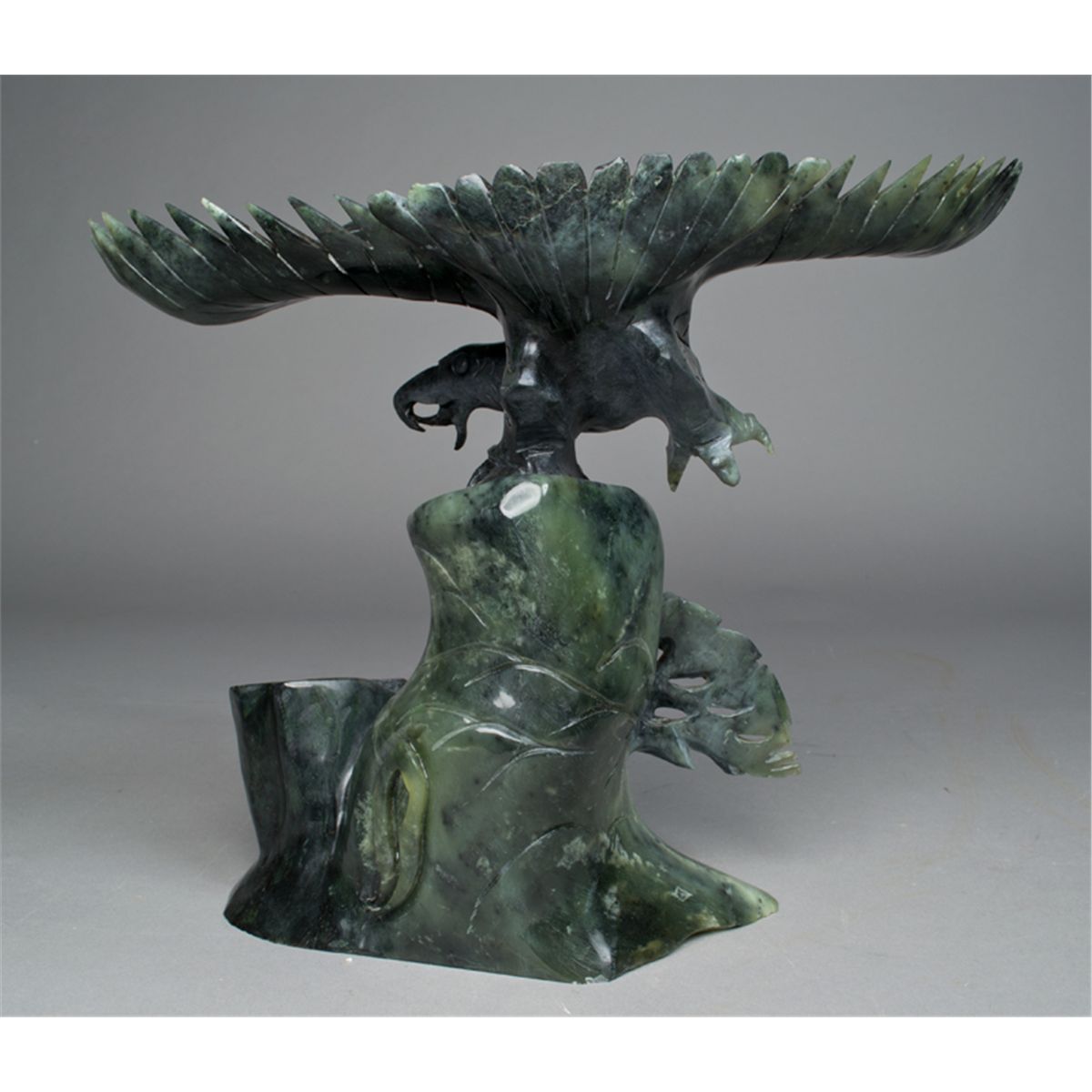 Finely carved to depict an eagle with spread wings, on a custom stand depicting a stump with brush holder to side. 11.25" H x 14" W, circa 20th century. Two small chips on left wing. Private collection Glennie, MI.