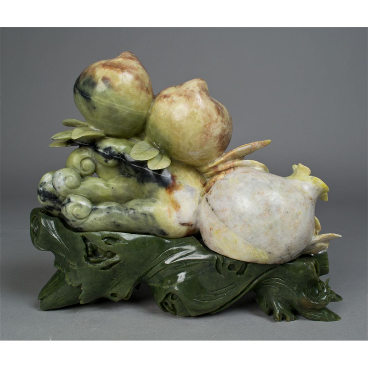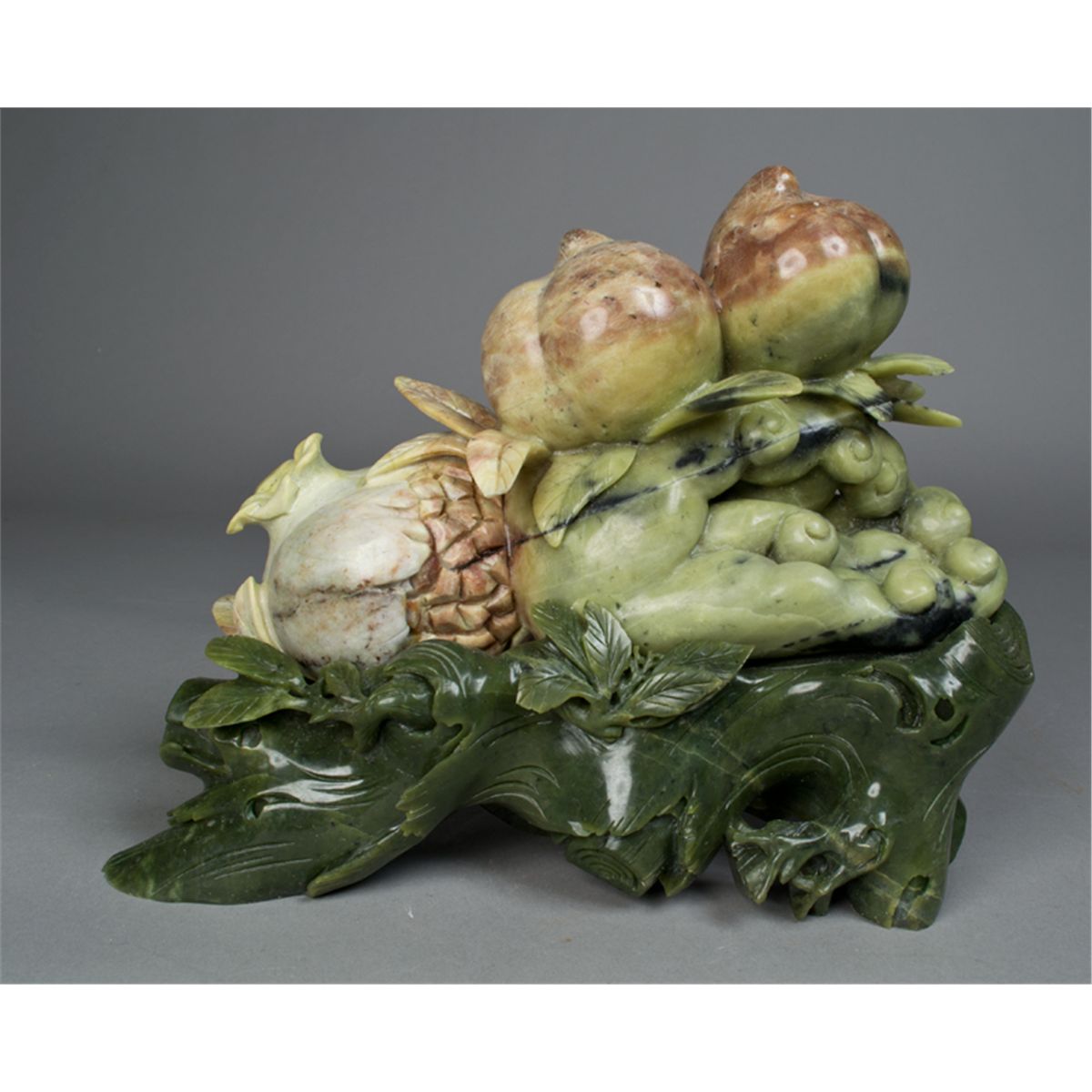 Finely carved to depict Buddha's hand with peaches and fruit atop, with custom carved jade stand with leaf designs. 10" H x 12" W, overall. Circa 20th century. Private collection Glennie, MI.