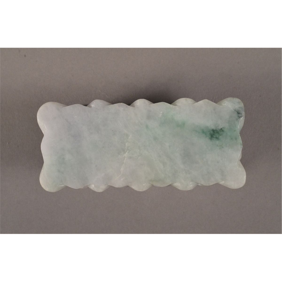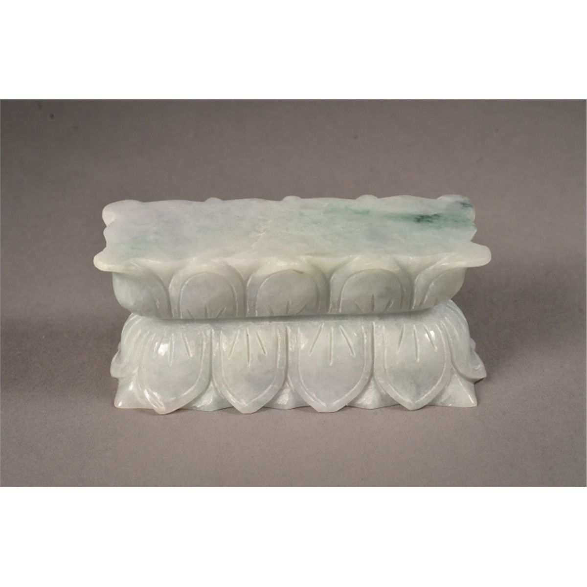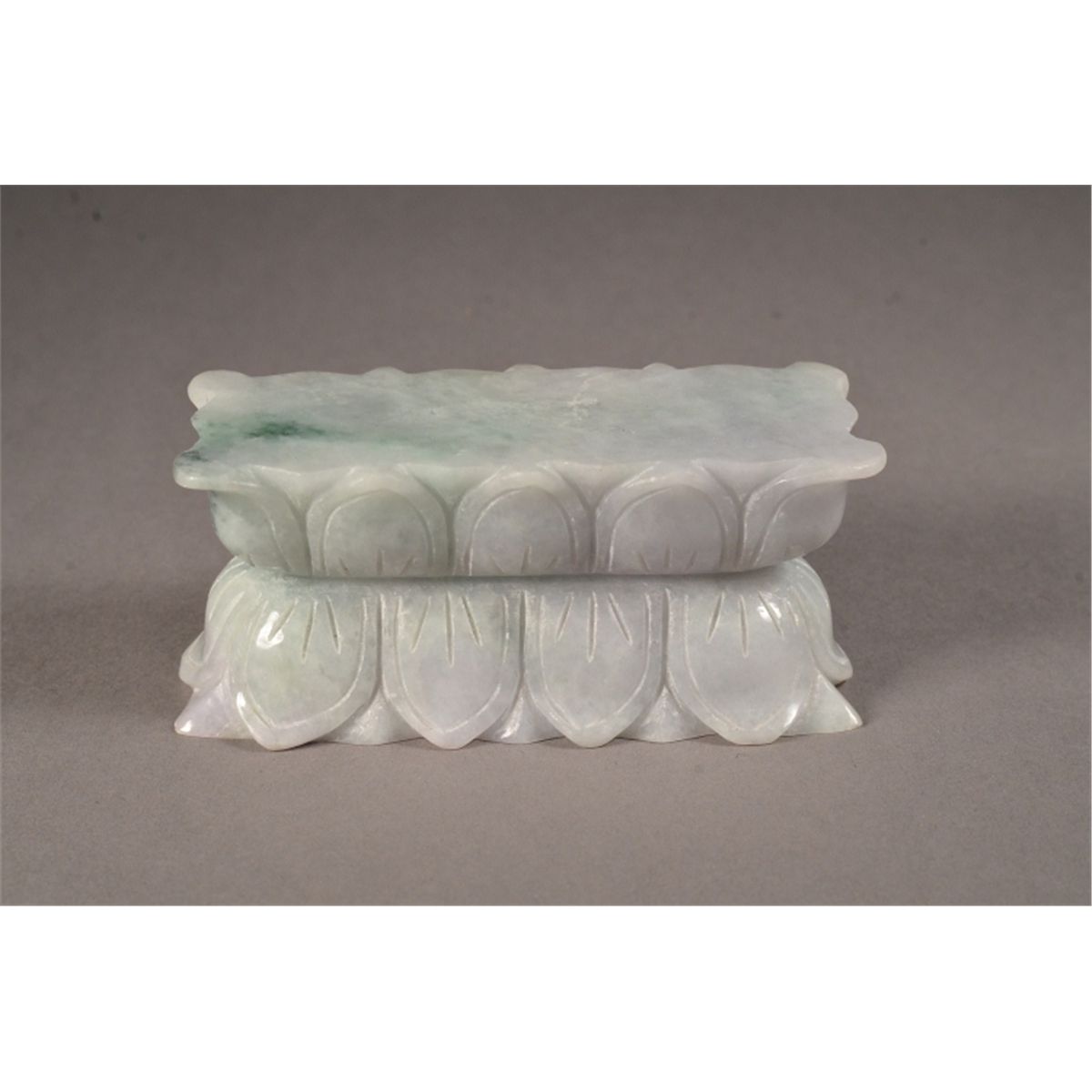Chinese carved jade pedestal; in form of double lotus design; with light green suffusion; 3 1/2" long, 1 1/2" wide, 1 1/2" tall, 303 grams