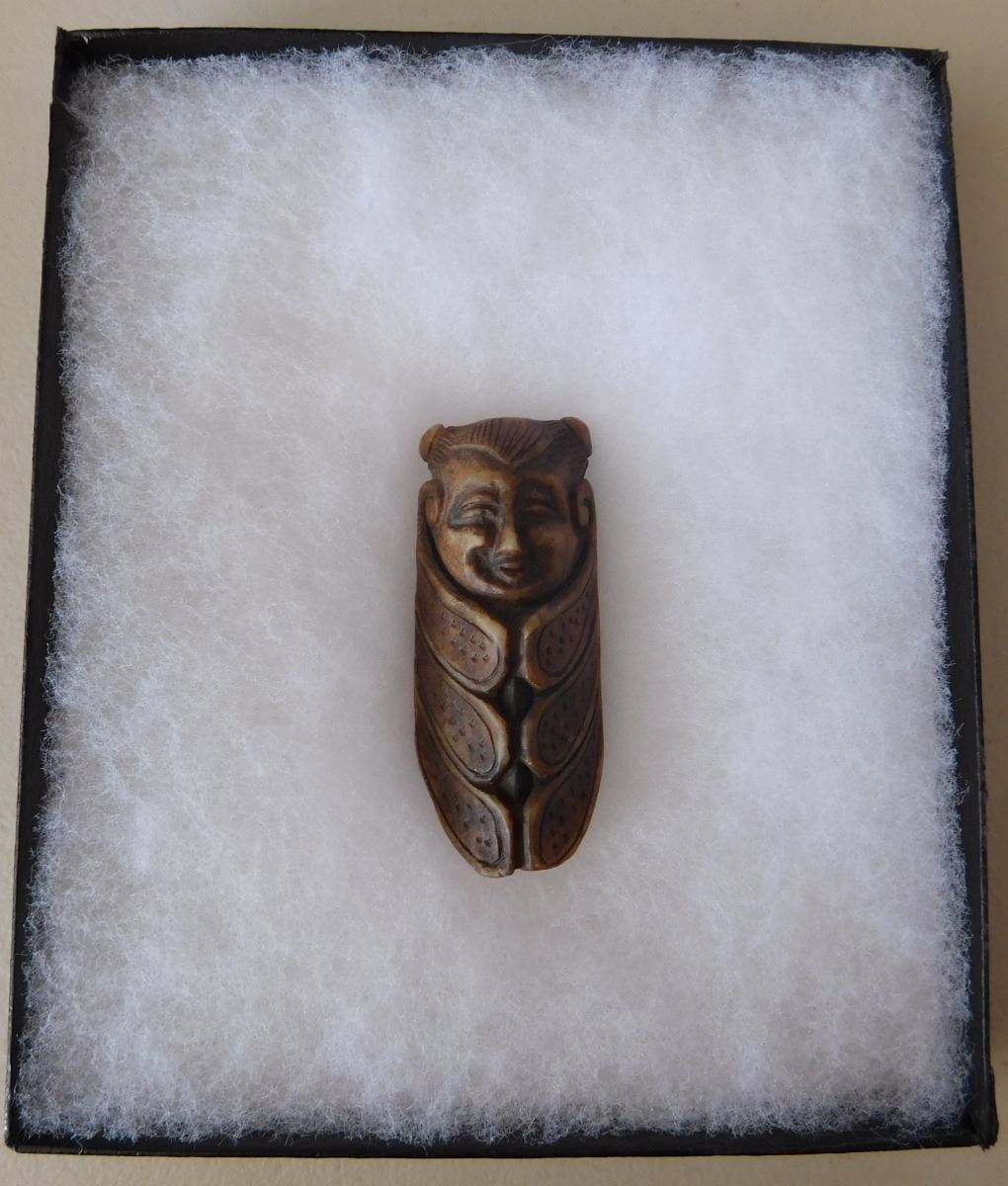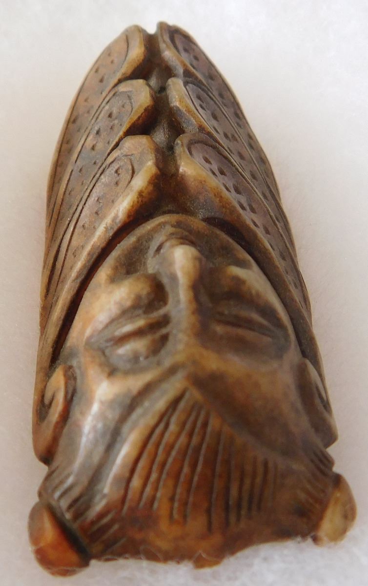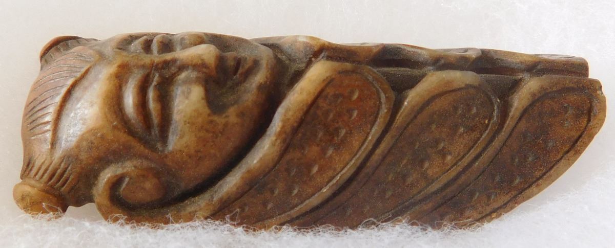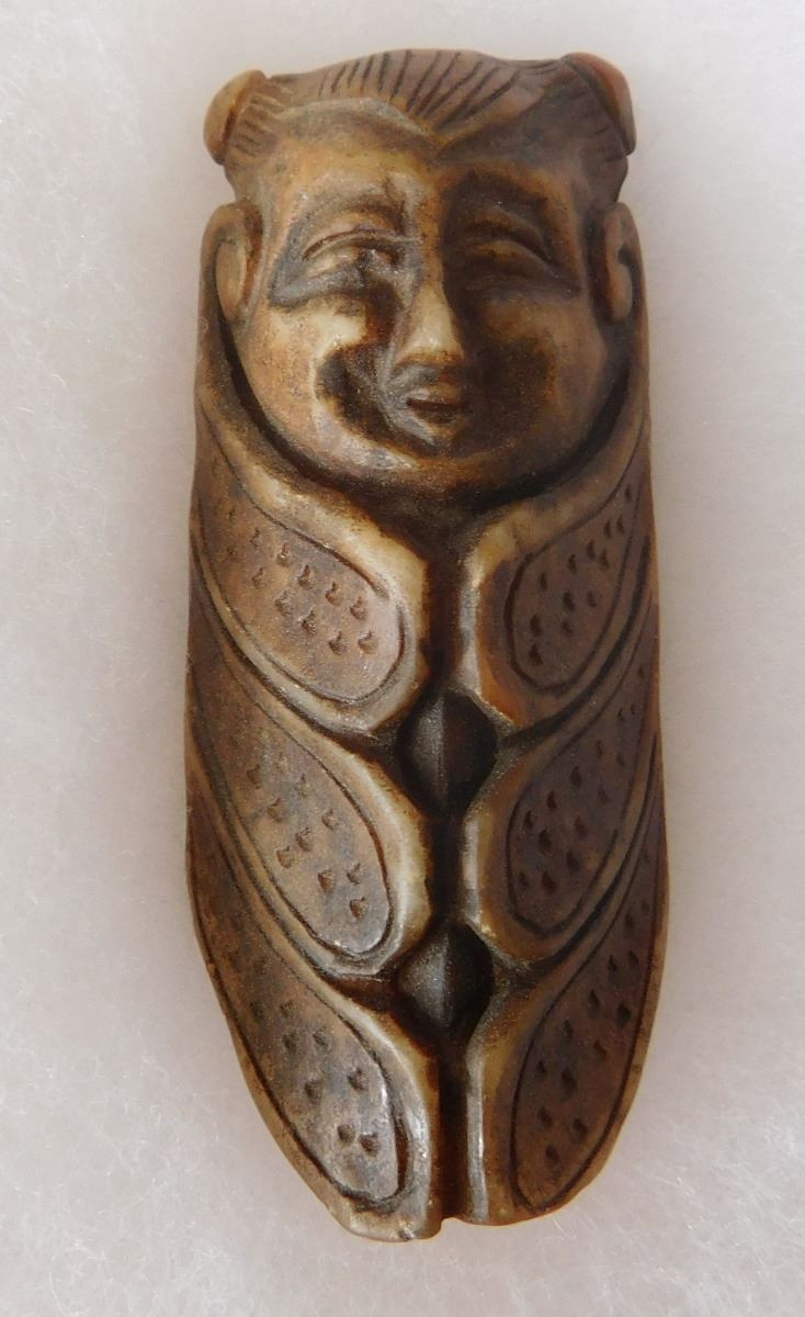 Chinese Jade Cicada Carving w/Man's face, pre-dyanstic period. Item measures 2.5" x 1" x 0.5". Previously of the Heritage of the Americas Museum, El Cajon, Calif. This item would have been placed in the mouth of a dead person at burial. Frame not included. Condition: Good, see images. Shipping: $14.50.