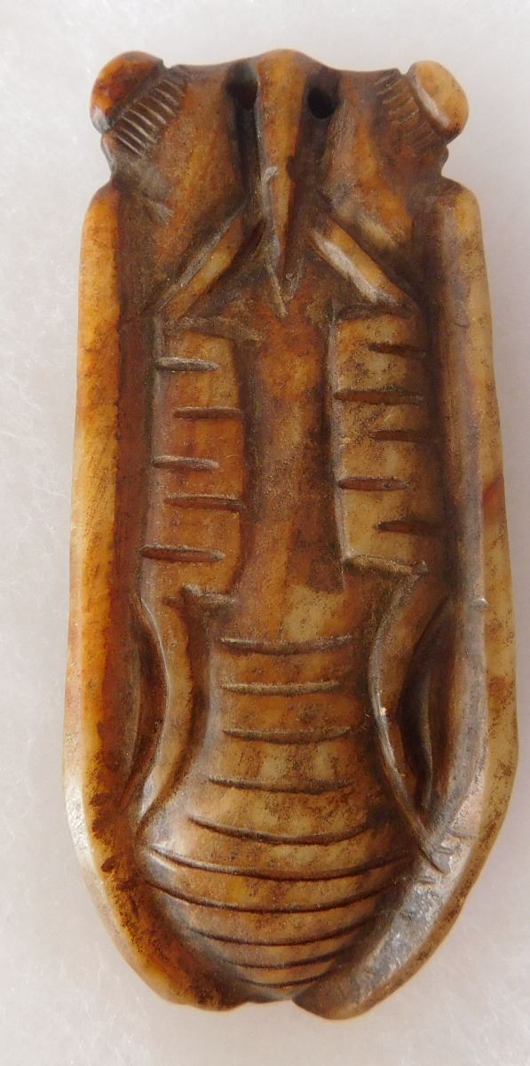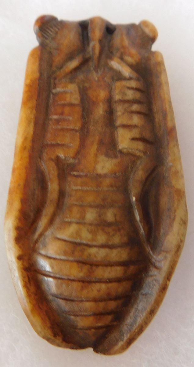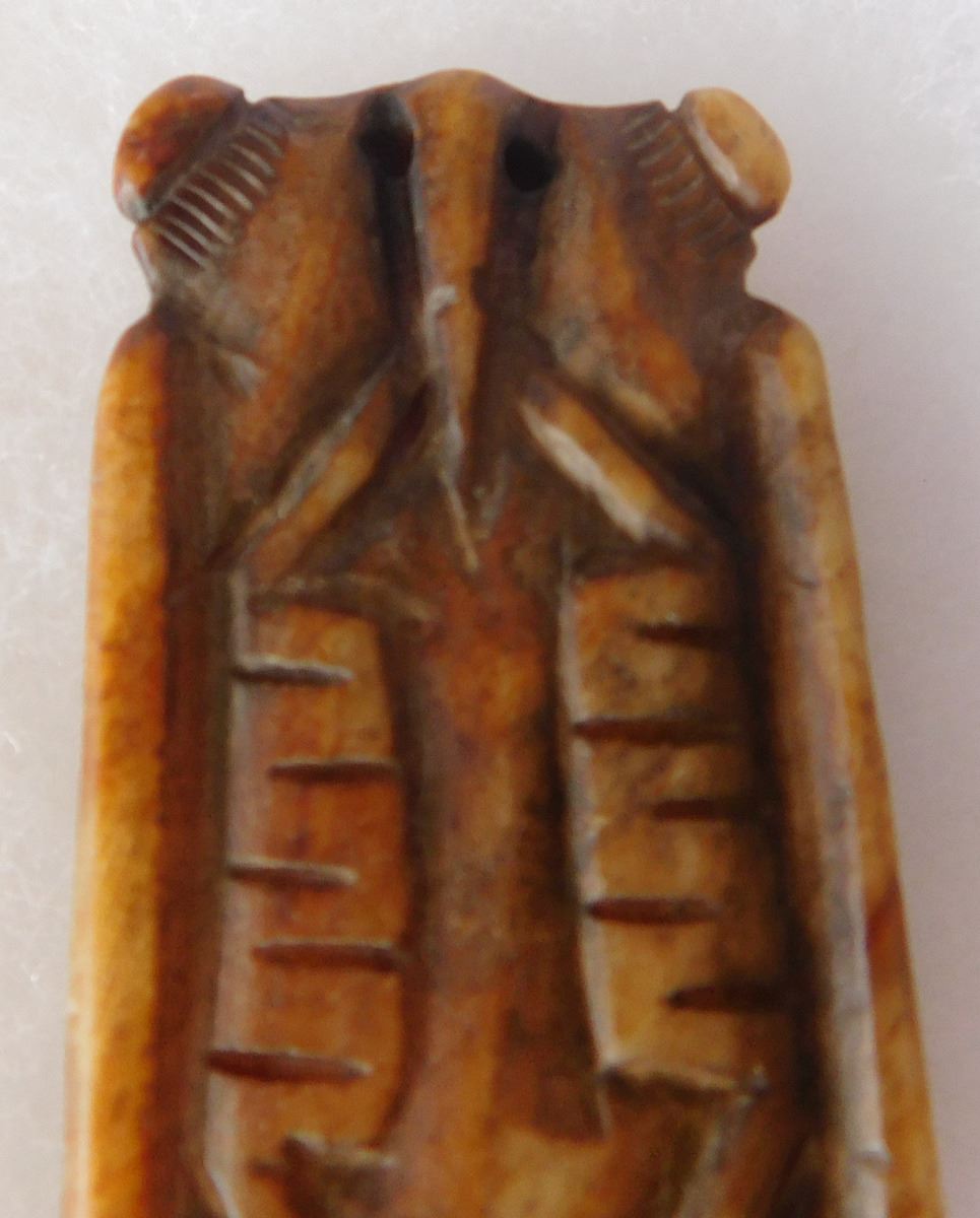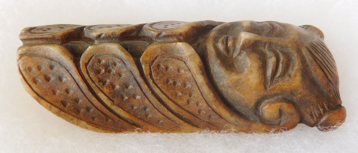 Chinese Jade Cicada Carving w/Man's face, pre-dyanstic period. Item measures 2.5" x 1" x 0.5". Previously of the Heritage of the Americas Museum, El Cajon, Calif. This item would have been placed in the mouth of a dead person at burial. Frame not included. Condition: Good, see images. Shipping: $14.50.