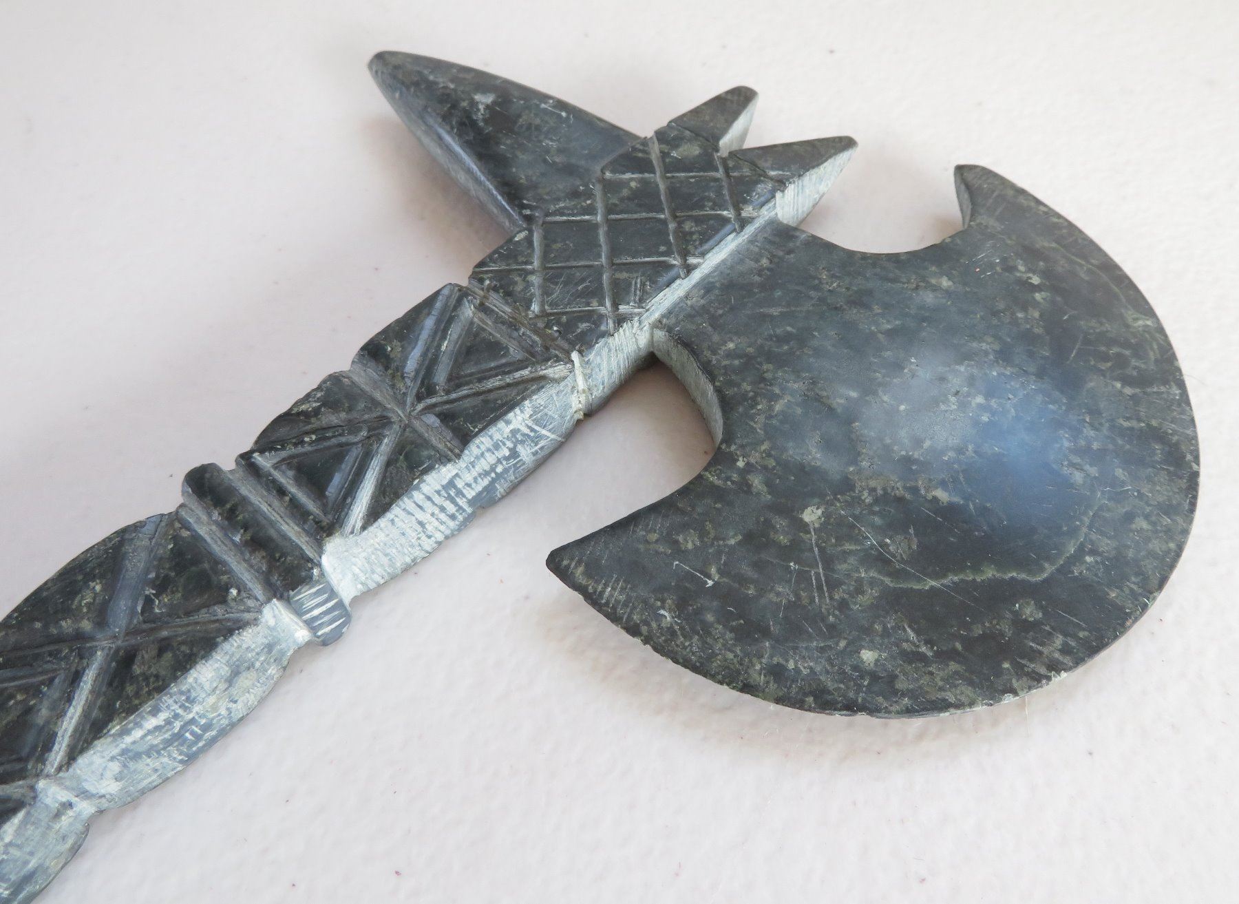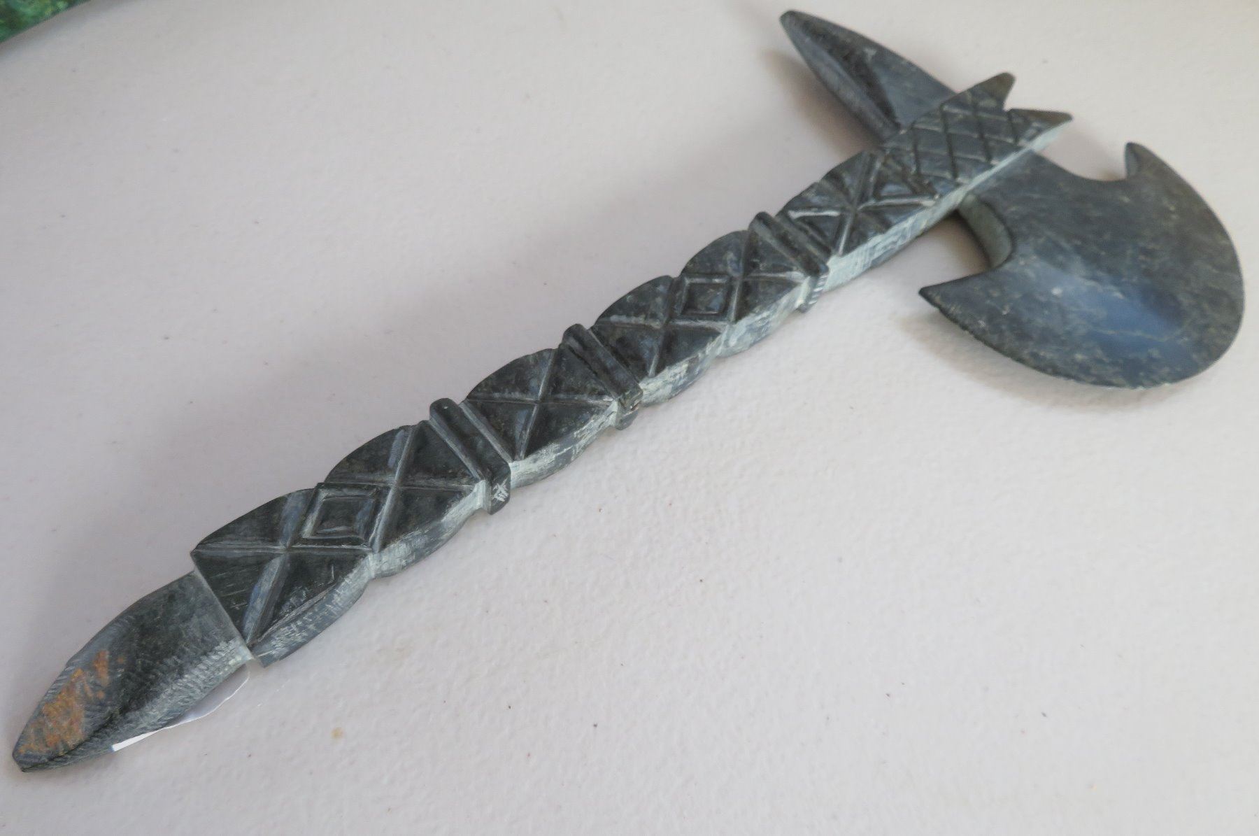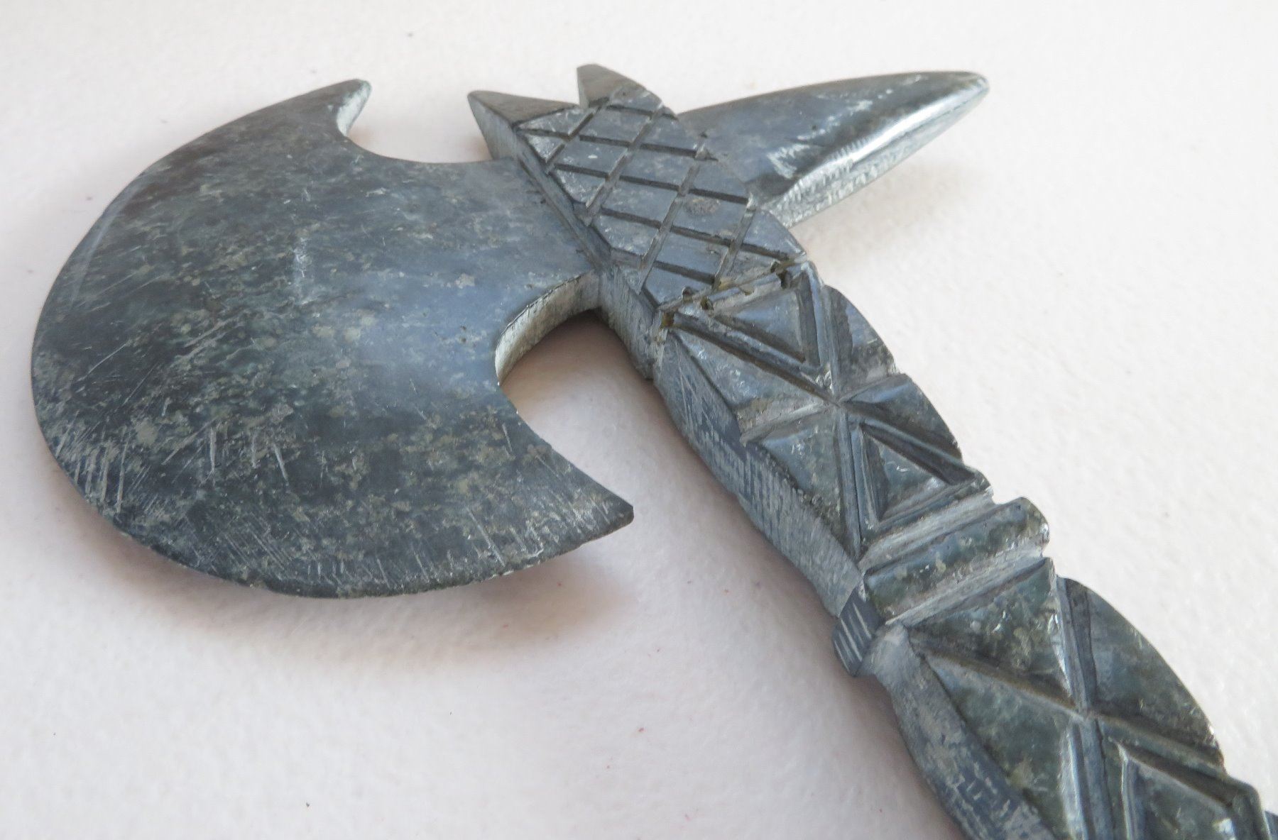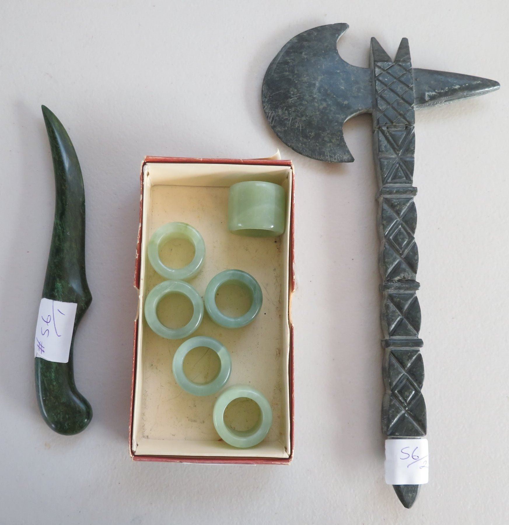 Chinese Jade Collection, c. 1900. Made of jade, the axe measures 12" x 6", the bow pulls measures 1 1/2" x 1 1/4". China. Bow string pulls, dagger, monolithic axe. Jade dagger measures 8 1/2" x 2'. Condition: Good, see images. Shipping: $35.50 w/insurance and signature, due to weight.