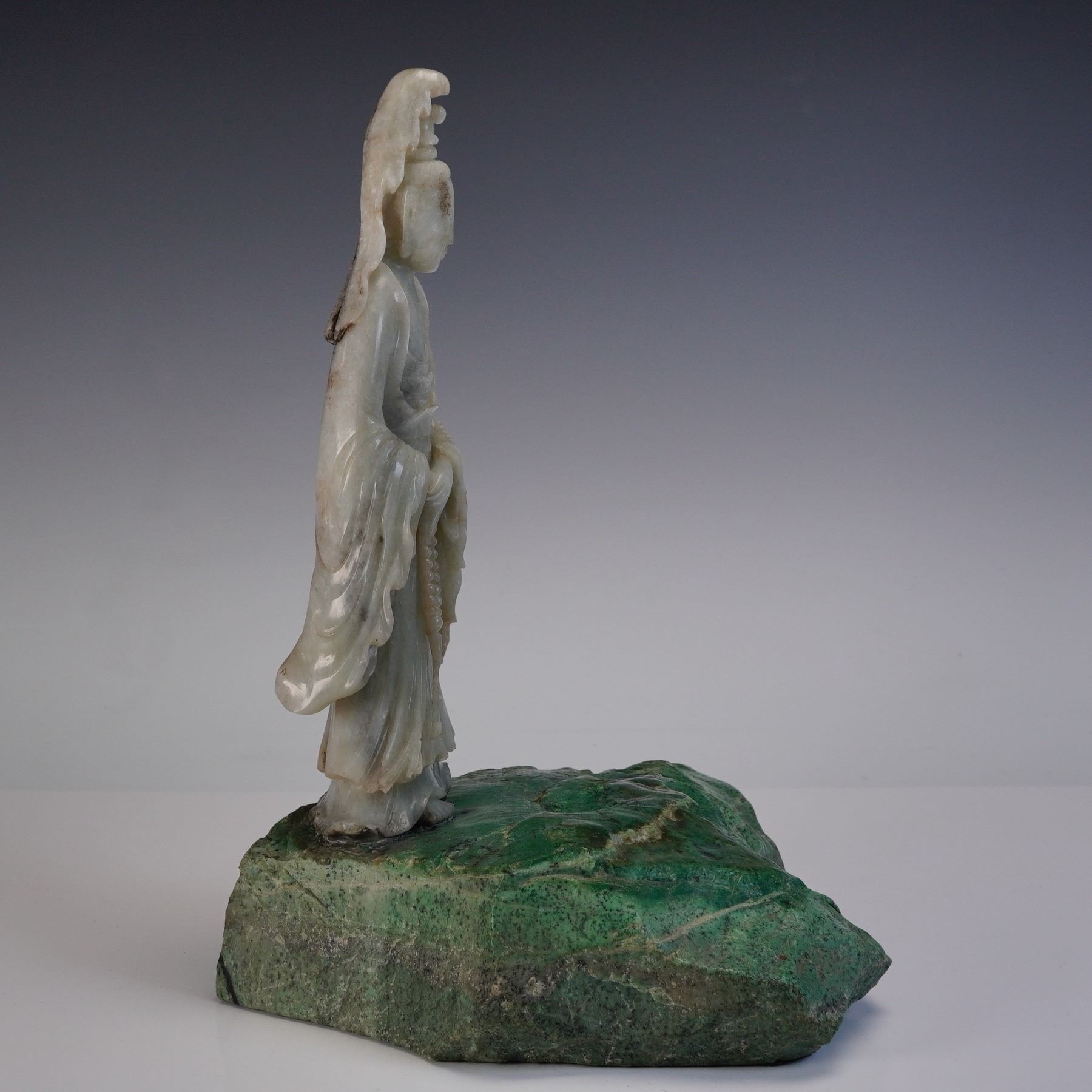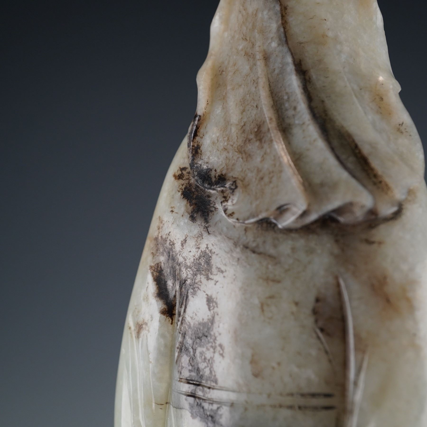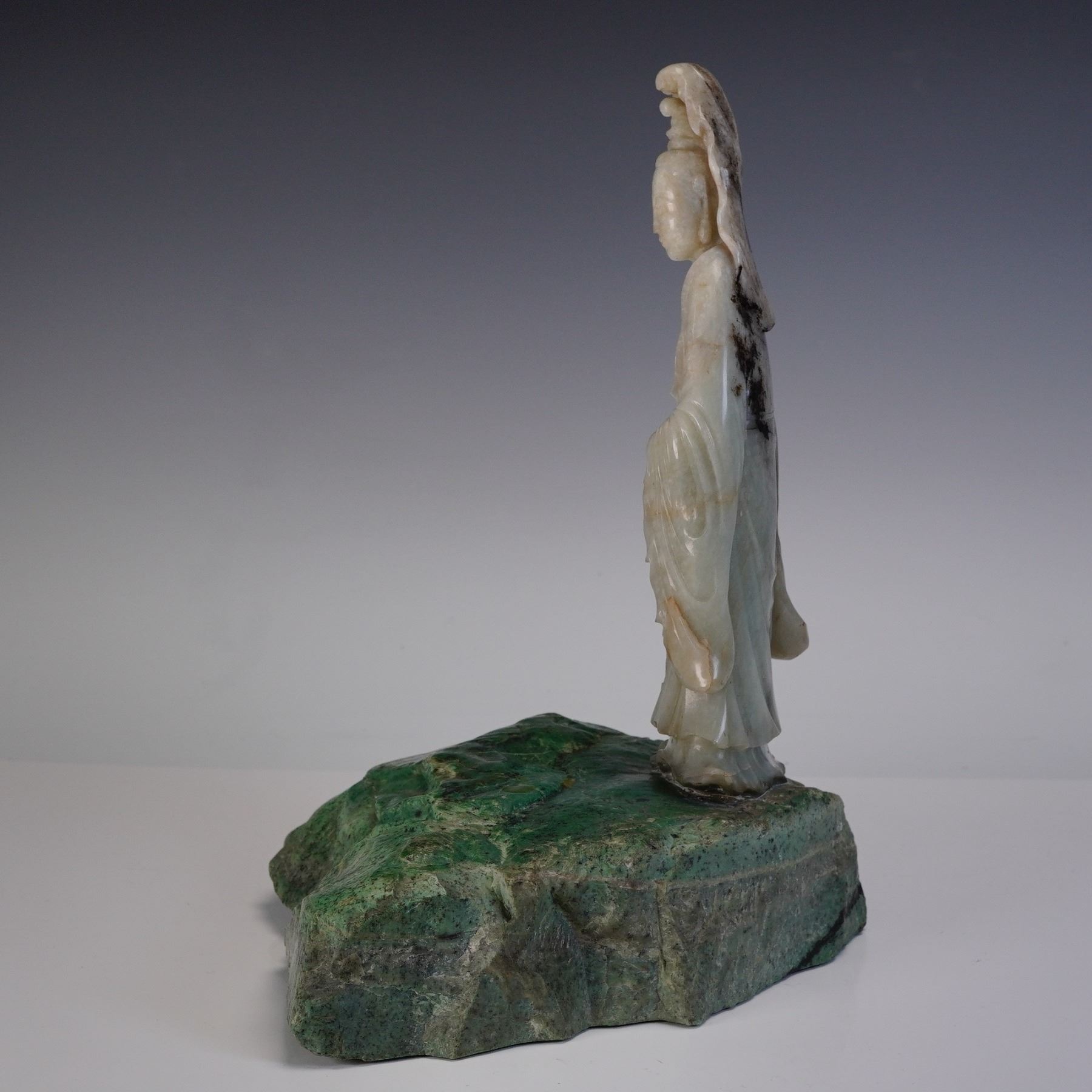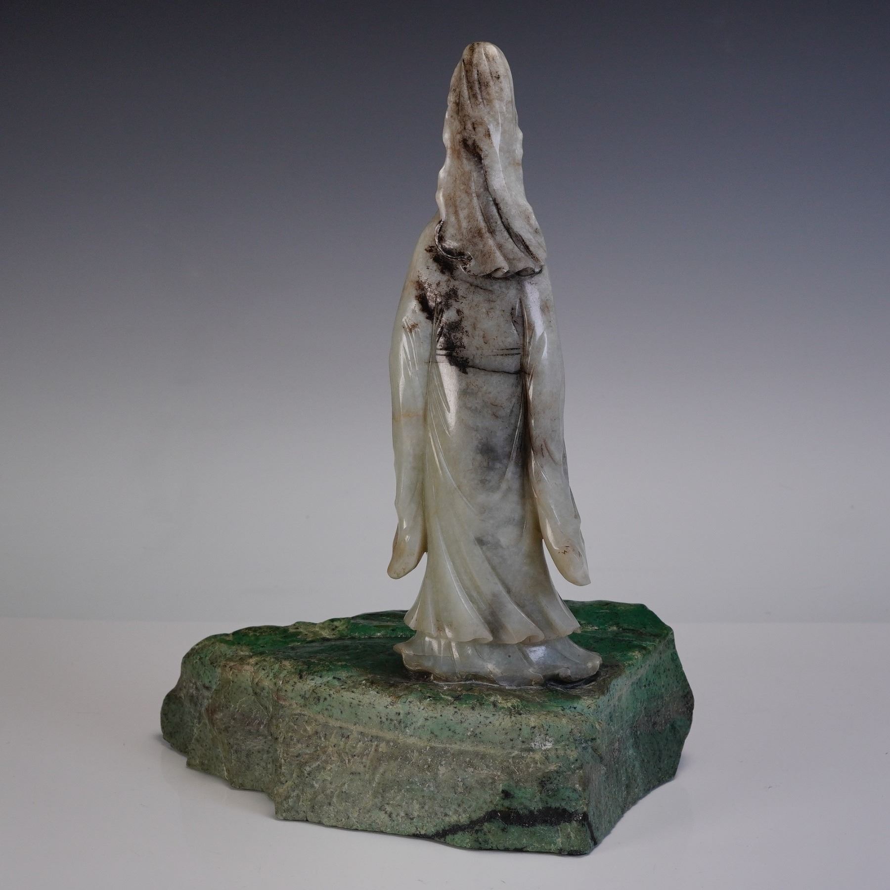 Chinese carved jade figure depicting Guanyin, shown standing and holding a bead strand in both hands. The figure is carved from a grayish-white jade with natural russet and dark inclusions, detailed with flowing robes and a tall head covering. The carving is mounted on a carved chloromelanite jade base of irregular form.