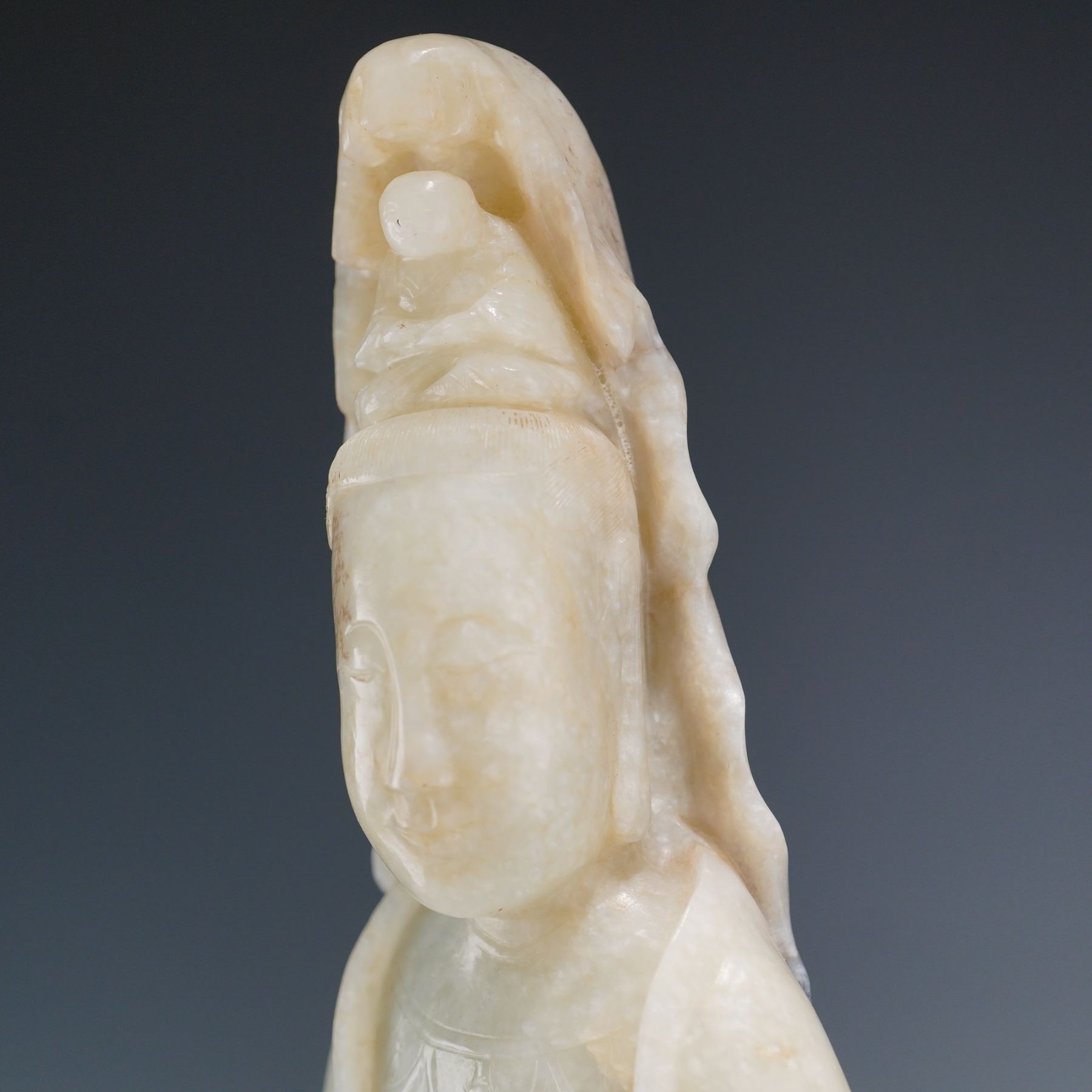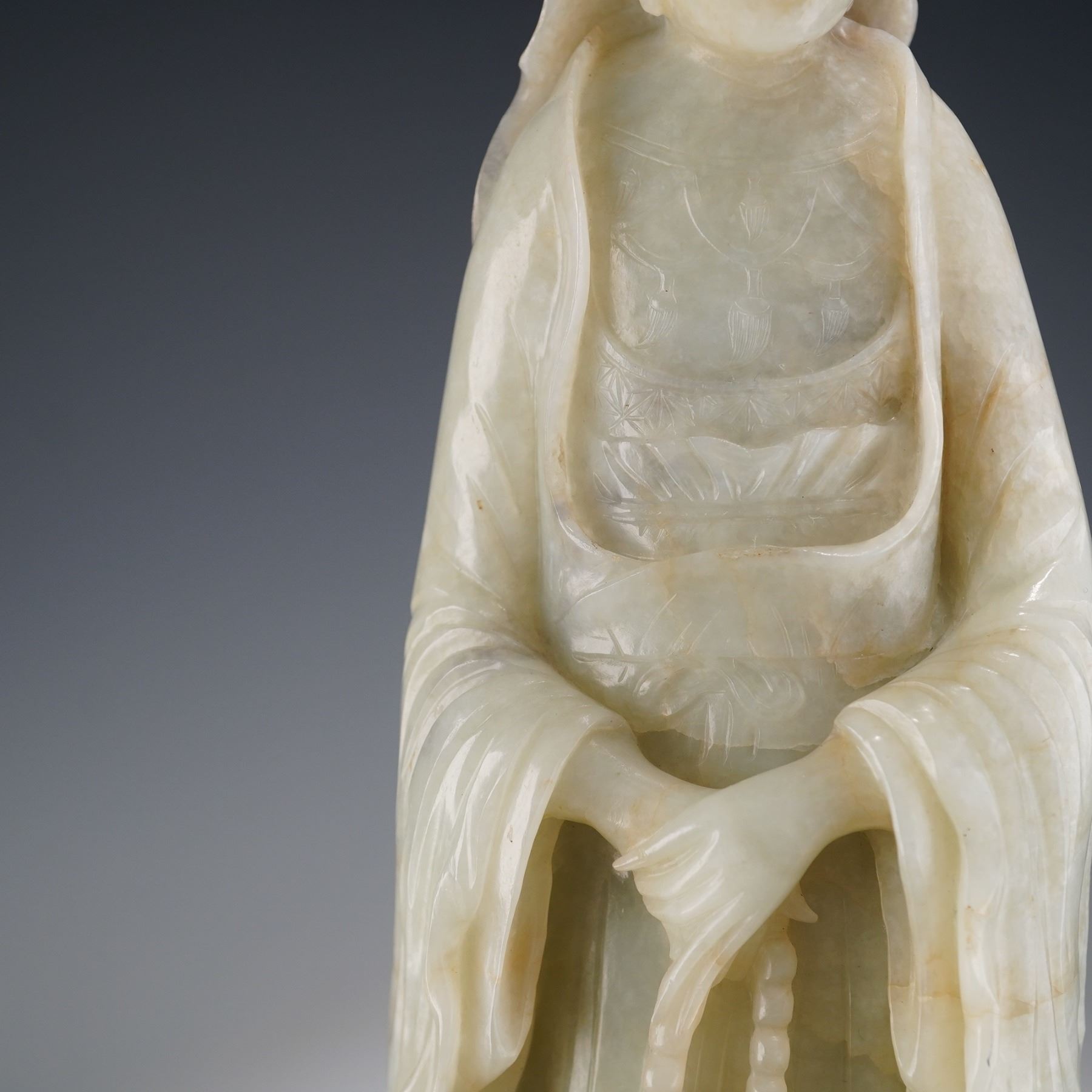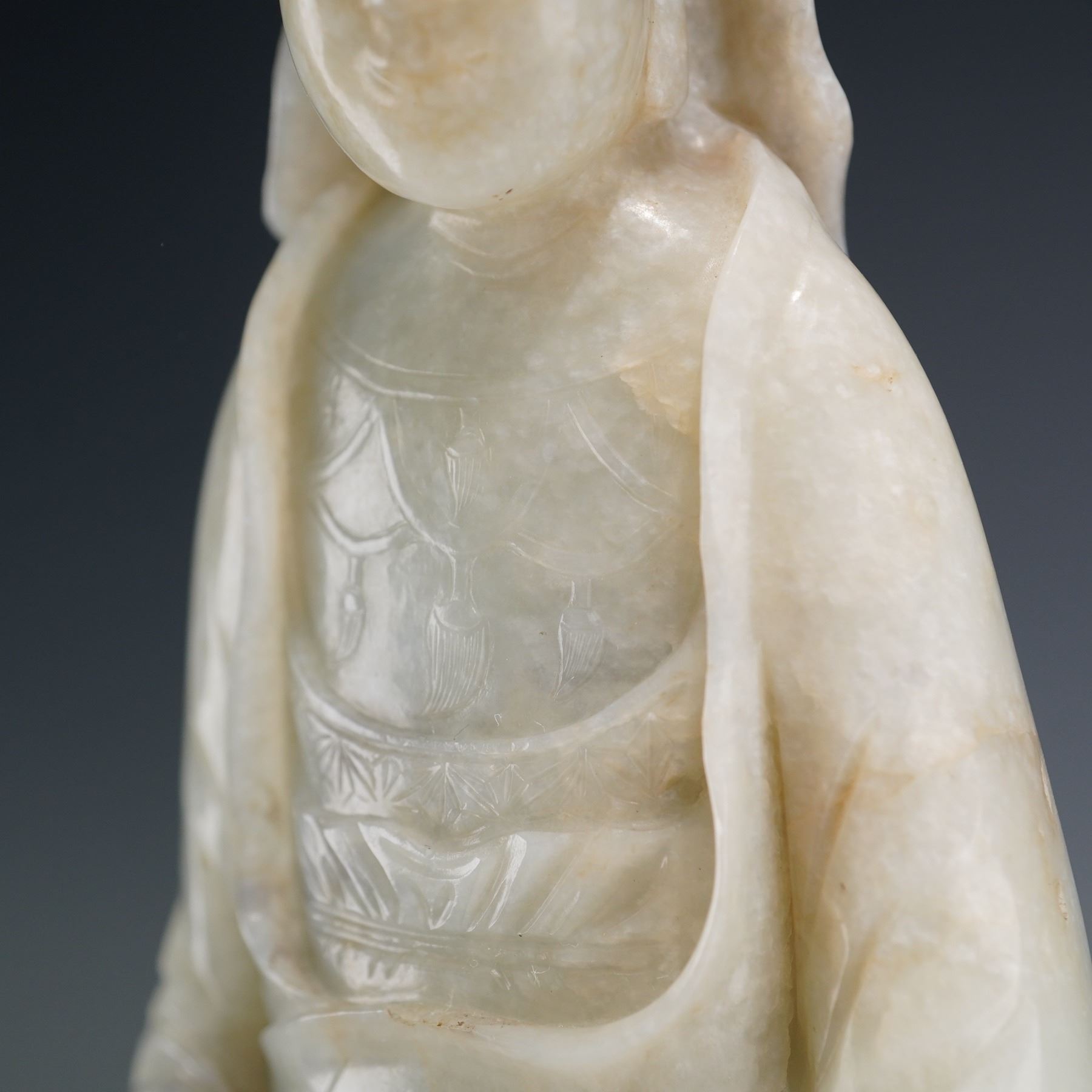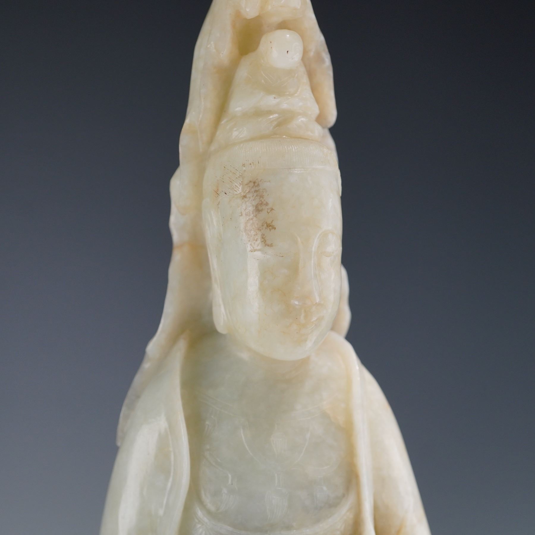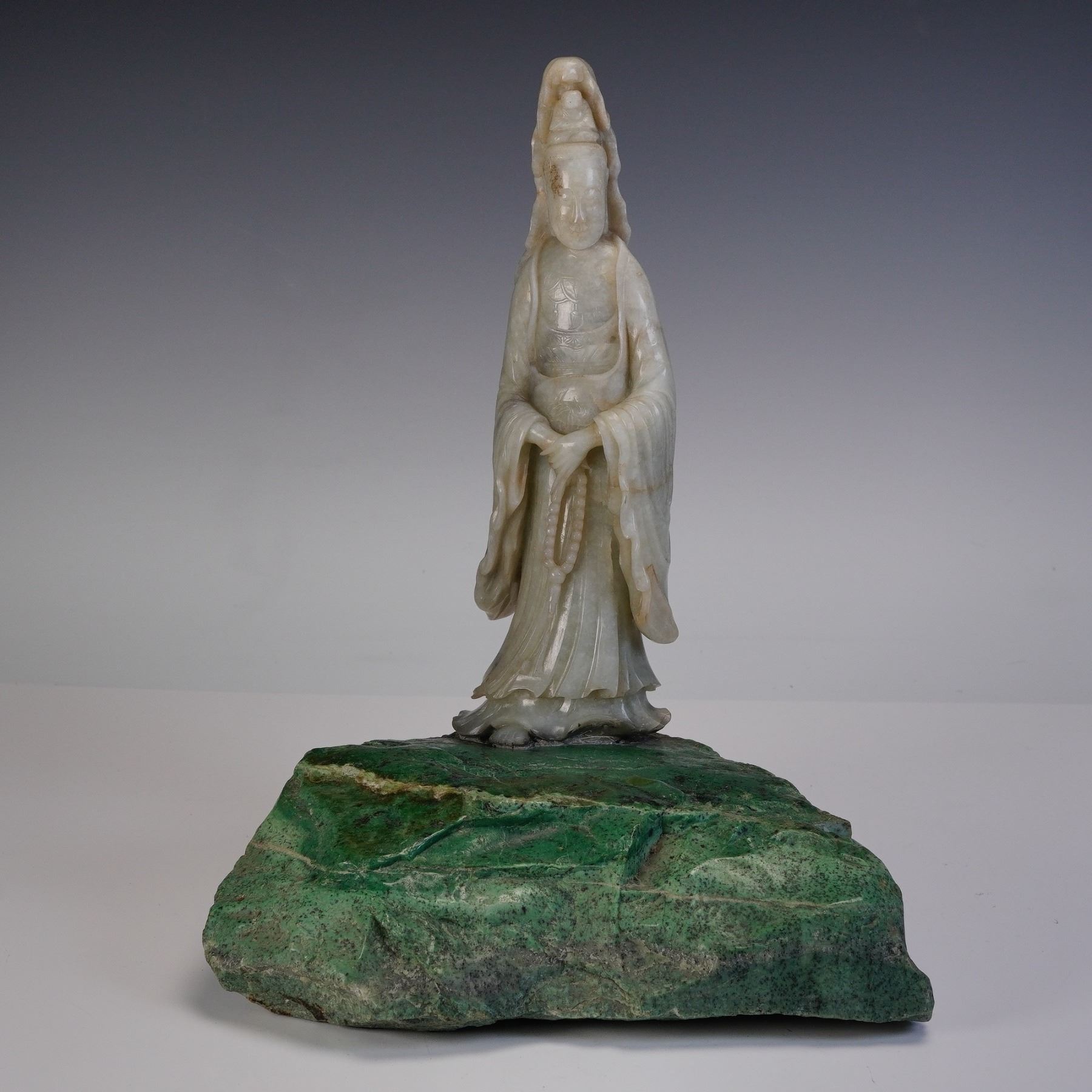 Chinese carved jade figure depicting Guanyin, shown standing and holding a bead strand in both hands. The figure is carved from a grayish-white jade with natural russet and dark inclusions, detailed with flowing robes and a tall head covering. The carving is mounted on a carved chloromelanite jade base of irregular form.