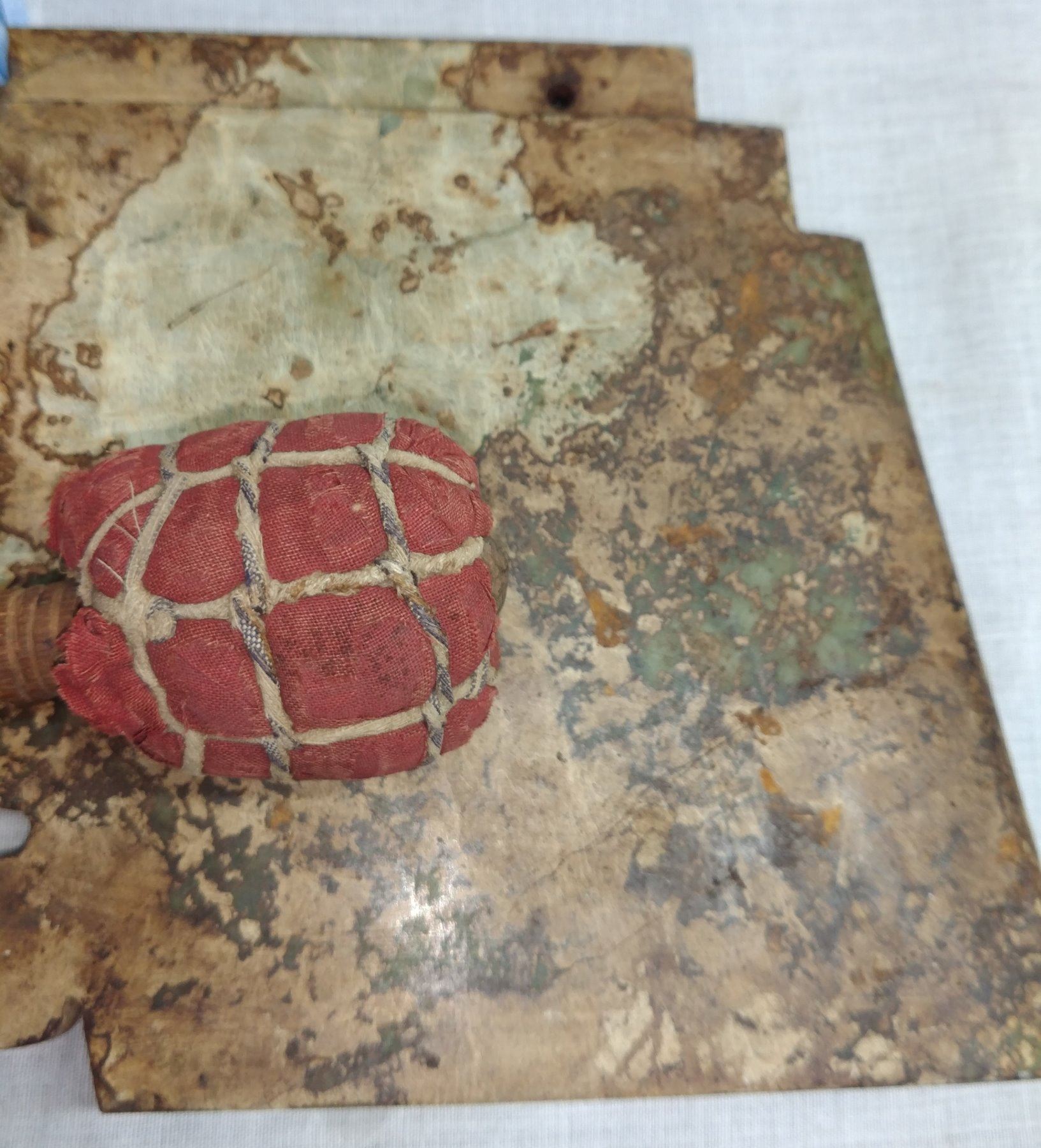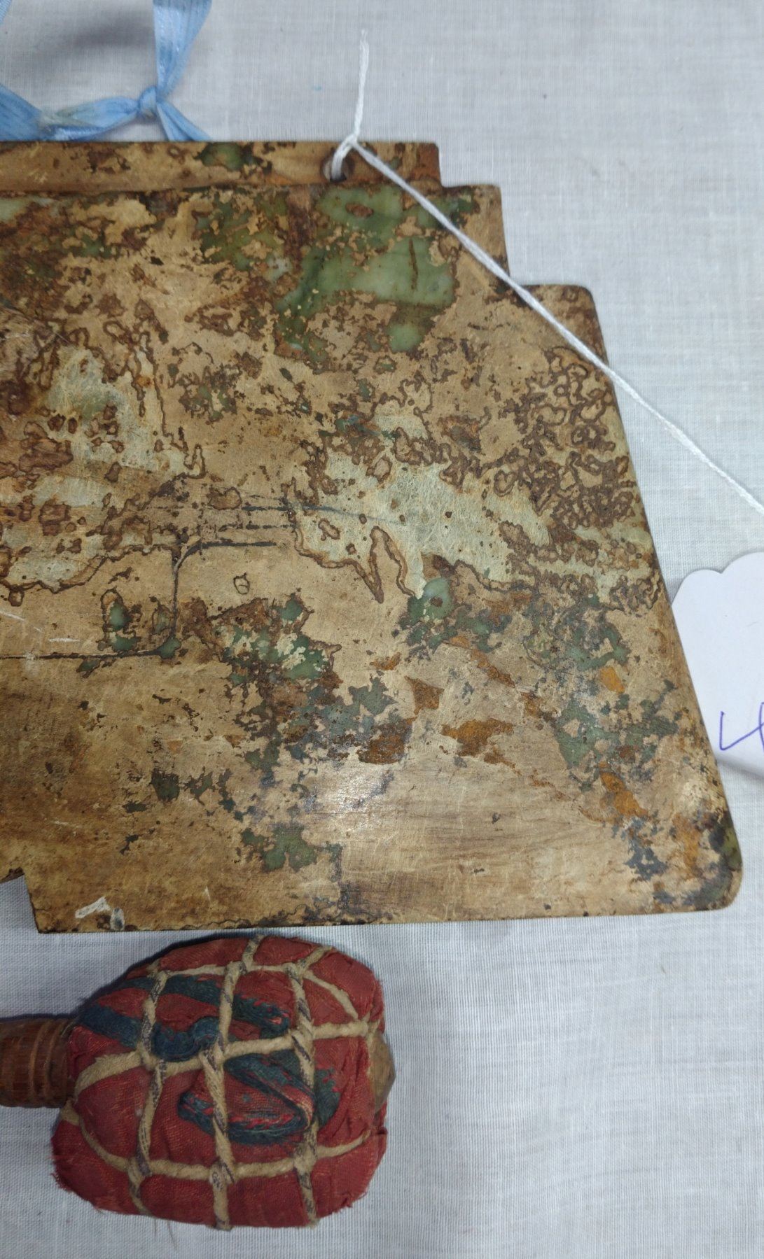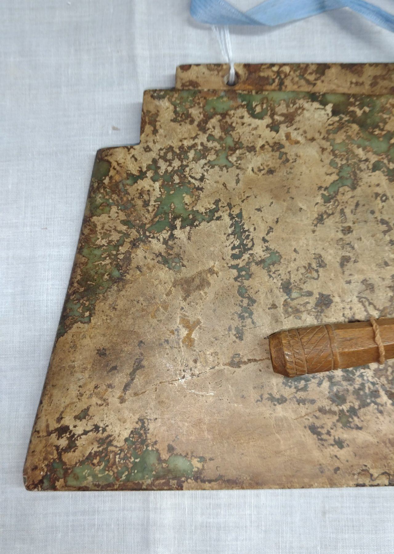 Chinese Jade Gong, Ming dynasty. Made of jade, wood and cloth, the item measures 14" x 7" x 1/2". China, 3 Gorges area. Has nice sound. Condition: Good, minor wear, see images. Shipping: $26.50 w/insurance and signature.