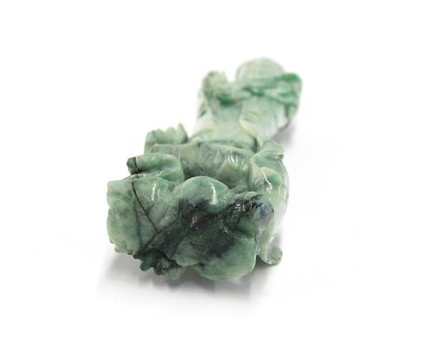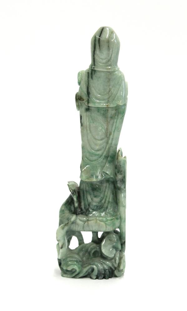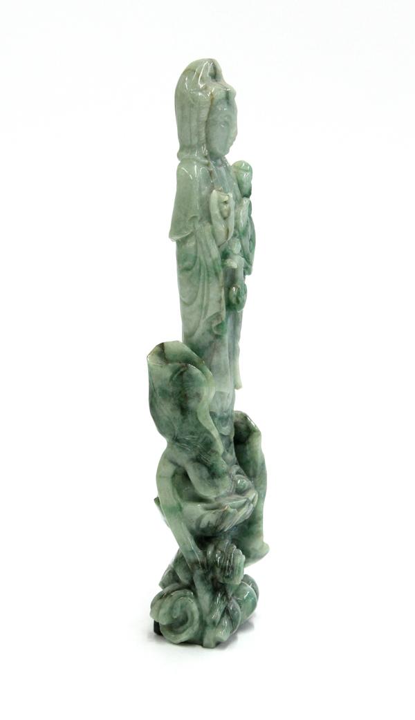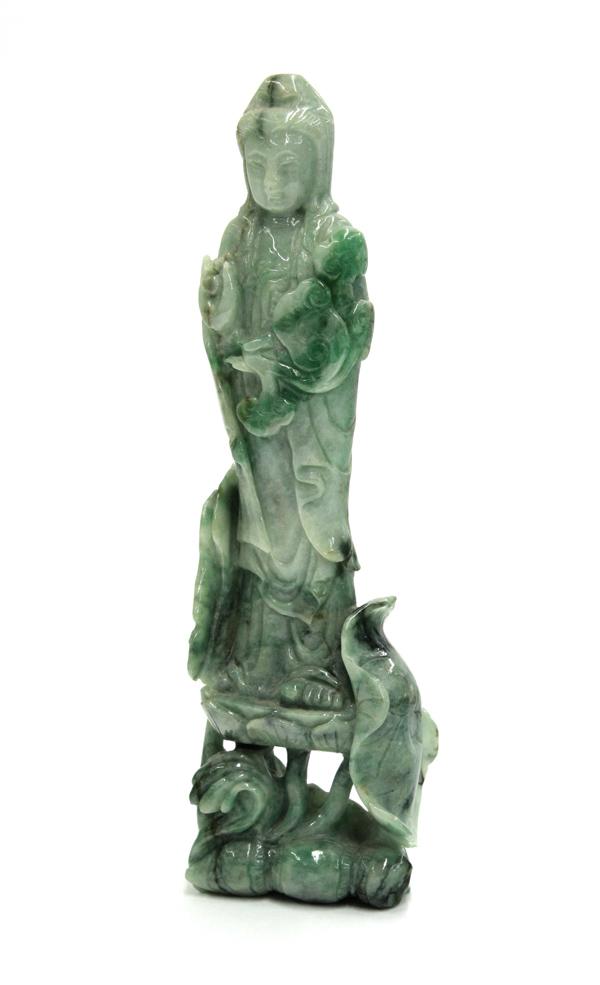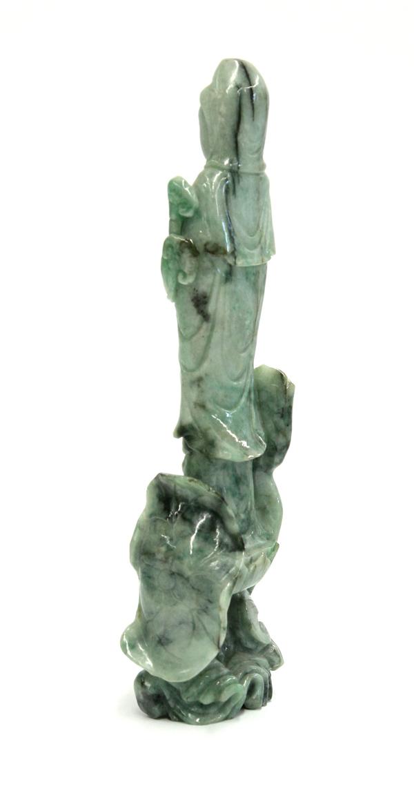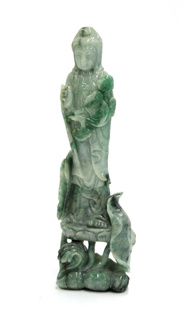 Chinese jade Guanyin figure, carved with soft features framed by a tall chignon, a sacred jewel jewel held in one hand and fronted by a lingzhi spray, all raised on a lotus form support, the matrix of mottled green hue, 6.25''h