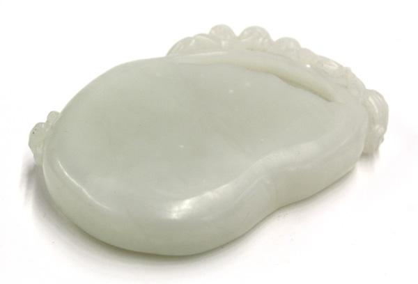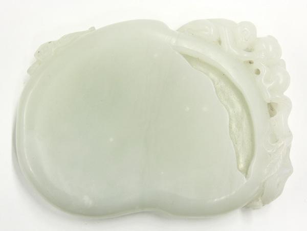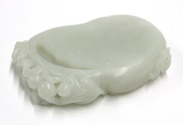 Chinese carved jade ink-stone, of flattened bean shape with a small water reservoir below a reticulated border featuring a monkey attempting to pick one of the peaches issuing from a gnarled leafy branch framing the top, a small relief carving of a bat to the left edge, the stone of pale green color with occasional white inclusions, 4.75''l