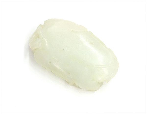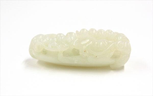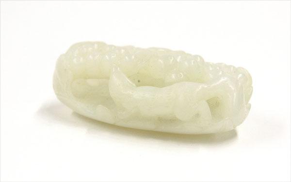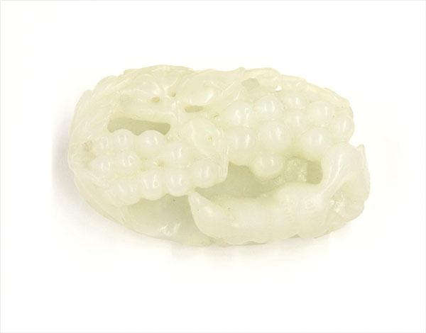 Chinese reticulated pale green nephrite toggle, well carved and undercut as a solitary squirrel nibbling on one of two bunches of leafy grapes, all supported on one large leaf, the matrix of even tone scattered with a few opaque inclusions, 3''l