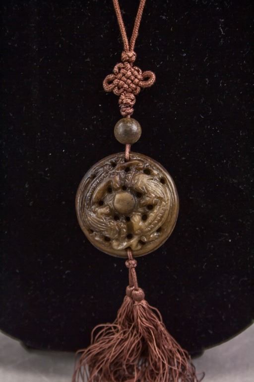 Chinese jade dragon pendant necklace. Of dark brown tone. Carved with openwork. With Chinese knot above, and tassels below. 32 grams.