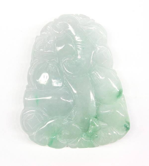 Chinese jadeite pendant/toggle, the front carved with a chilong perched on the top of a lingzhi fungus amid fruiting peach sprigs and cash emblems, reversed by further lingzhi and double gourd, the translucent pale green matrix with occasional apple-green inclusions, 2.75''h