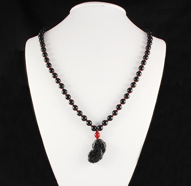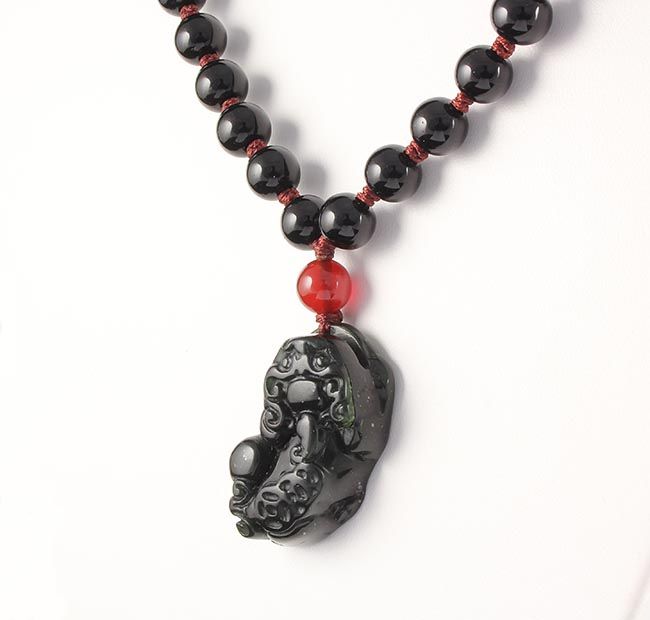 Chinese Jade Pixiu Necklace with Black Agate Beads **|**|** 323.00CARAT Handmade Jade Black Green Chinese Pixiu Pendant 34x18mm Hanging from Black Agate Beads Necklace; 14" total length ; MSRP: $0
