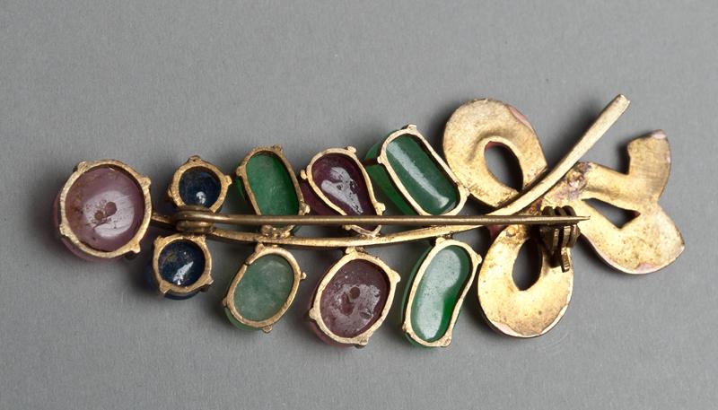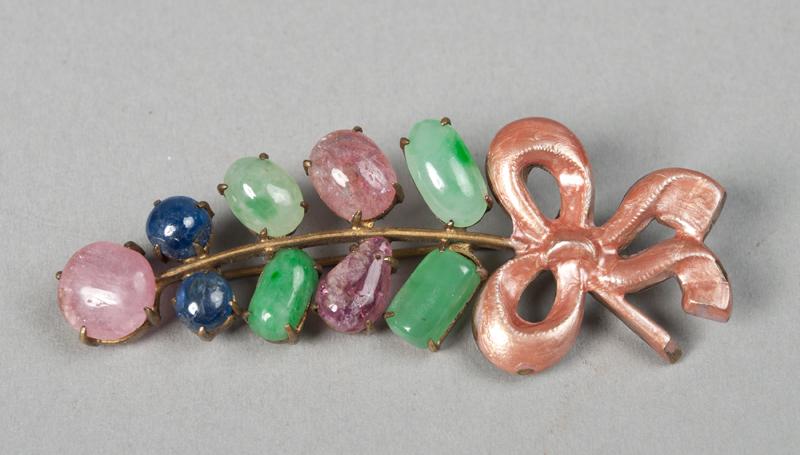 The silver gilt broach consisting of inset cabochons of jade, rose quartz and amethyst, with a pink enamel bow at the end, 2.5"L, circa early 20th century.