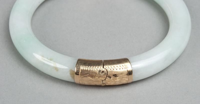A fine light apple green hinged bangle with 14K gold mounts, the stone with touches of lavender, 3"diameter, circa late 19th - early 20th century.