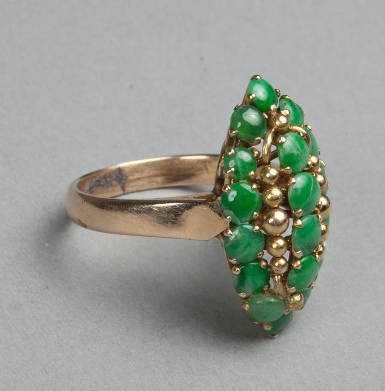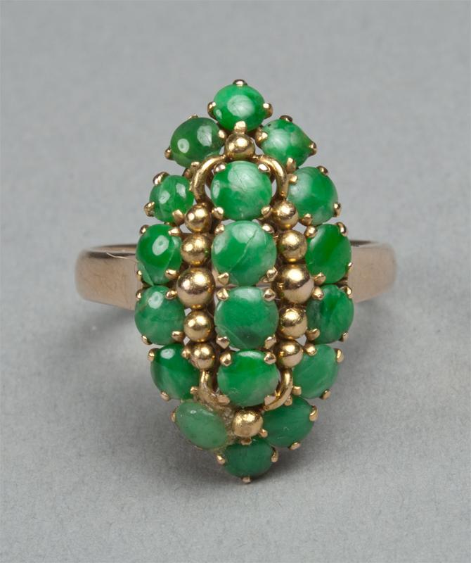 The marquise shaped setting consisting of 18 jadeite beads of very good color, stamped 14k, 6 grams, circa early 20th century.