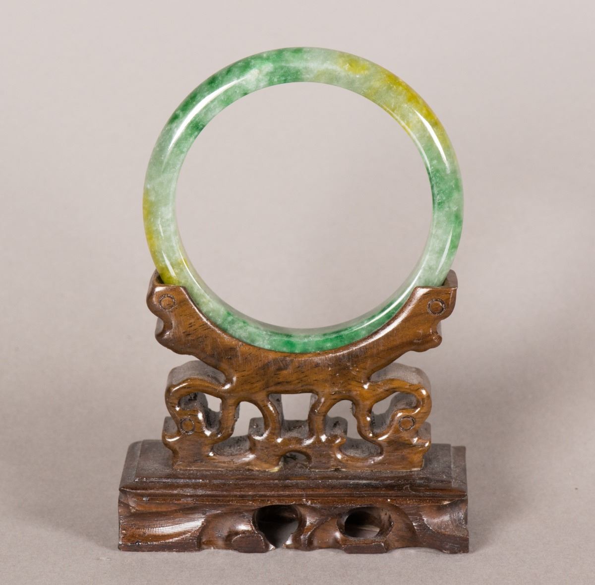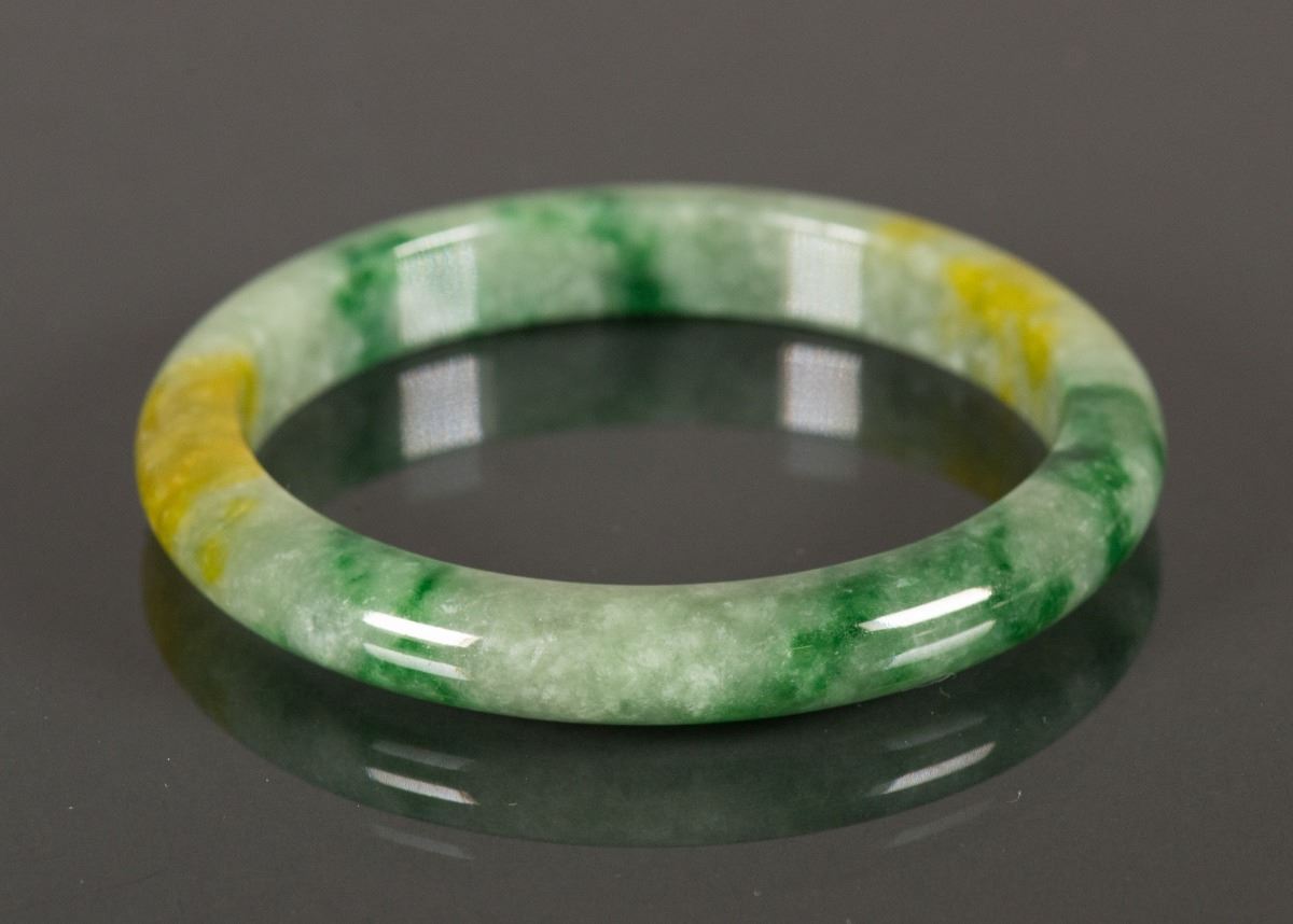 Chinese green jadeite bangle; rounded edge outside and flatten edge inside; of white tone with spinach green and russet suffusions; D: 7.5 cm, Inner D: 6.5 cm, 52 grams; Density: 3.30