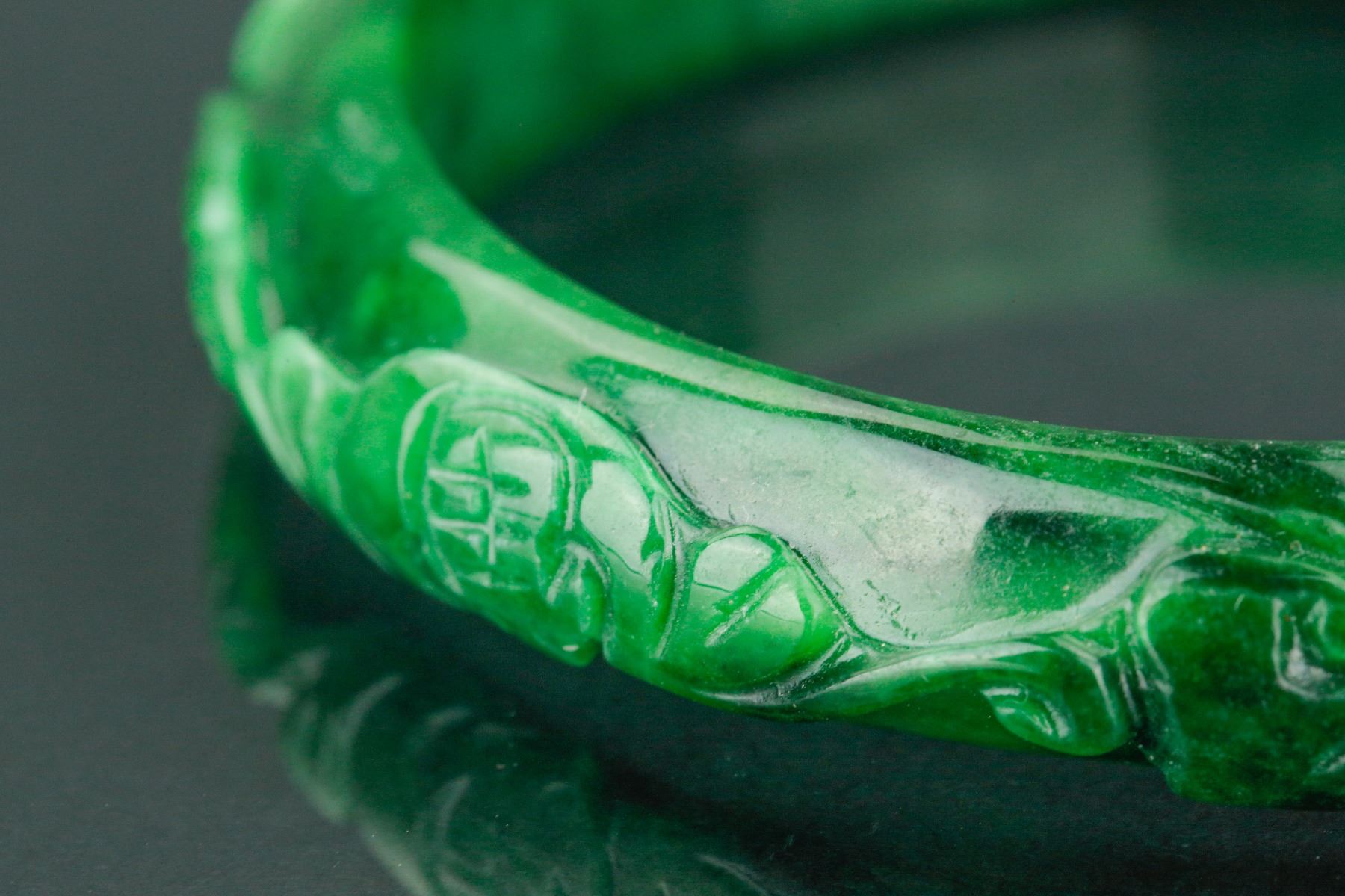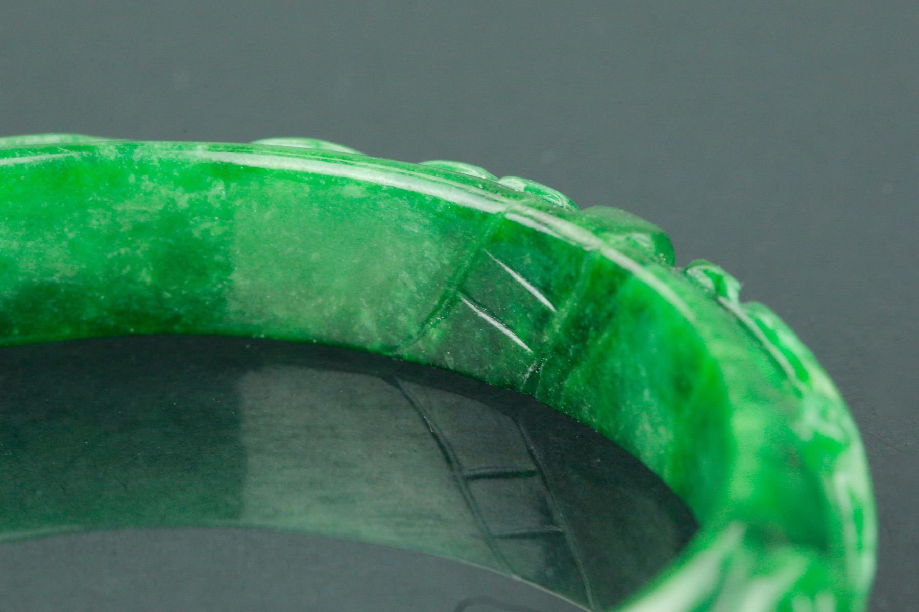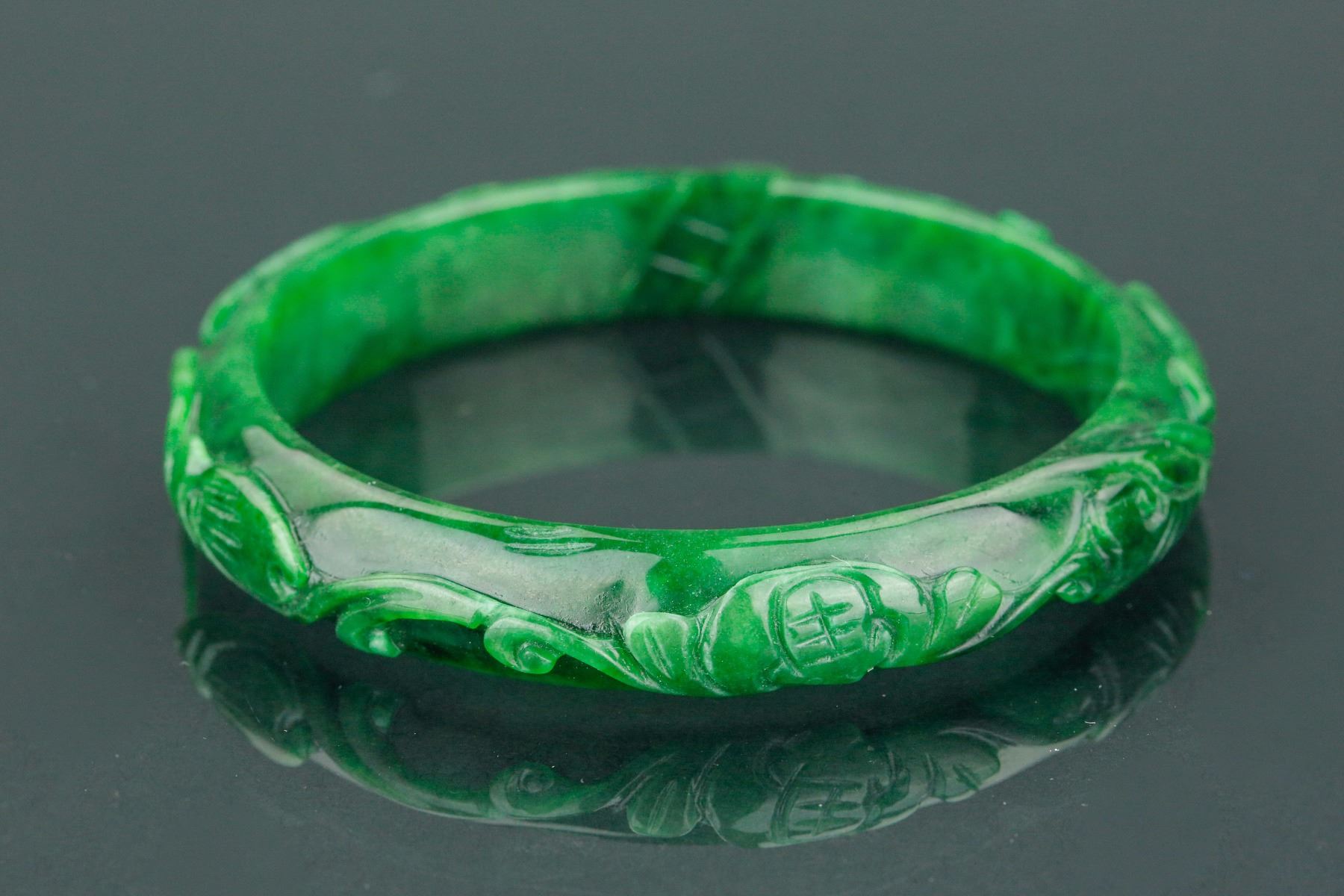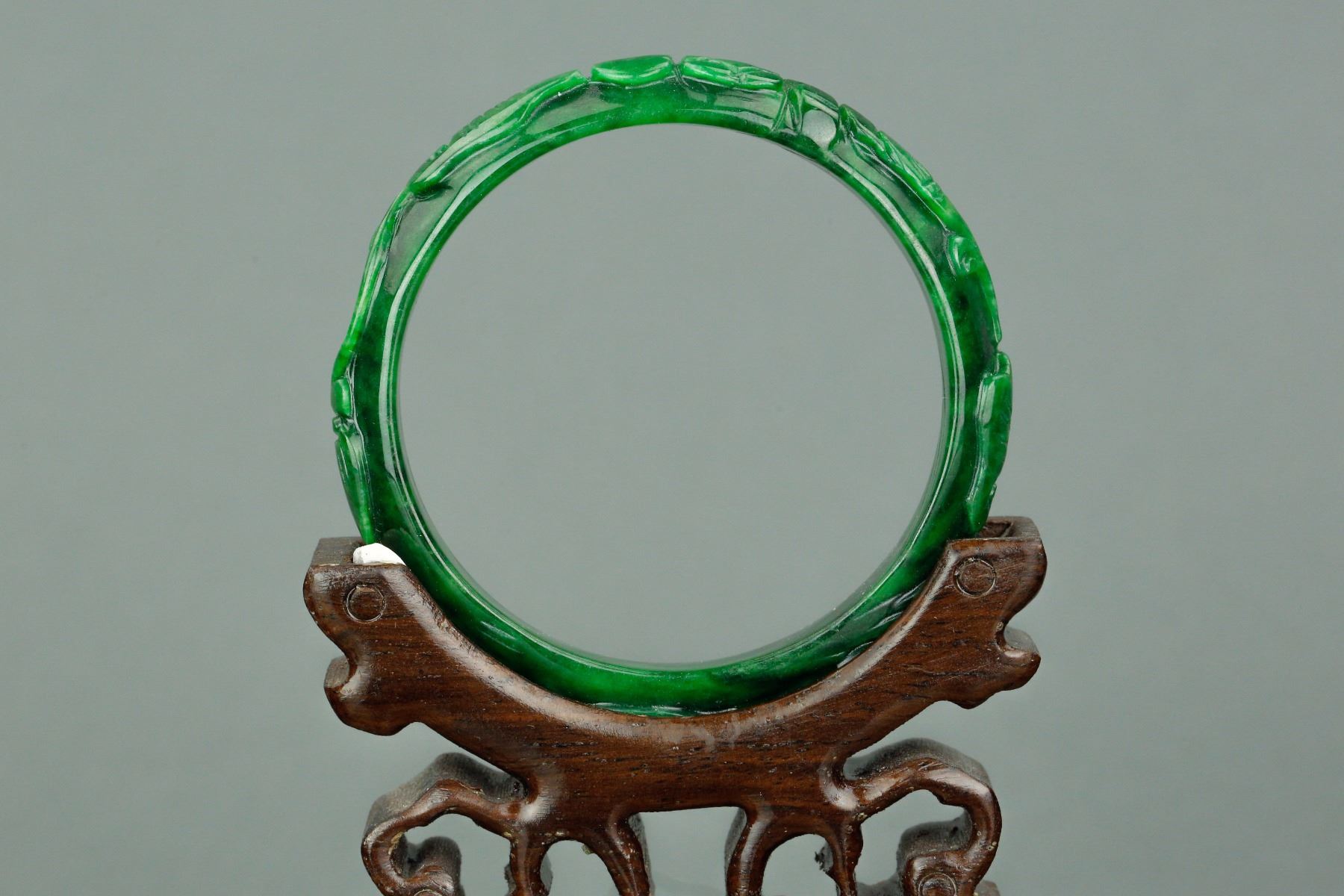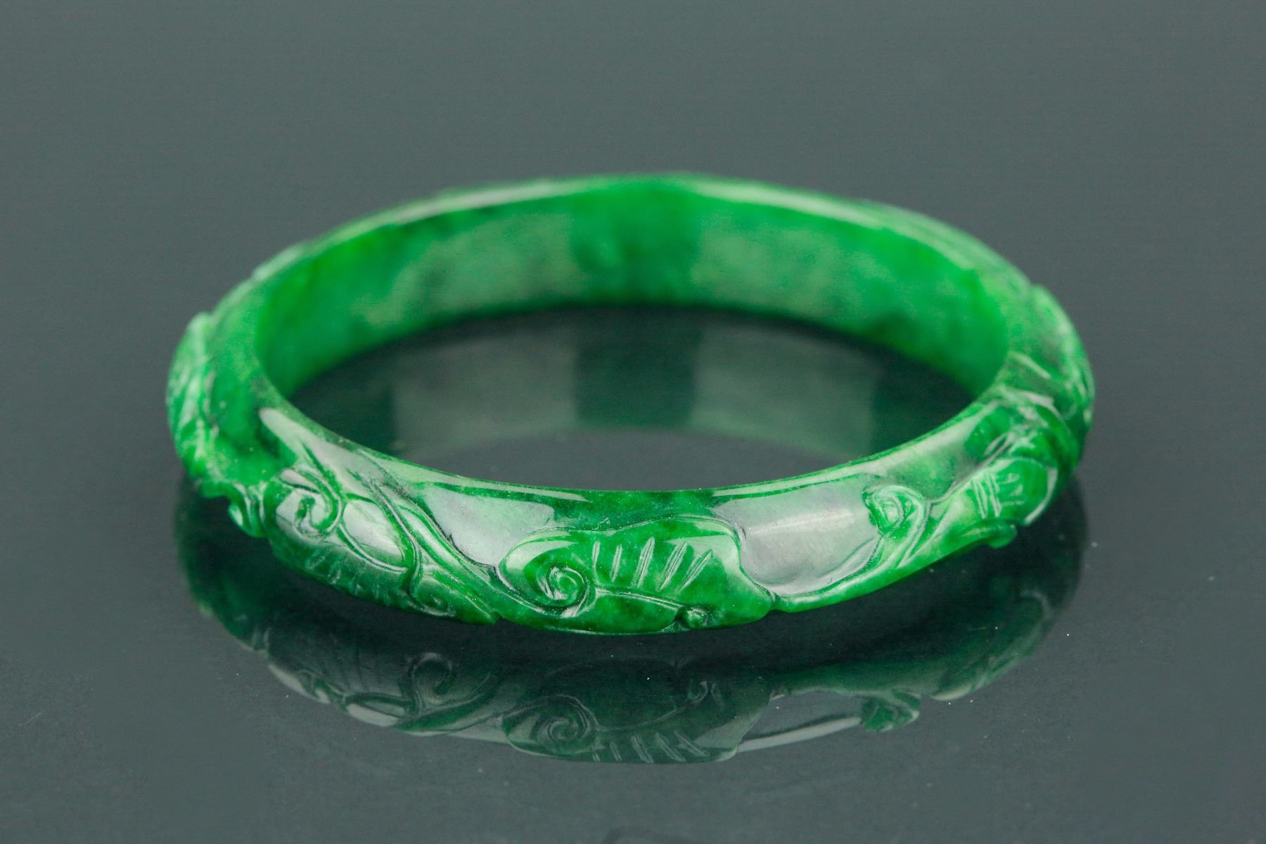 Chinese jadeite carved bangle; featuring scrolling lingzhi mushroom in low relief; of emerald green with spinach green suffusions; D: 6 cm, 35 grams; Density: 3.27