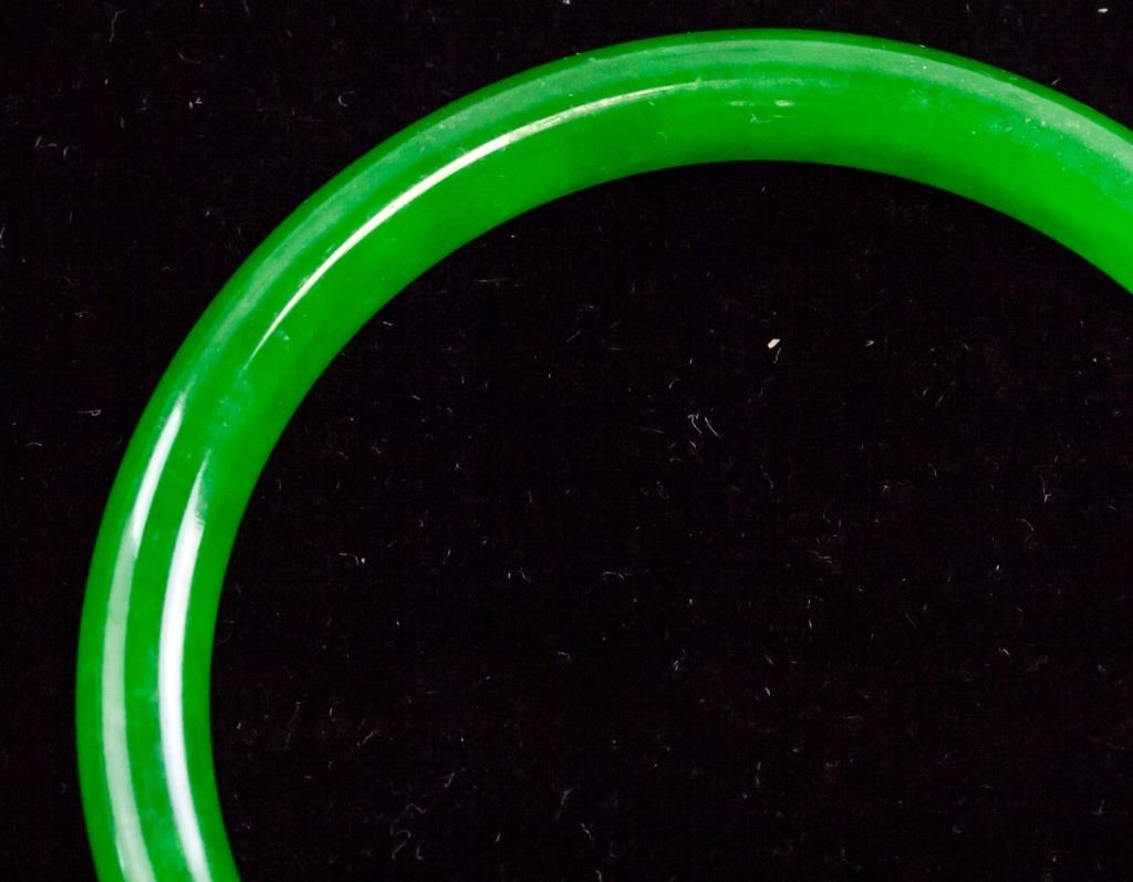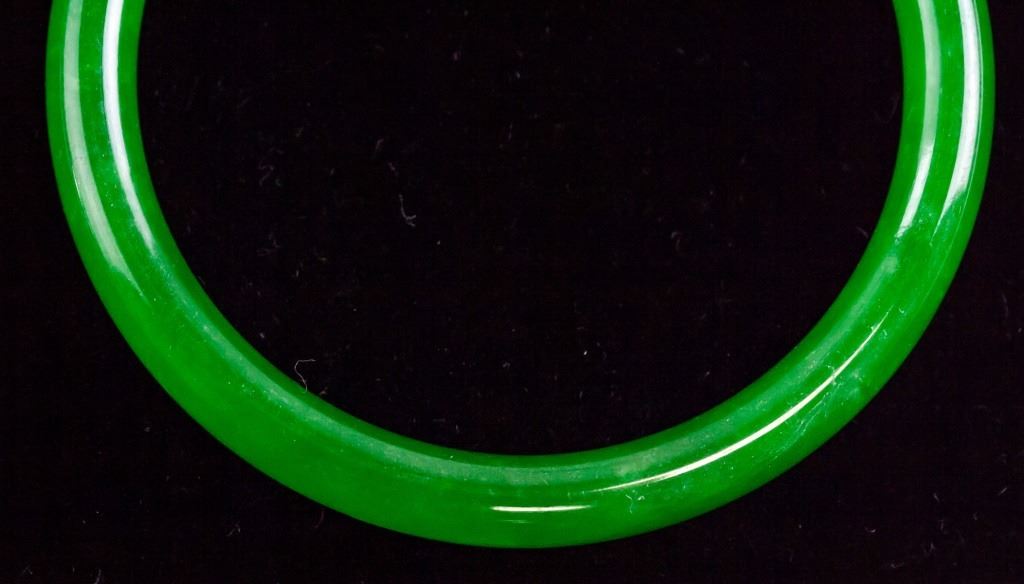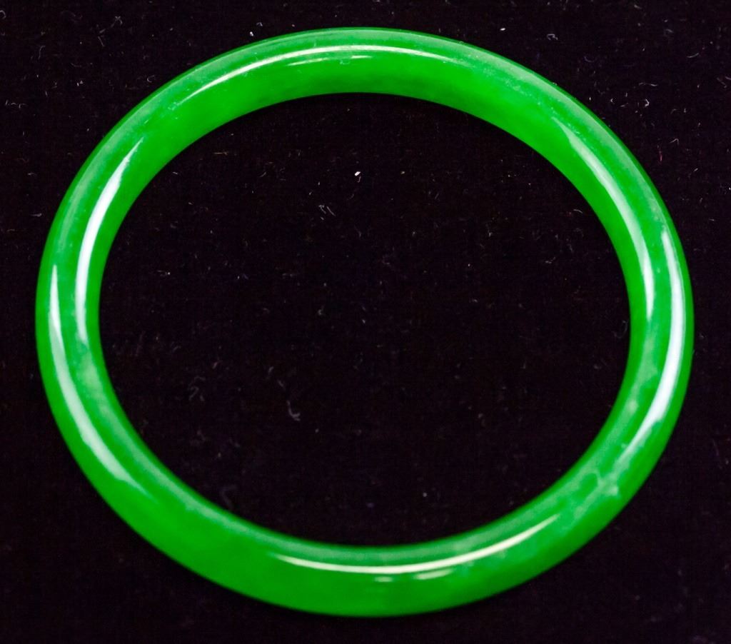 Chinese jadeite bangle. Of imperial green tone. Of rounded inside and outside. Inner diameter: 5.5 cm. Outer diameter: 6.5 cm. 27.01 grams. Density: 3.30.