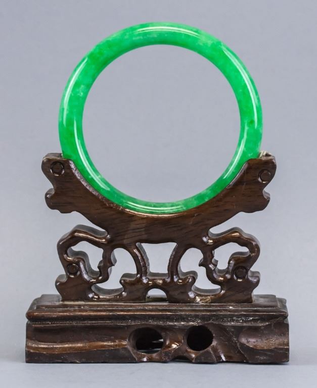 Chinese jadeite carved bangle. Of cloudy light green tone. Of rounded inside and outside. Inner diameter: 5.5 cm. Outer diameter: 7 cm. 30 grams.