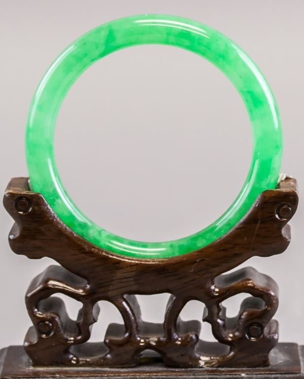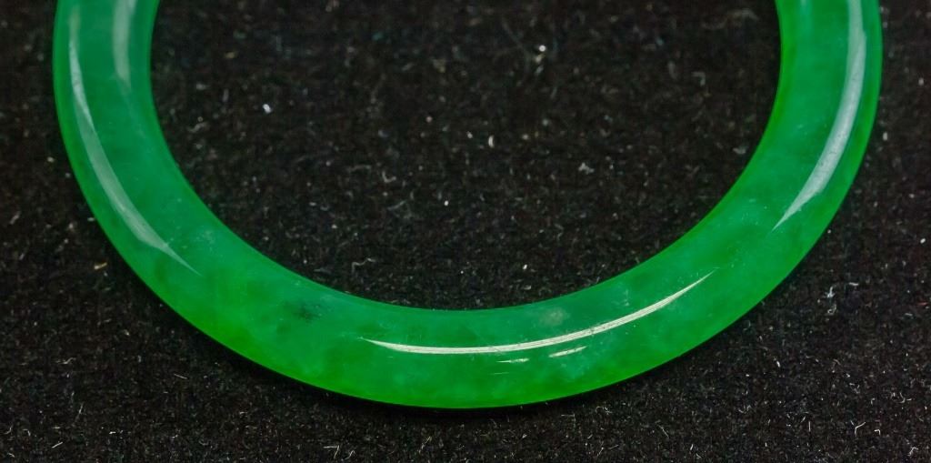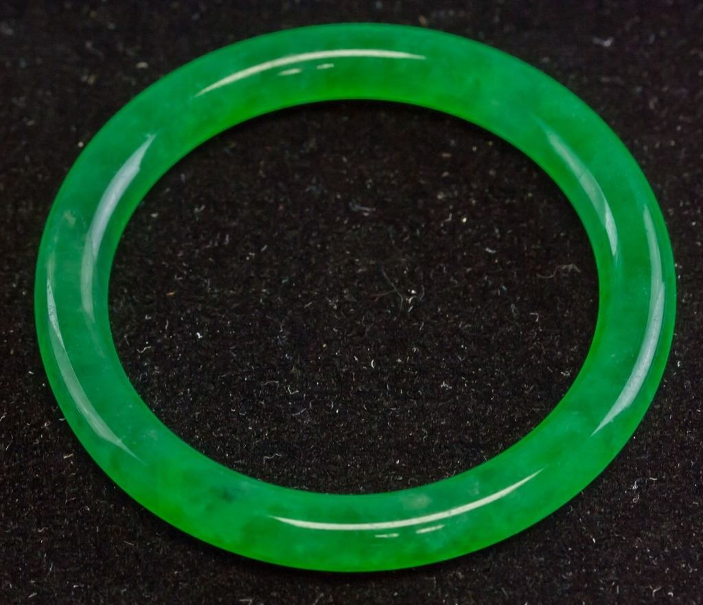 Chinese jadeite carved bangle. Of translucent green tone. Inner diameter: 5.5 cm. Outer diameter: 7 cm. 33 grams. Density: 3.29