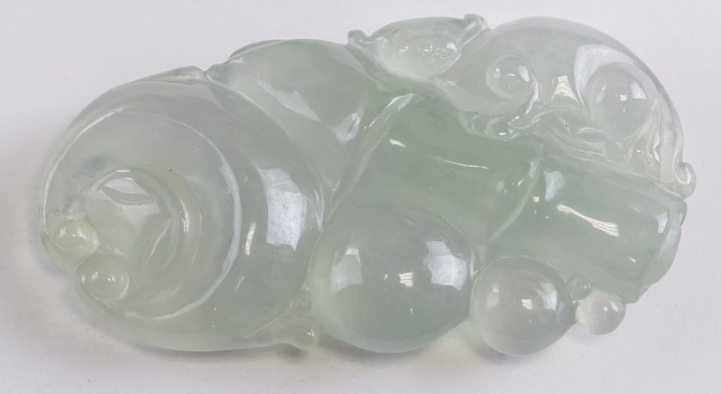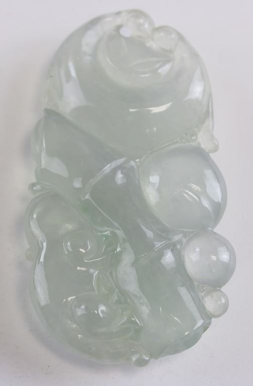 Chinese jadeite carved pendant. Featuring bamboo and lingzhi fungus. Of translucent white tone. 6 x 3 cm. 22 grams. Density: 3.32
