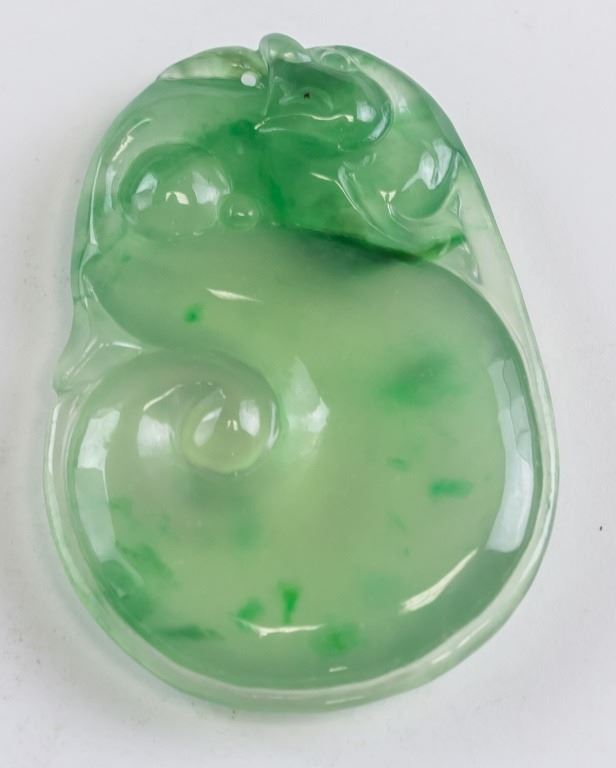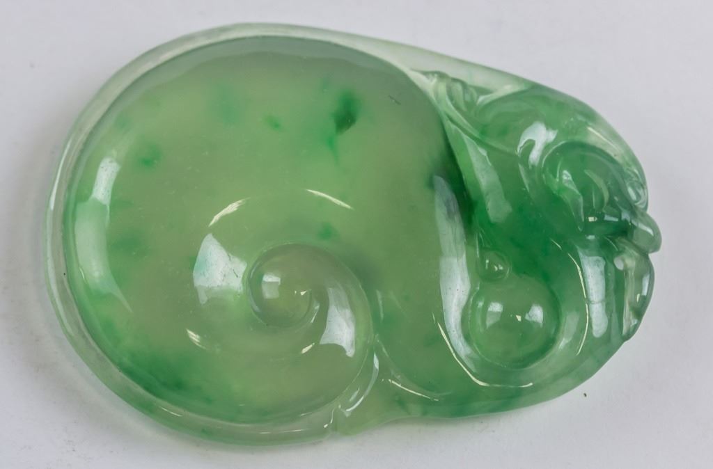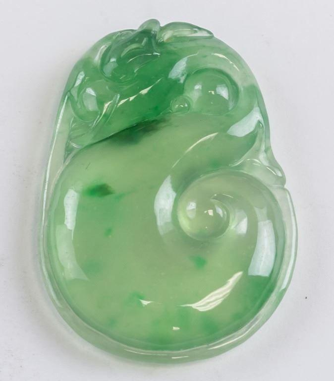 Chinese jadeite carved pendent. Of transparent green tone. Carved in an S shape. 5 x 3 cm 23 grams.