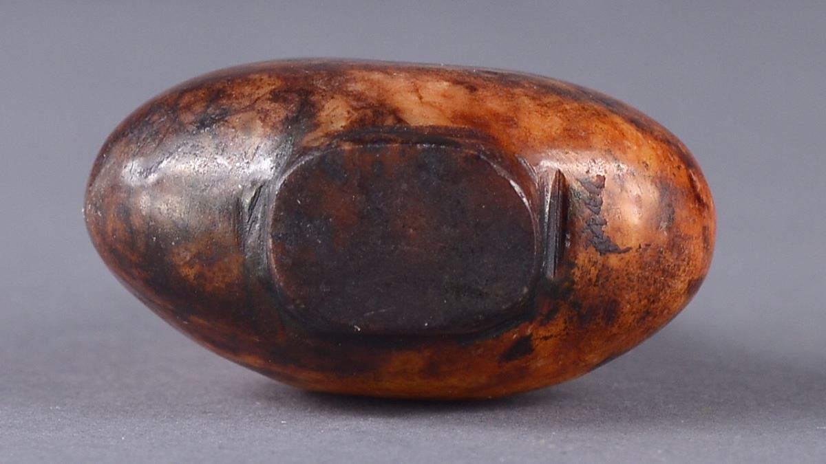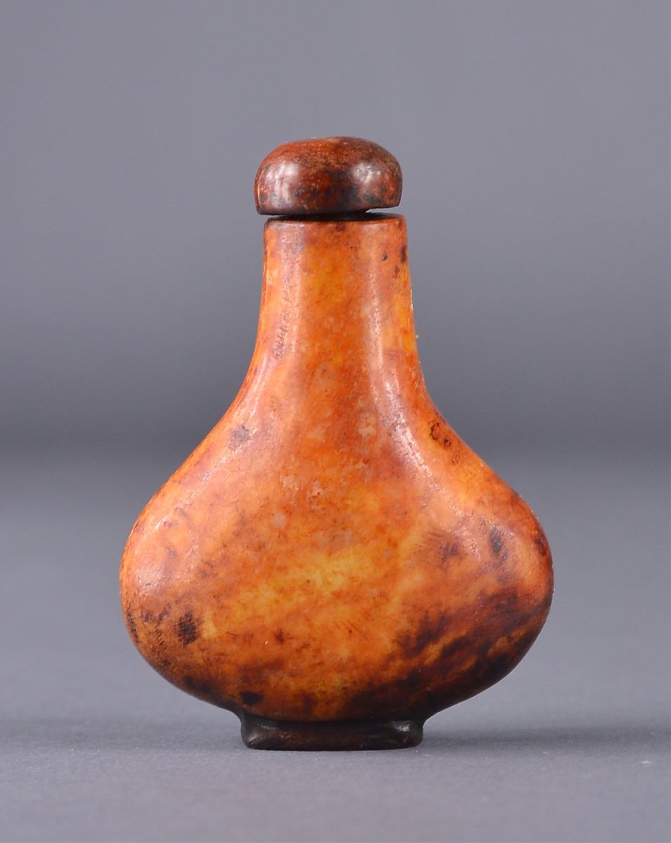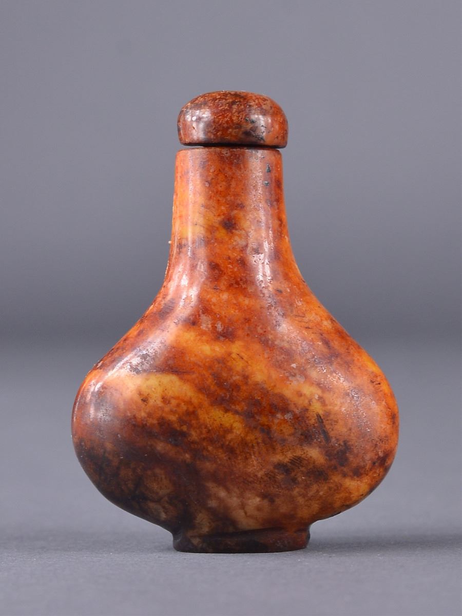 Well hollowed Chinese carved jasper snuff bottle; tapering body, supported on short foot rim; the stone of rich red and white tone; H: 6.25 cm, W: 4.25 cm, 63 grams