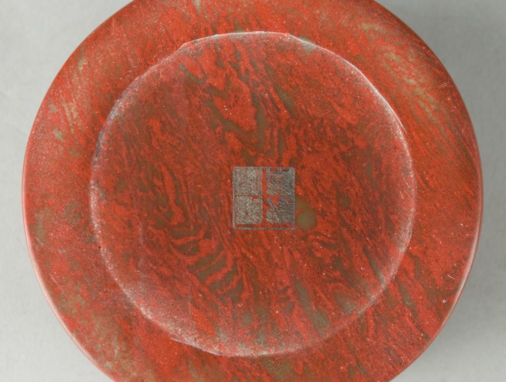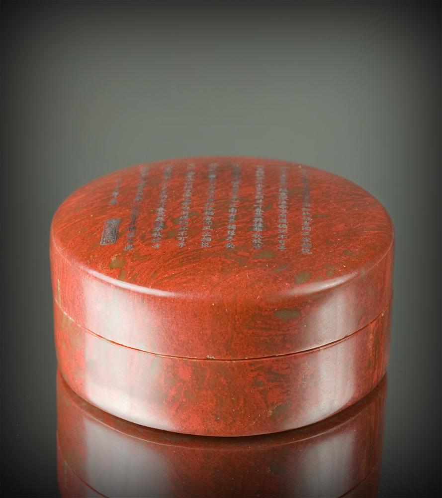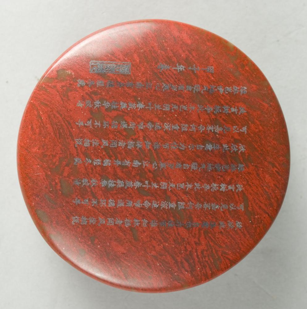Circular ink box in jixueshi stone with dominant red-stain marble. Calligraphy poem on cover, and four character mark within a square on underside. 1.5" H x 3 & 1/8" Dia. 19th/20th Century.