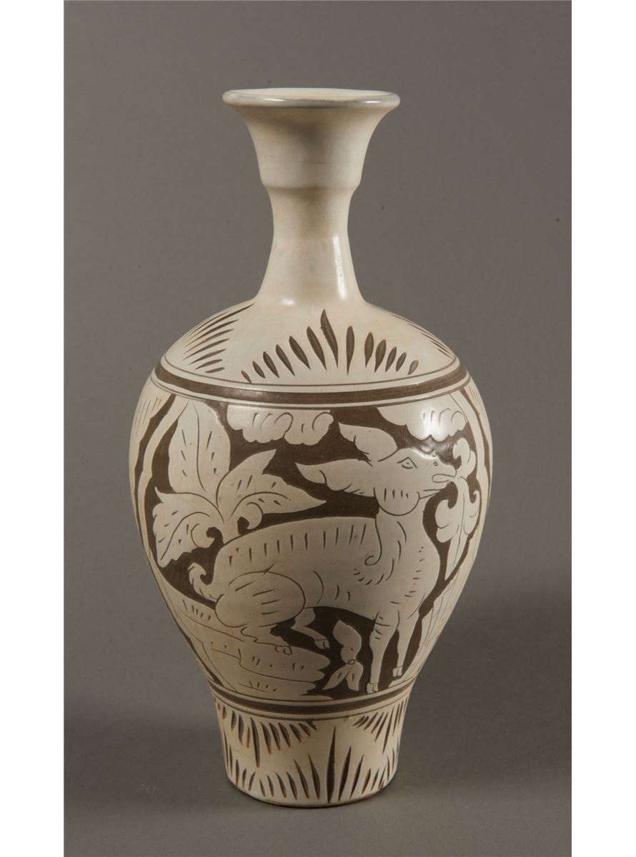Chinese Jun style pottery vase, the baluster body extended to a narrowed neck with flaring rims and decorated with two panels of deer and goose. H: 32.5 cm, D: 16 cm, 1334 grams.