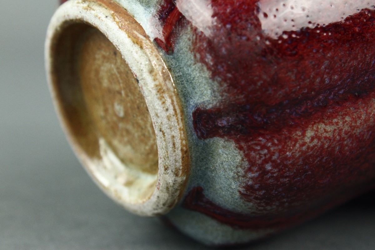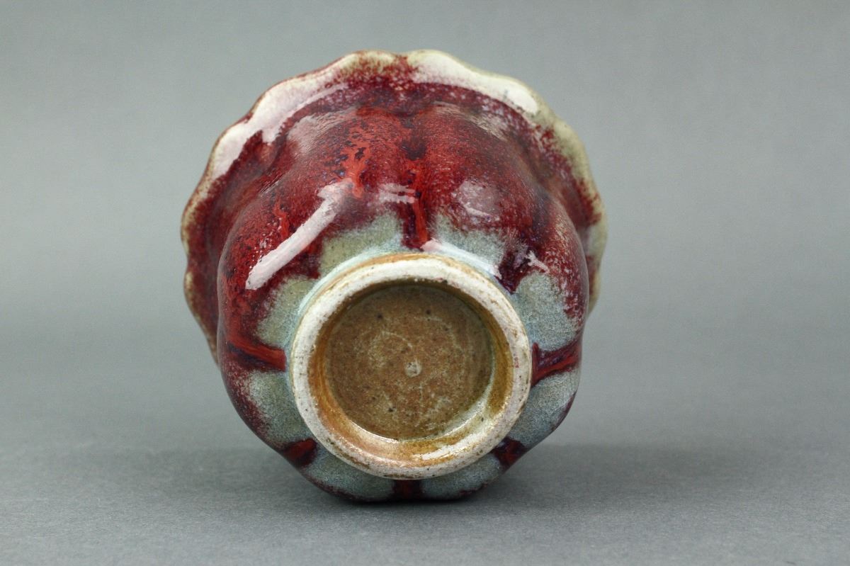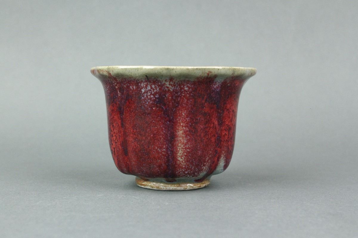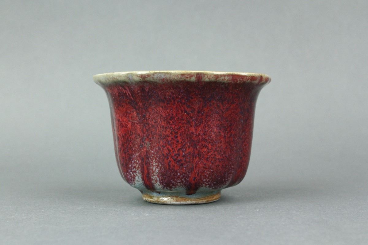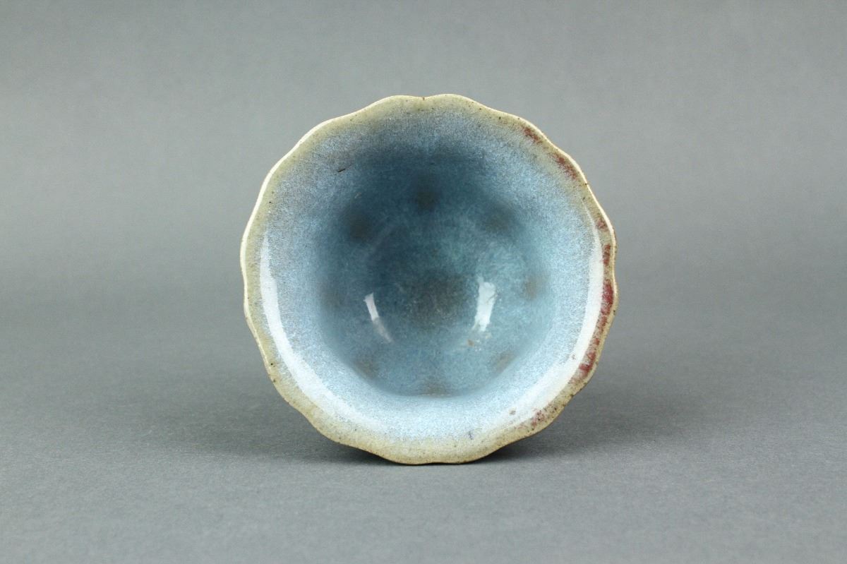 Chinese Junyao porcelain tea cup; of foliated sides with short foot rim; applied with sky-blue glaze on the interior and crimson glaze on the exterior; H: 6.5 cm, D: 11 cm, 205 grams