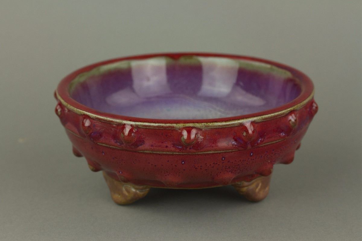 Chinese Junyao glazed flambe porcelain censer; of shallow circular form supported on three ruyi-shaped feet; decorated to the exterior with a band of bosses; applied with thick red glaze mottled with crimson flecks; one-character "Jiu" (meaning number nine) mark on base; H: 6 cm, D: 13.5 cm, 500 grams