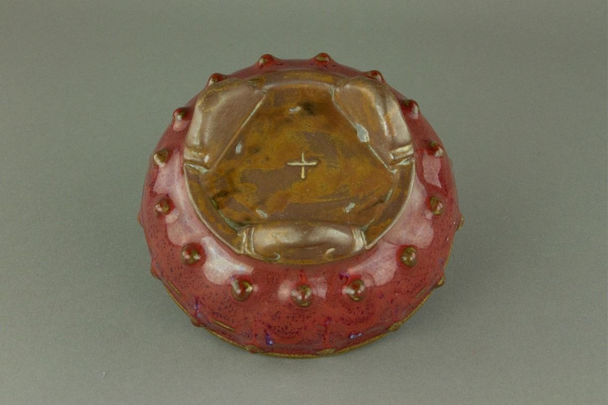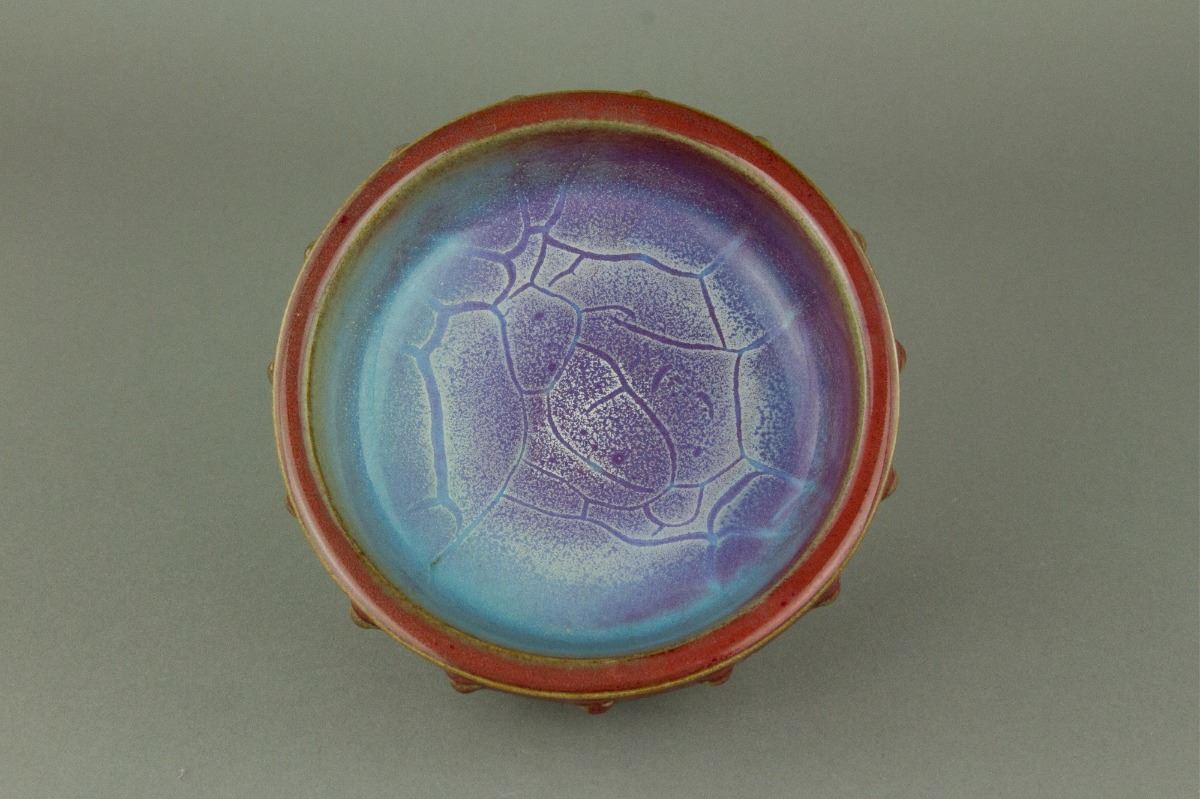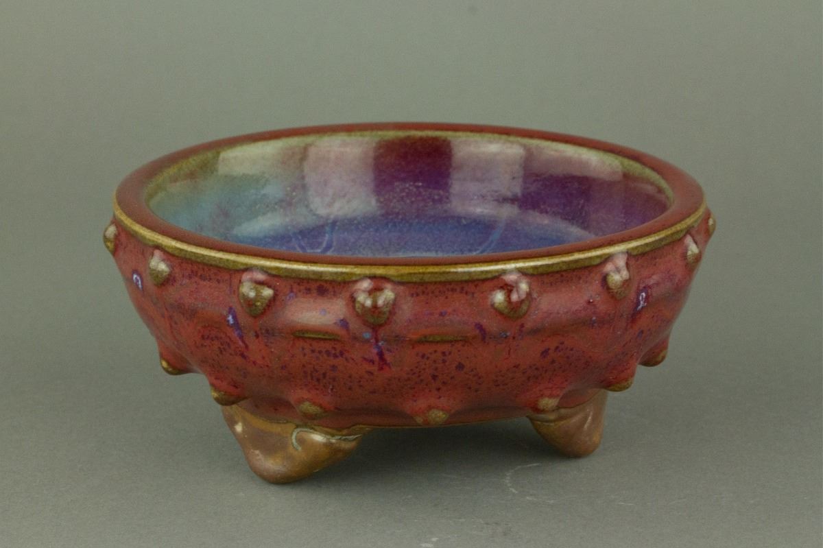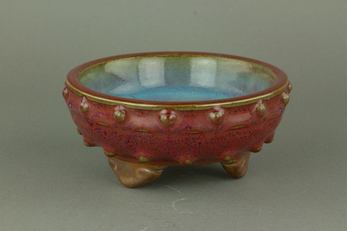 Chinese Junyao porcelain censer; of shallow rounded sides supported on three ruyi-shaped feet; decorated to the exterior with a band of bosses; applied with thick red glaze mottled with crimson flecks; one-character Shi (meaning number ten) mark on base; H: 5.5 cm, L: 12 cm, 466 grams