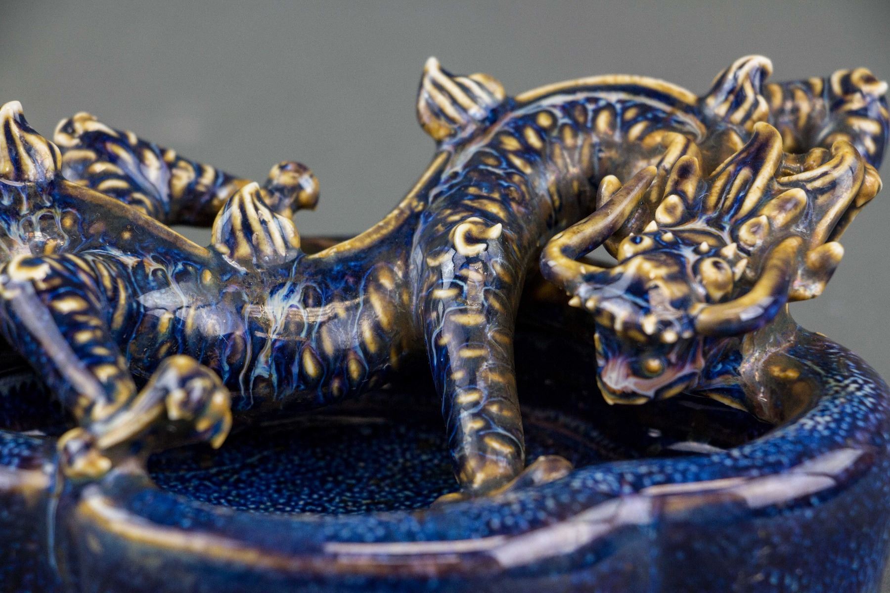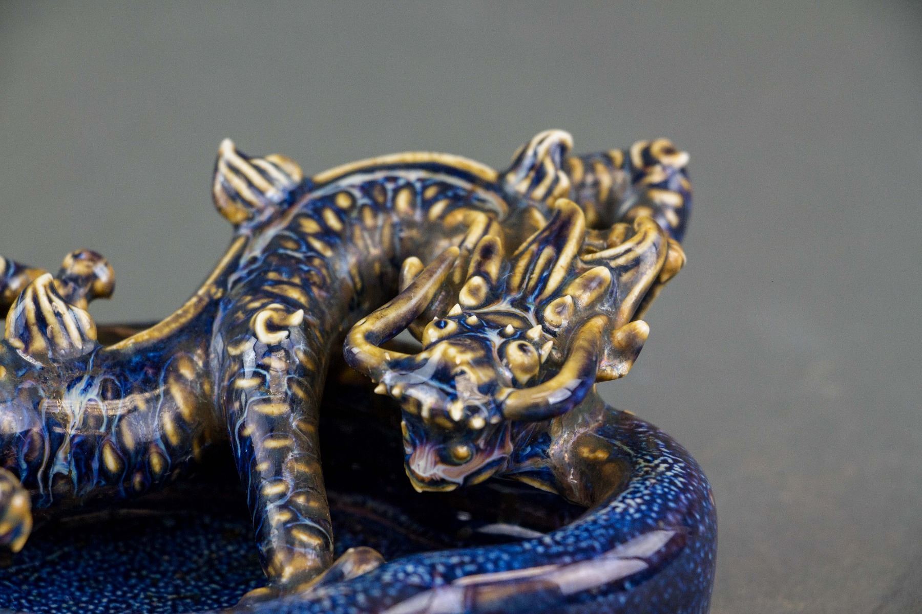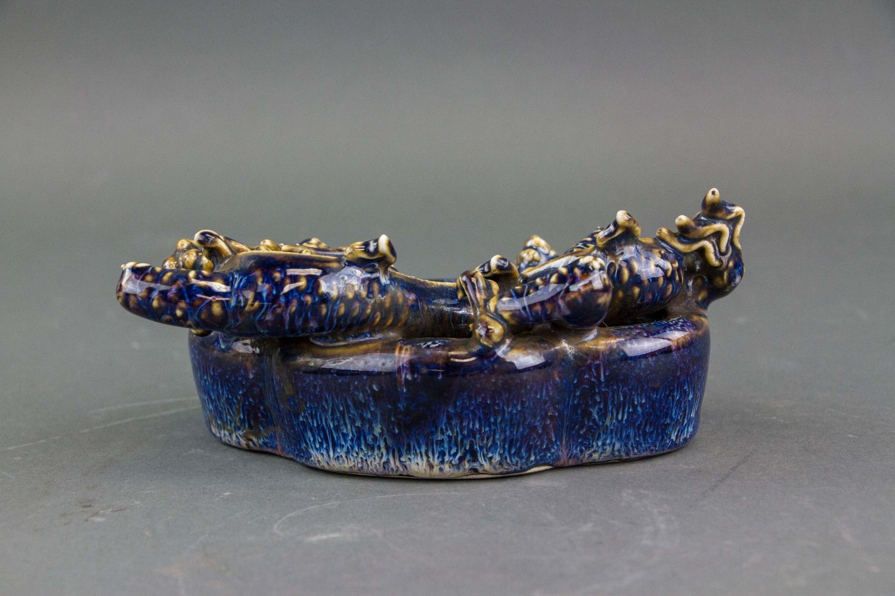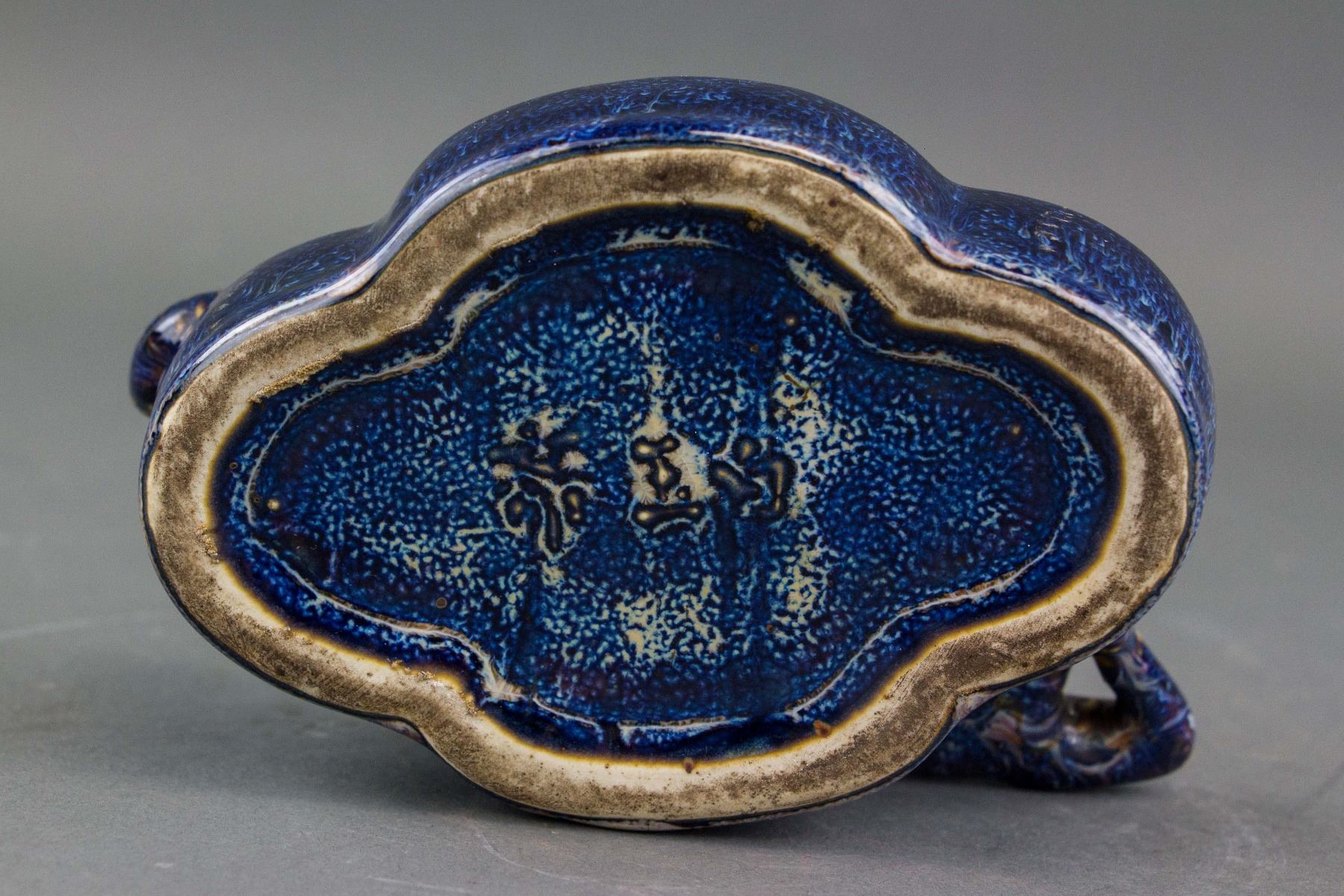 Chinese Junyao porcelain water pot; of ovoid form body with carved dragon; covered with blue flambe glaze; three-character Bai Yu Zhai mark on base; 7 cm x 14 cm, 559 grams