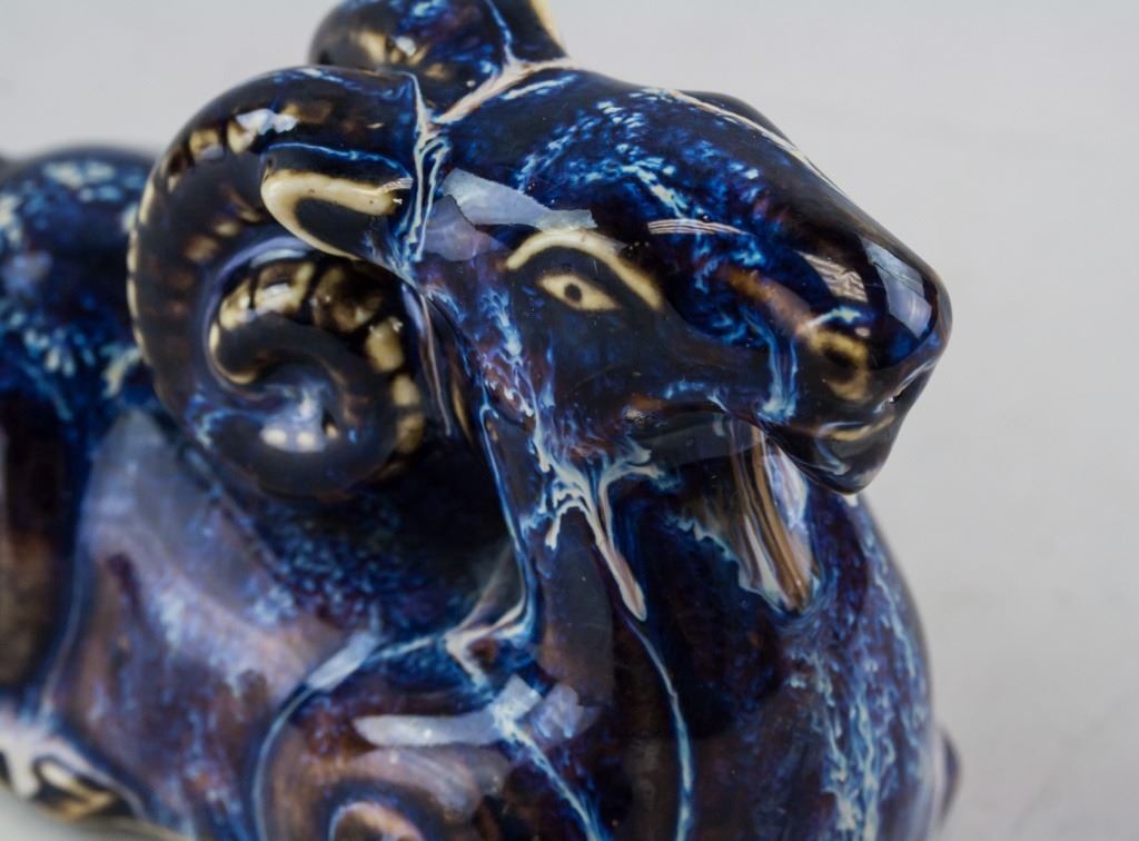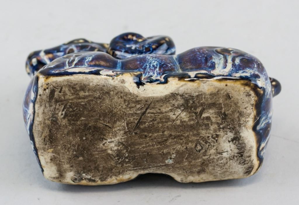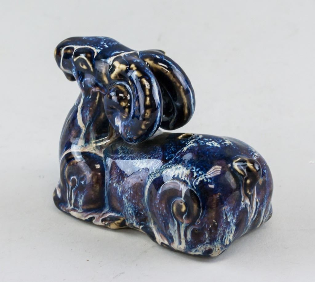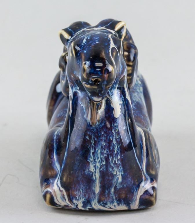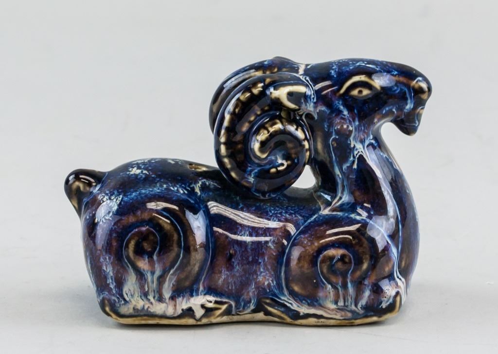 Chinese Junyao style porcelain statue. Featuring a crouched ram. Covered by flambe glaze. 9 x 11 cm, 254 grams