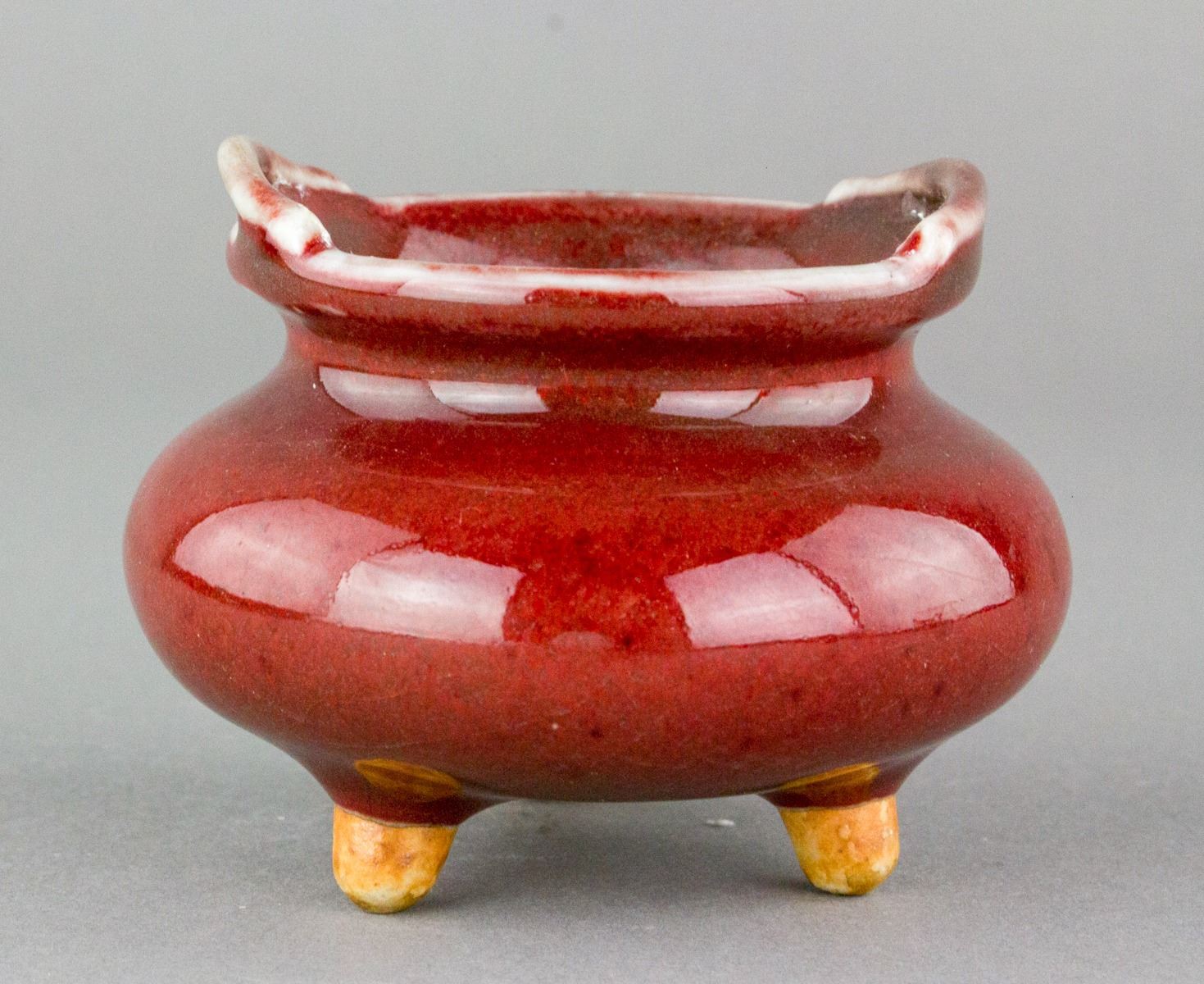 Chinese Junyao type porcelain censer; of compressed globular body supported by three feet; the mouthrim surmounted by double loop handles; applied with thick glaze of vivid crimson tone; H: 5 cm, D: 7 cm, 134 grams