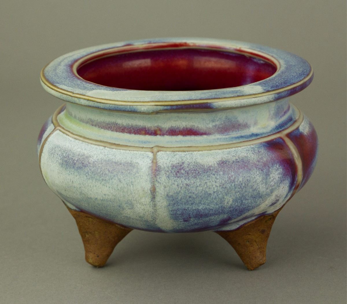 Chinese Junyao porcelain censer; Yuan or Ming style; of compressed globular body with galleried rim and on three short feet; covered in mixed glaze of sky-blue and purple tone; H: 7.7 cm, D: 11 cm, 325 grams