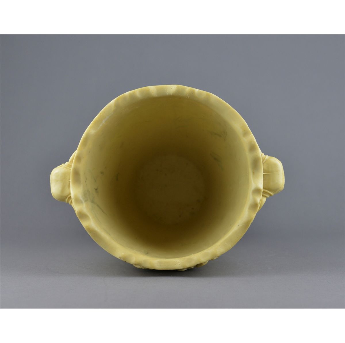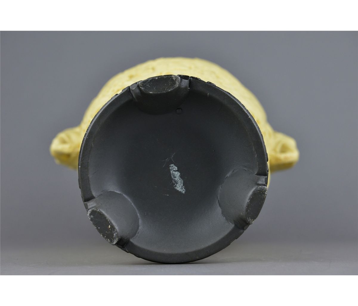 Chinese lacquer carved vase; featuring continuous landscape scene of sages and attendants with village hamlets in the distance in relief; near the mouth featuring elephant head handles; H: 30 cm, L: 25 cm, 3968 grams, wood base; Provenance: Ma Collection, Ottawa