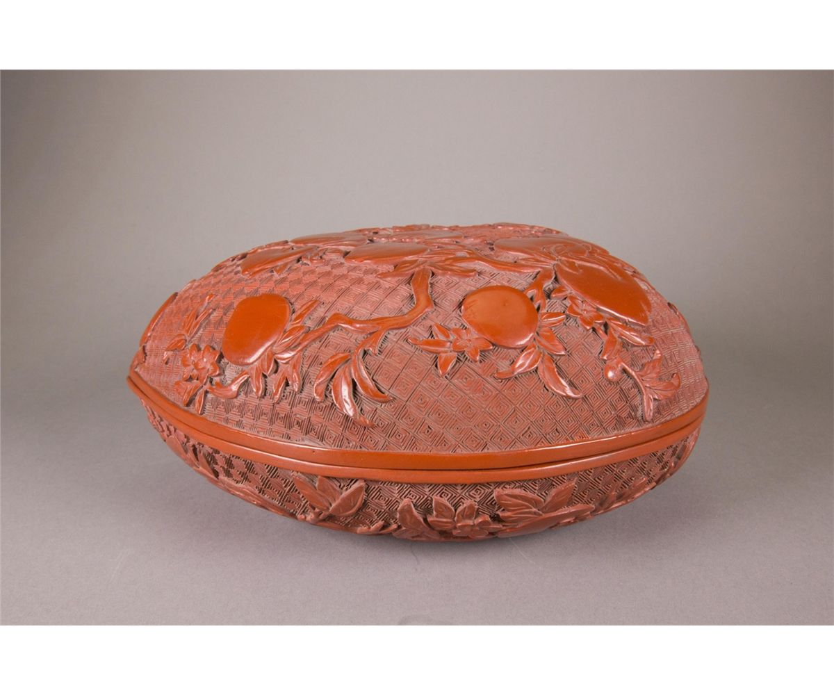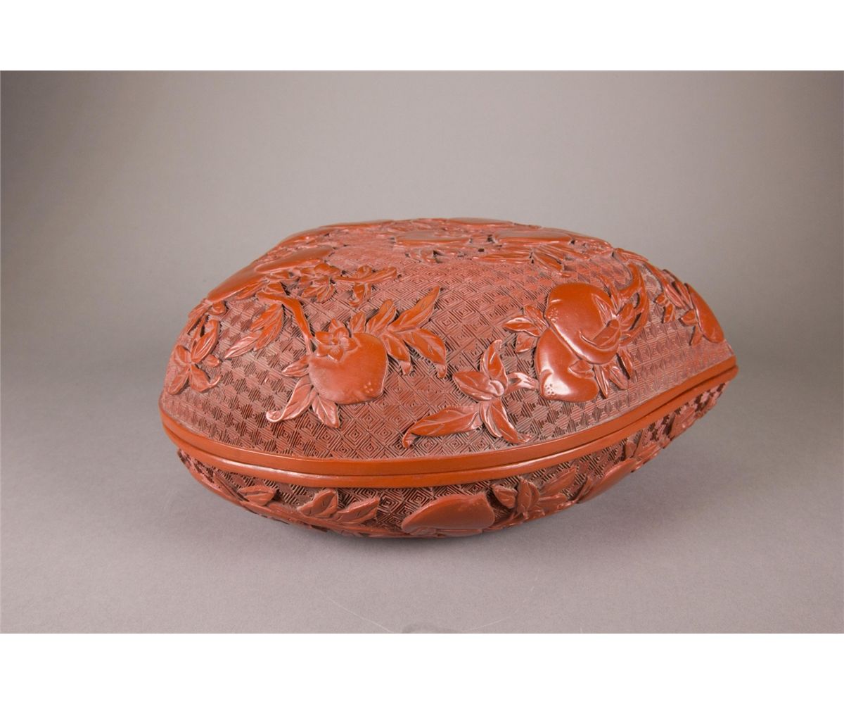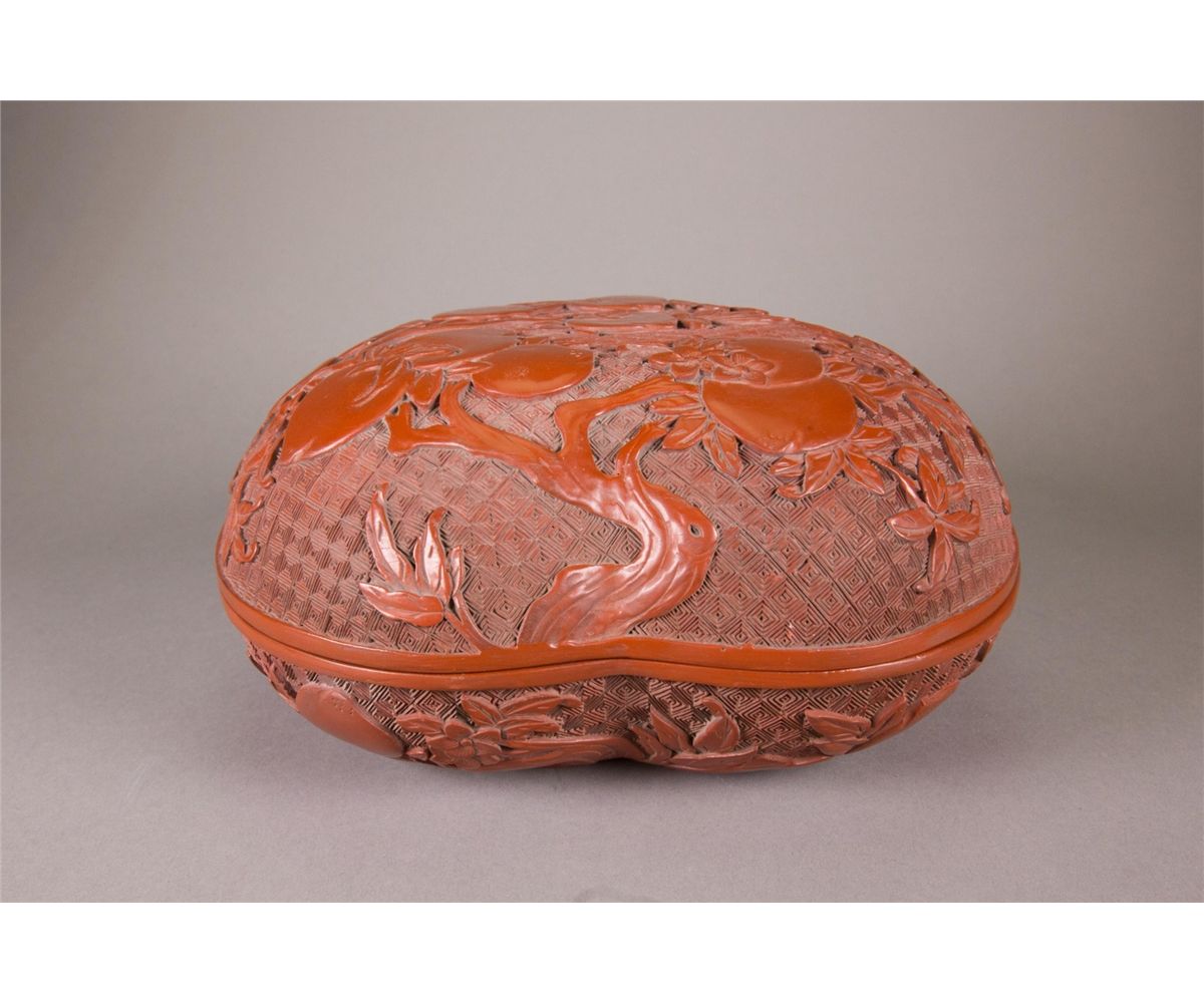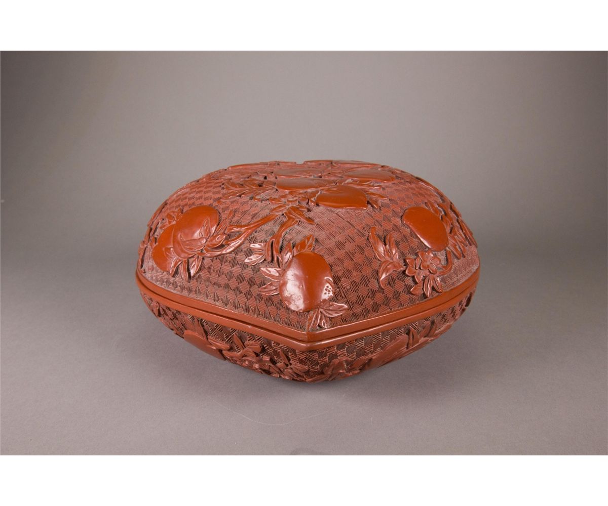 Chinese red lacquer box with cover; of peach shape; featuring peach tree branches in low-relief; six-character Qianlong mark on base; H: 12 cm, W: 23 cm, 1258 grams