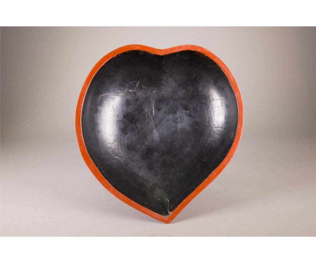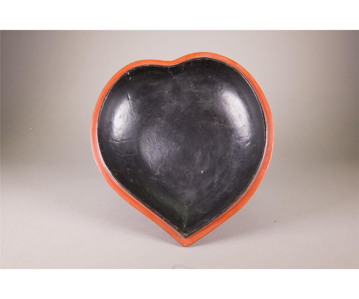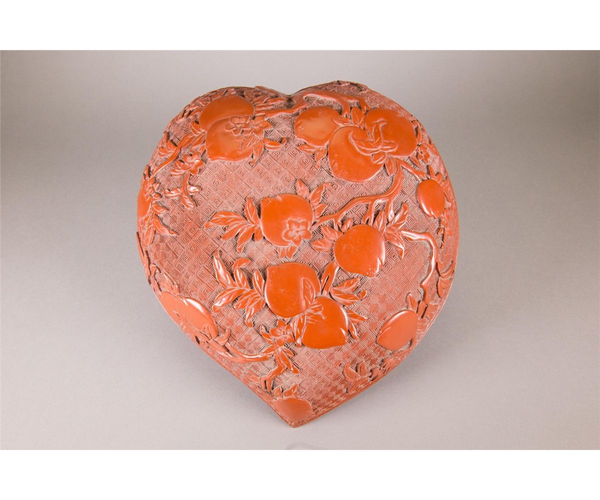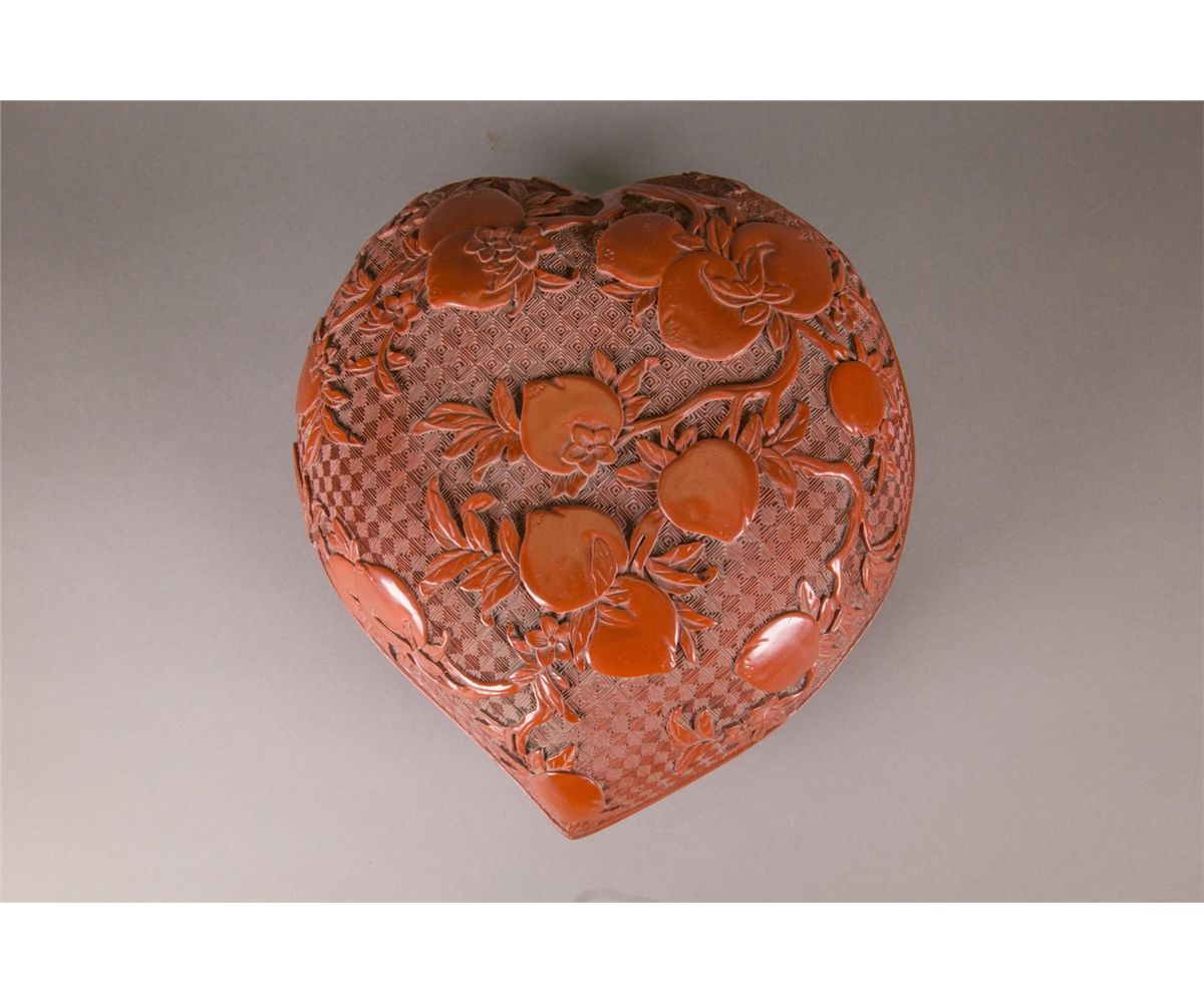 Chinese red lacquer box with cover; of peach shape; featuring peach tree branches in low-relief; six-character Qianlong mark on base; H: 12 cm, W: 23 cm, 1258 grams