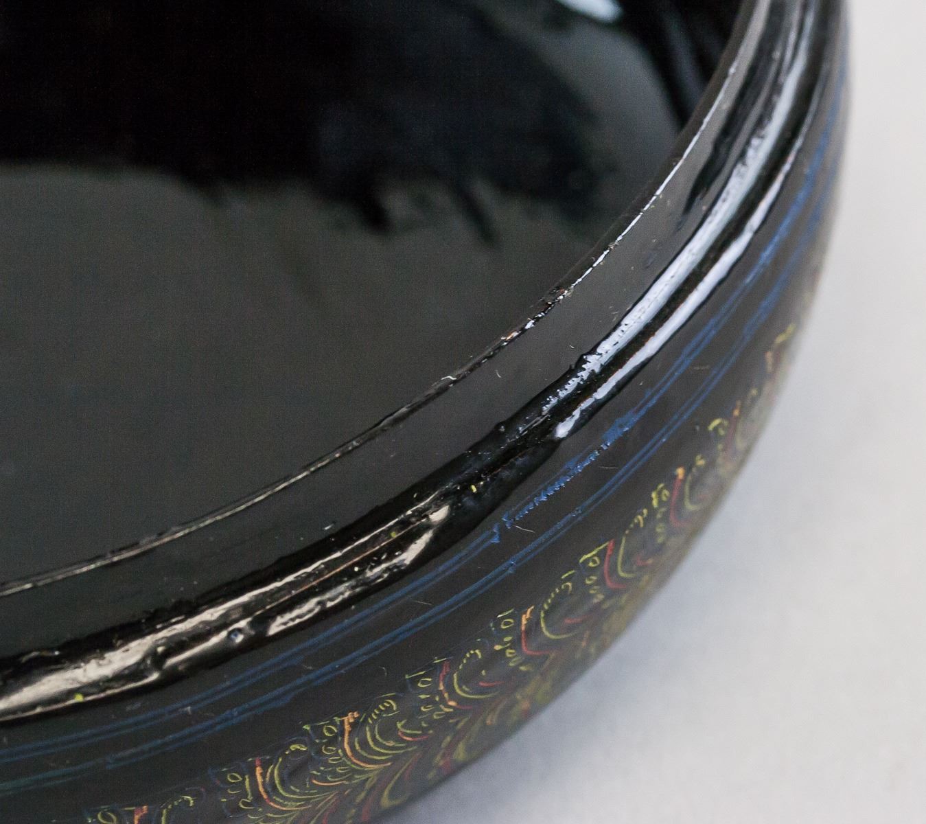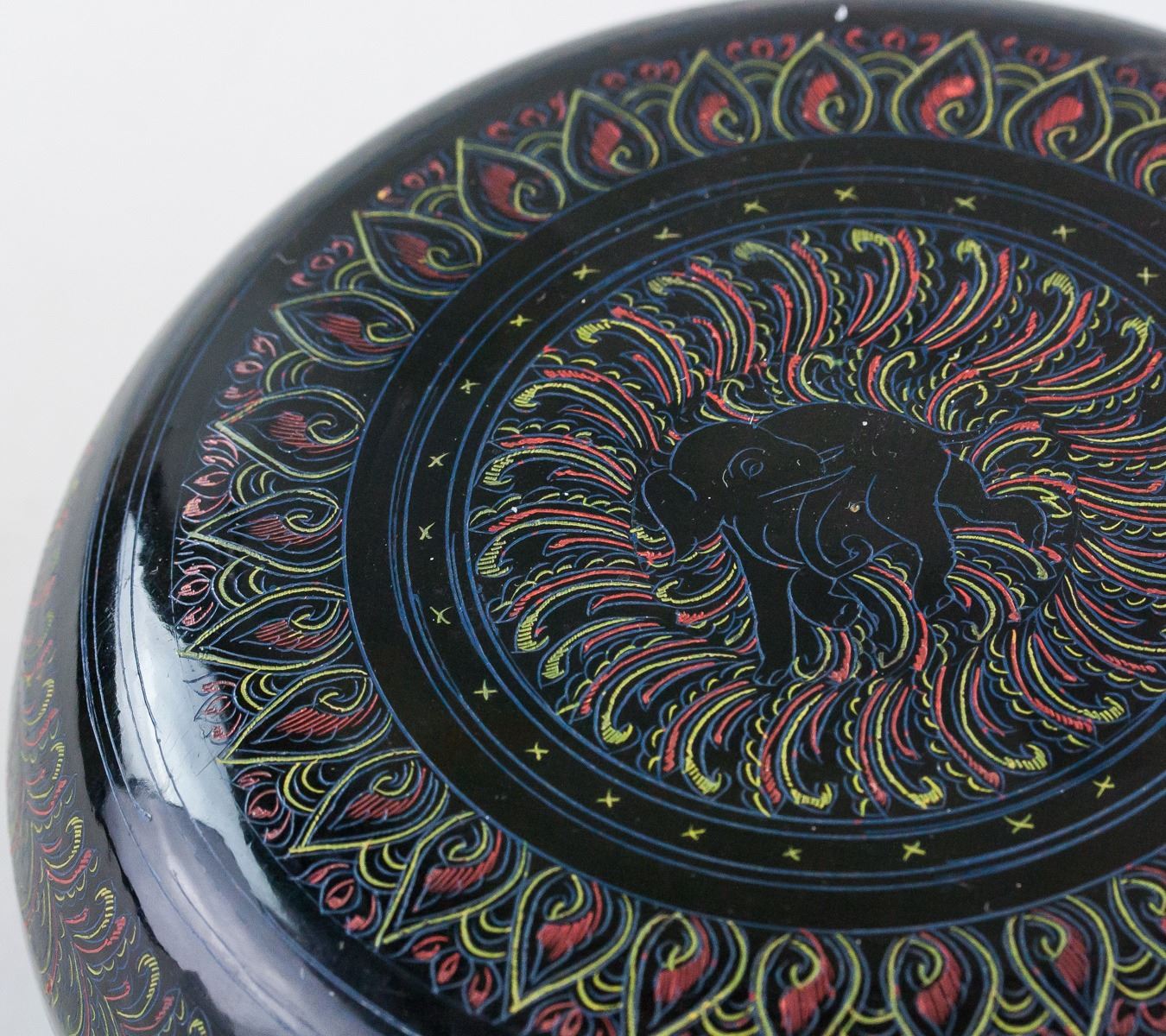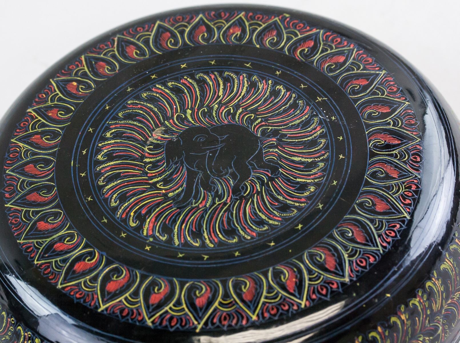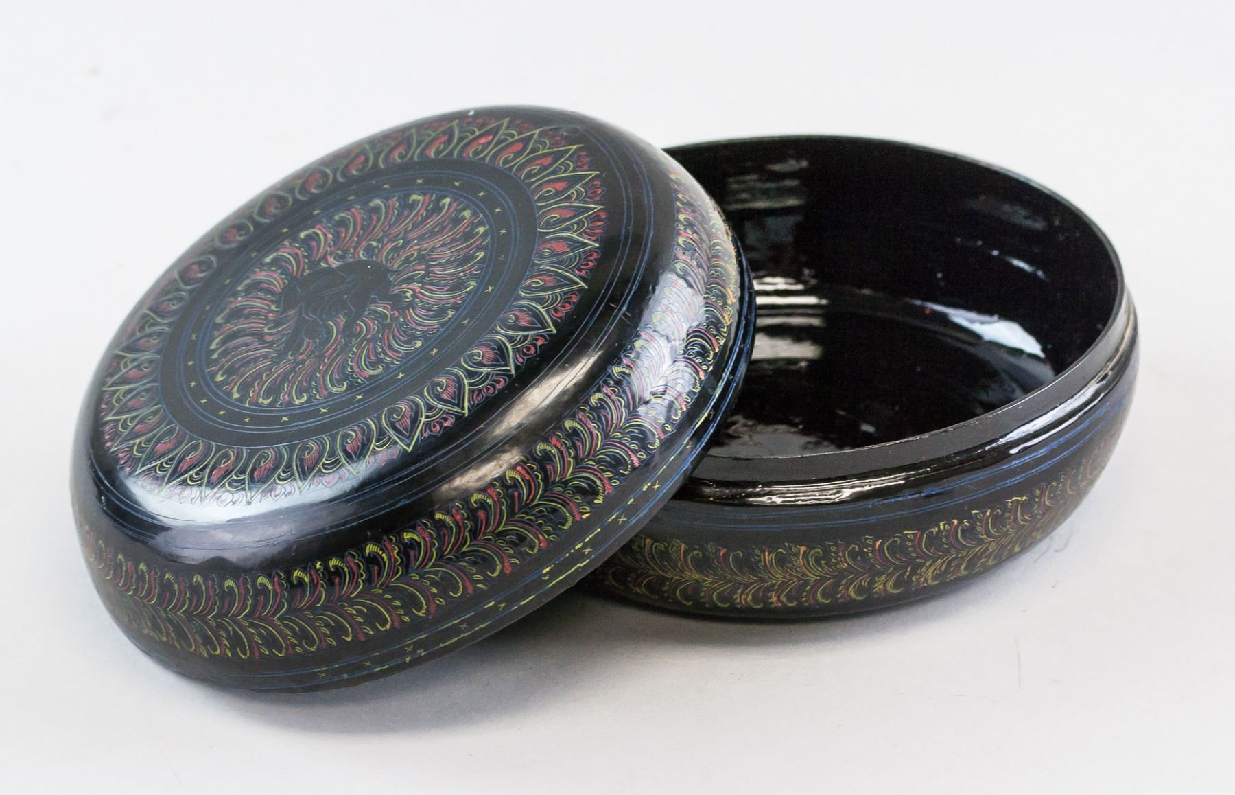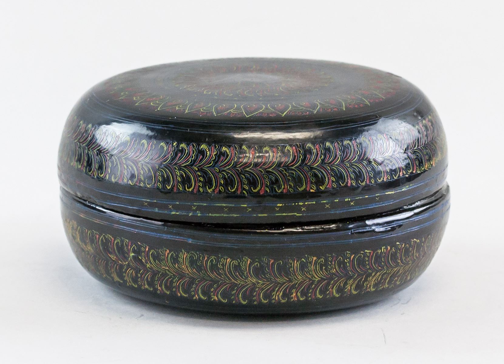Chinese lacquer wood carved case. Of round body with lid. Painted with floral and leafy pattern. 7 x 15 cm, 274 grams