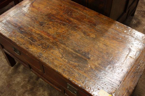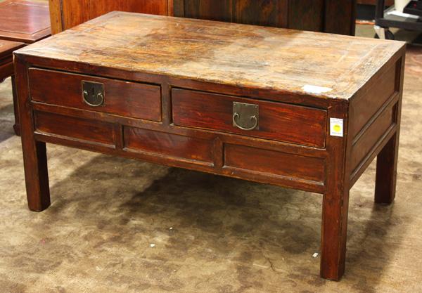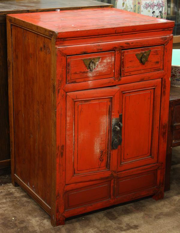 (lot of 2) Chinese red lacquered side cabinet and low table, the first fronted by a pair of drawers above a set of hinged doors accented by metal butterfly-form pulls, 35.75''; the second, a rectangular low table fronted by a row of two drawers fitted with metal pulls and all raised on straight supports, 39.25''