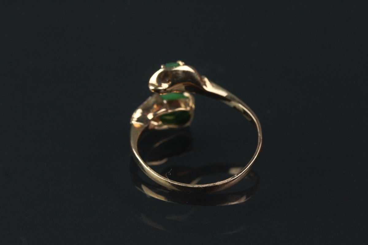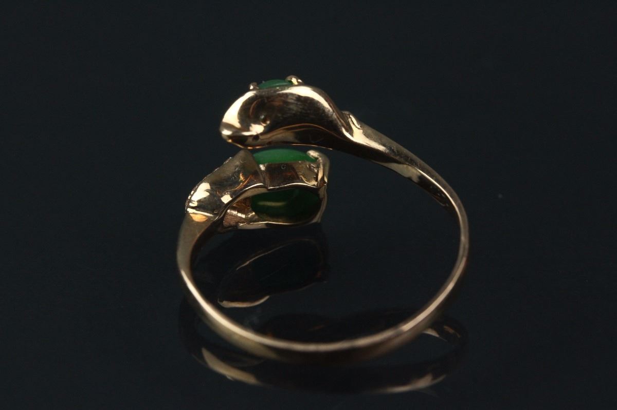 Stunning lady's ring, two oval emerald green jadeite cabochons is accented with diamonds on 18K gold ring mount. D: 1.5 cm, 4 grams.