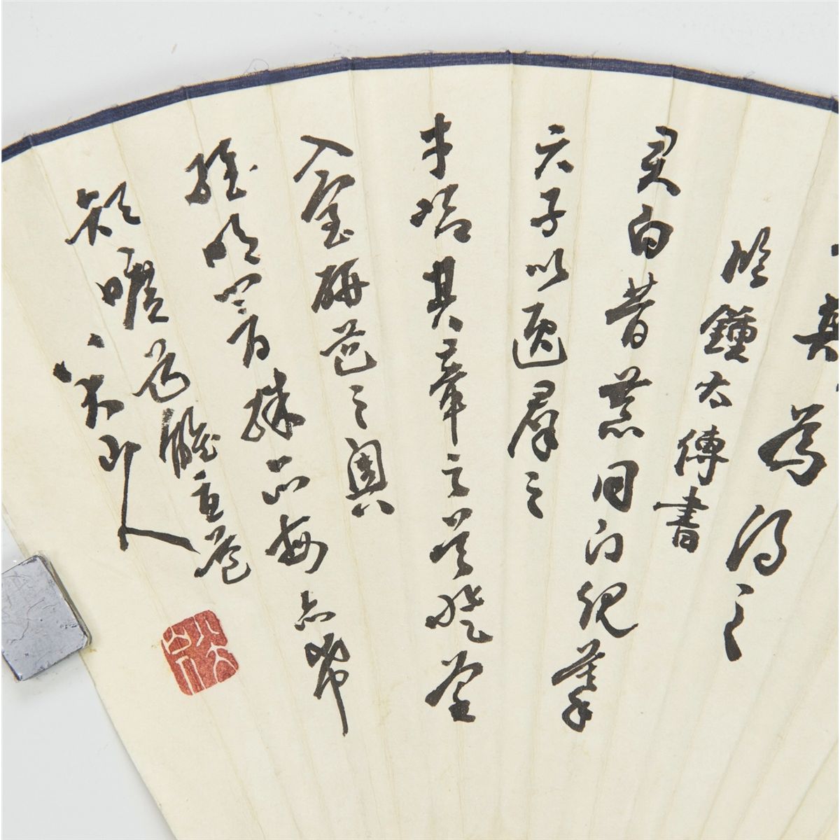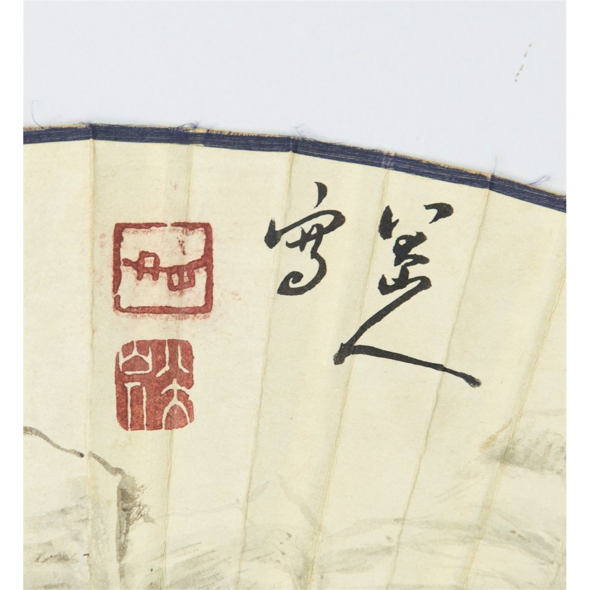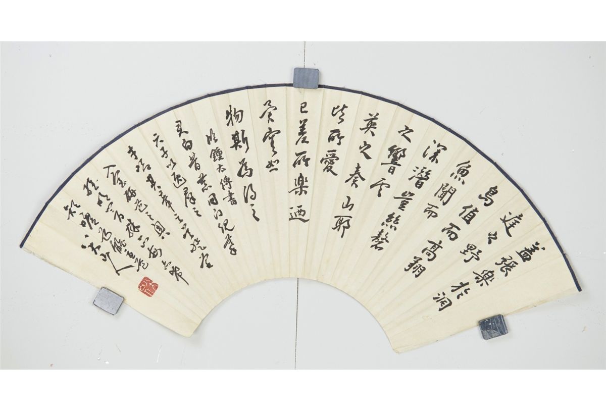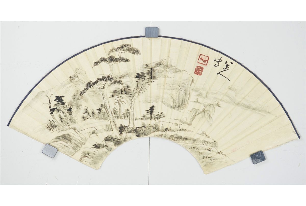 Chinese landscape, Chinese ink and watercolour on fan, signed Bada Shanren (born Zhu Da ca. 1626-1705) with red seals. 23 cm x 54 cm.