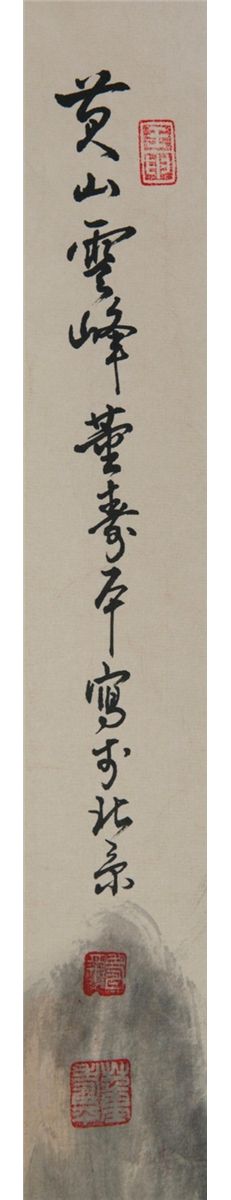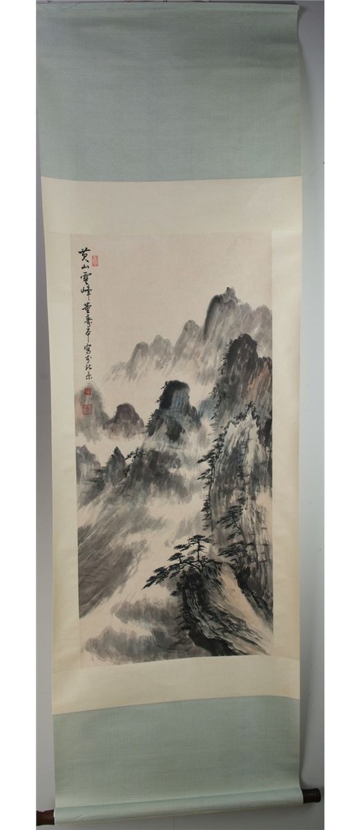 Chinese landscape, hanging scroll, Chinese ink and watercolour on paper, signed and sealed by Dong Shou Ping (1904-1997). 94 cm x 44 cm.