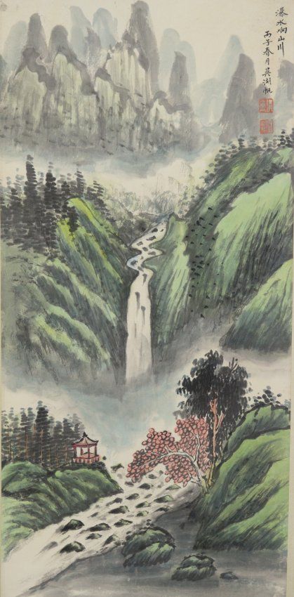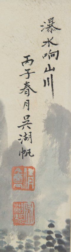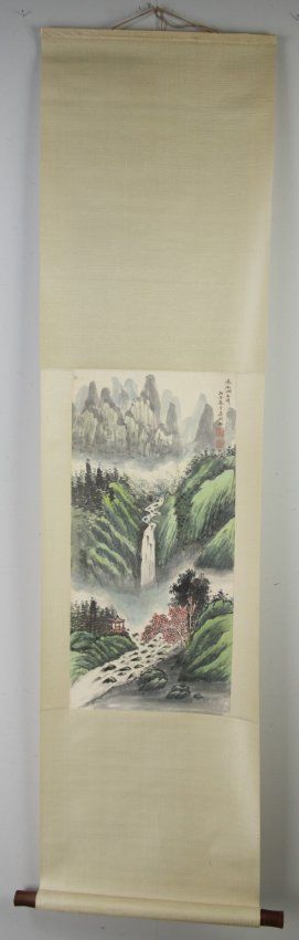 Chinese landscape, hanging scroll, Chinese ink and watercolour on paper, style of Wu Hu Fan (1894 - 1968); 69 cm x 33 cm
